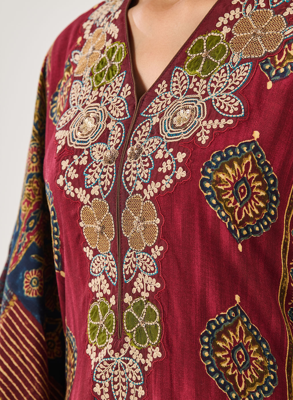 - Dori embroidery with sequin highlights accentuates the V-neckline and sleeves.