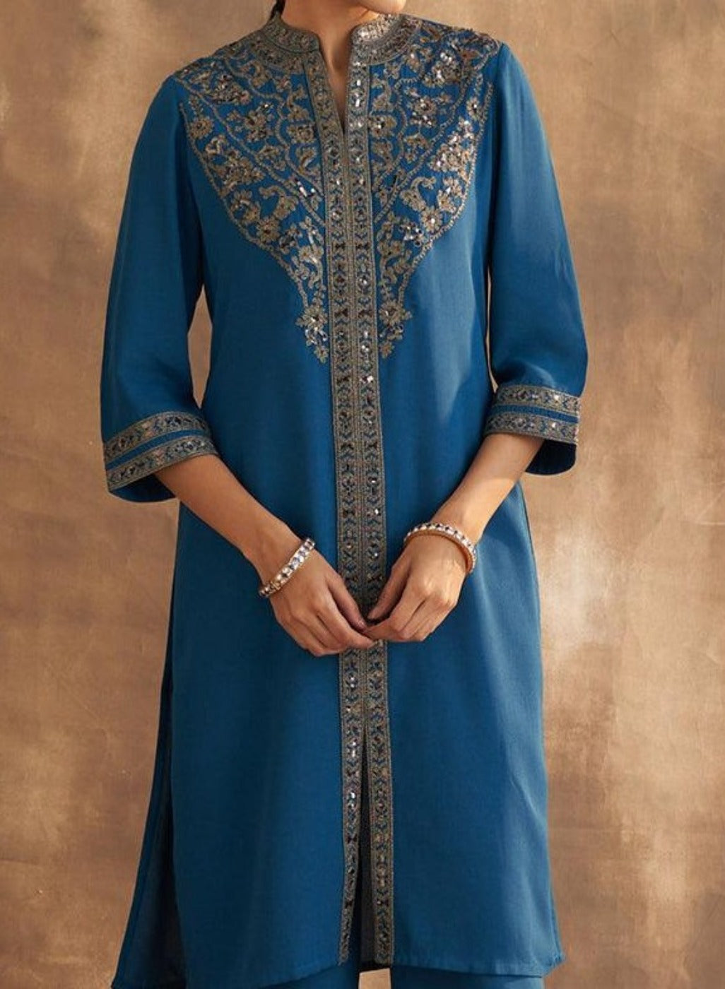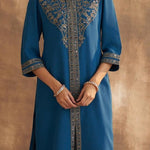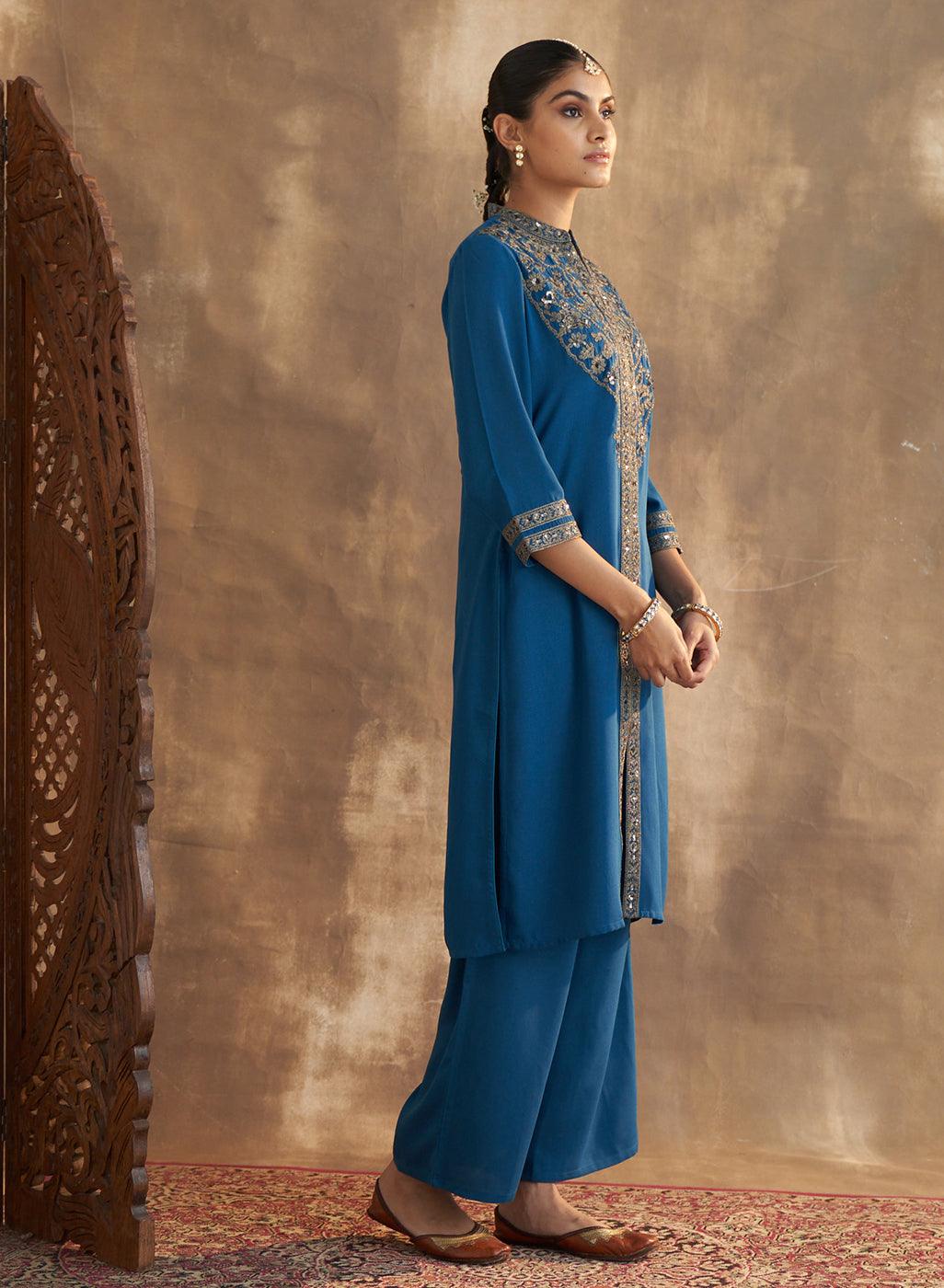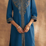 D.Teal Kurta Set With Intricate Embroidery & Front Slit