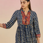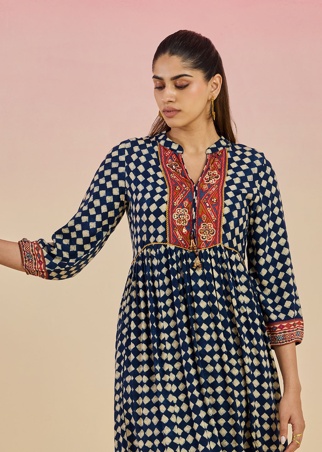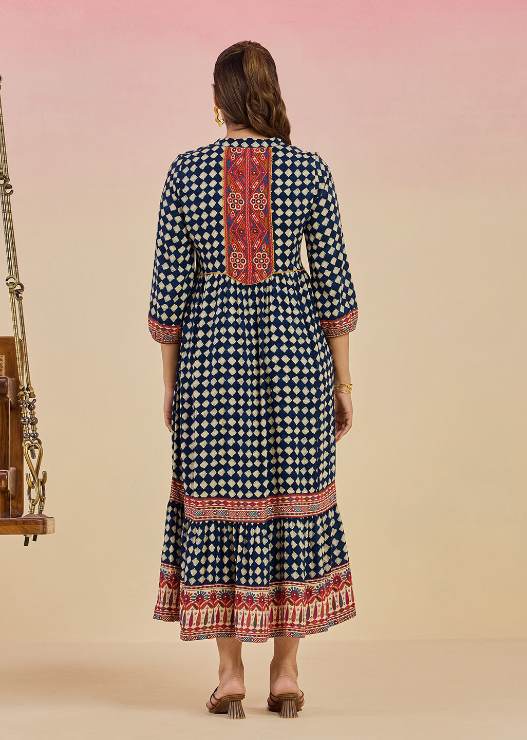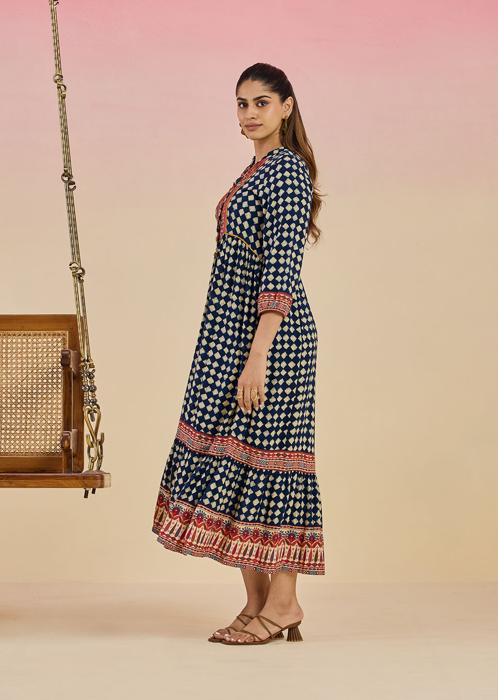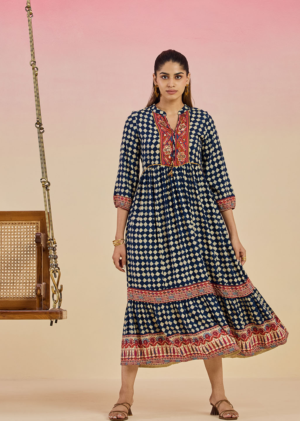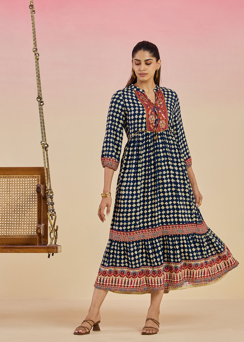 A little boho, a little regal - this midnight blue printed rayon dress is made to make an entrance. The flared tiered silhouette flows beautifully, while the beaded yoke, sequin highlights, and tassel details bring just the right amount of sparkle. Effortlessly stylish, endlessly comfortable, this is your go-to for everything from brunches to festive evenings
