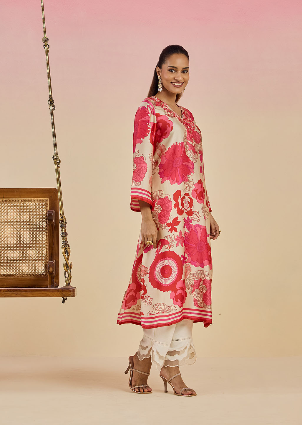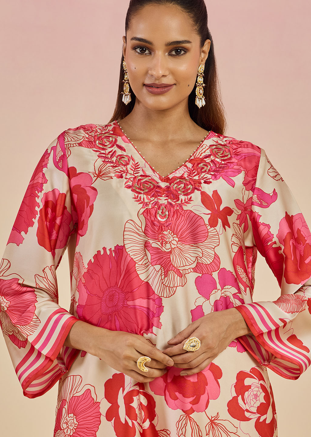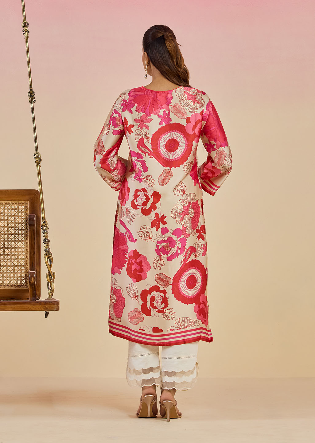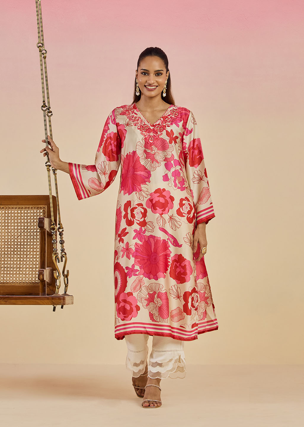 Aurora Dark Pink Floral Printed Satin V-neck Long Kurti