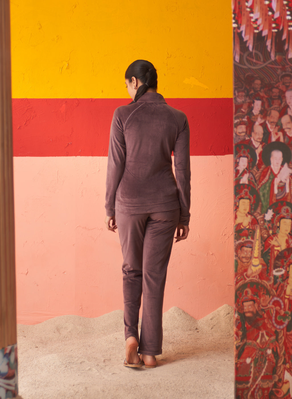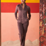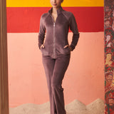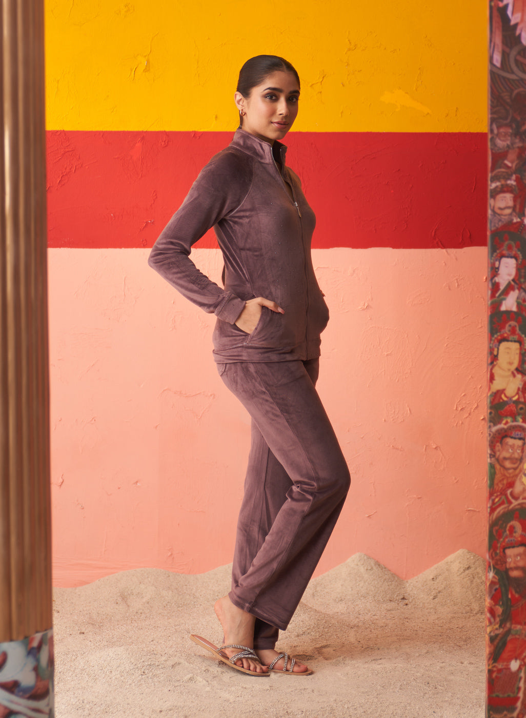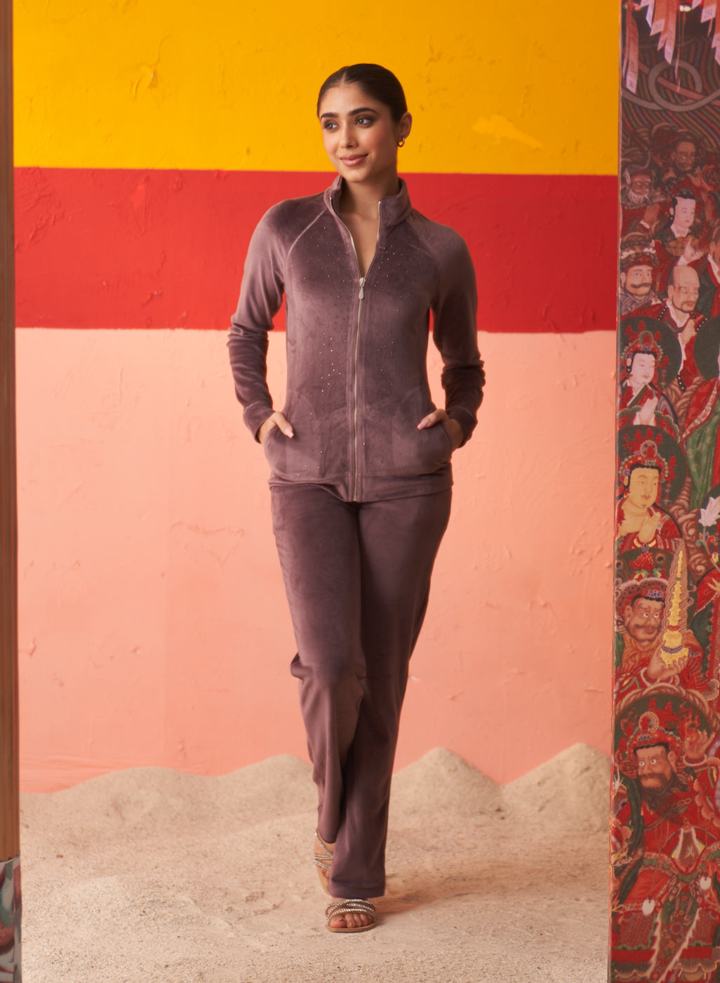 Woman in Dark Purple Velvet Track Suit with Stone Work