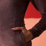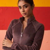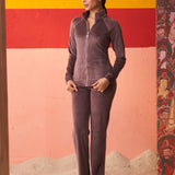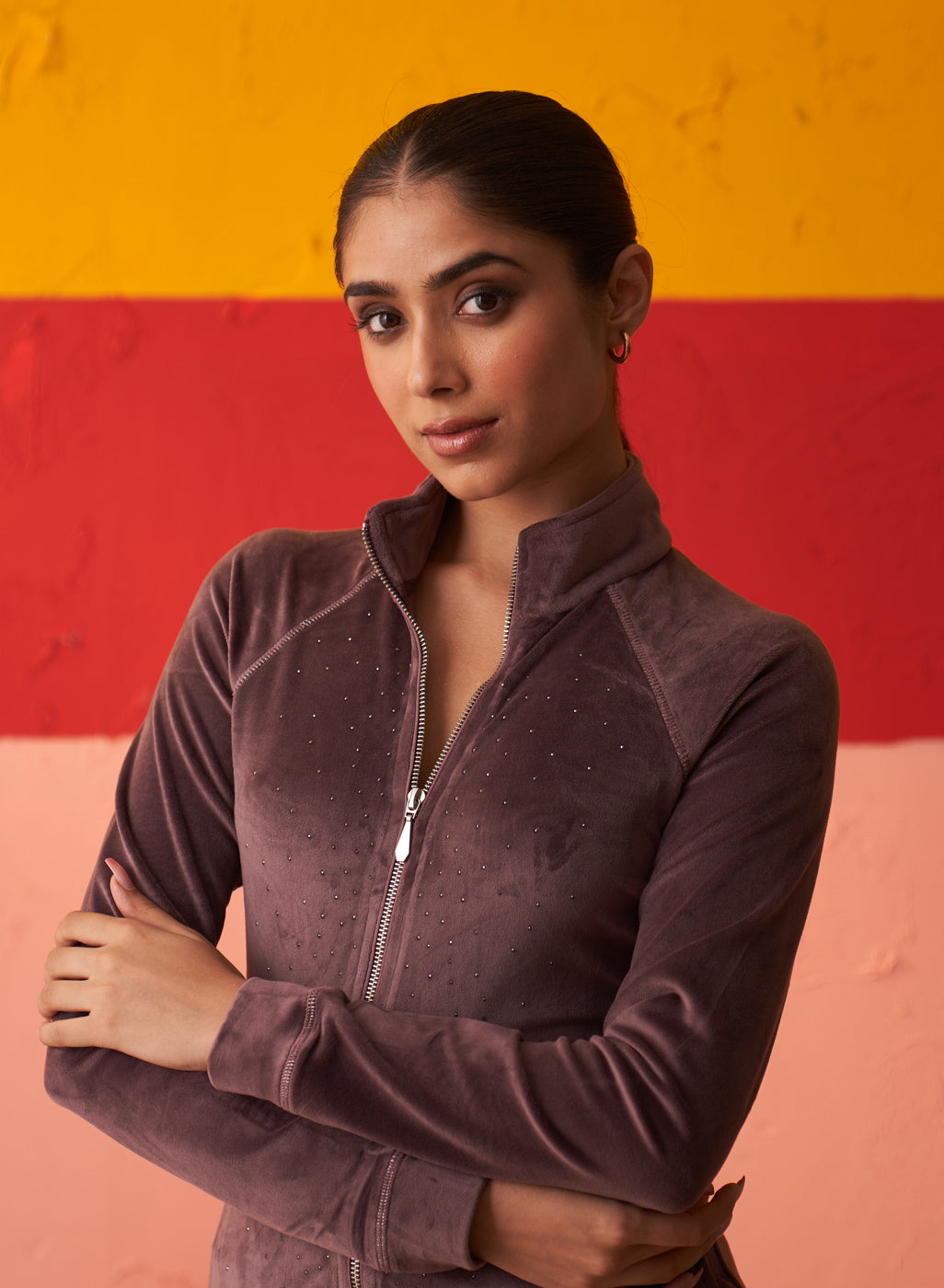 Woman presenting the top of the Dark Purple Velvet Track Suit with Stone Work