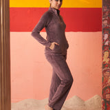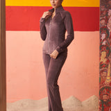 Woman posing in Dark Purple Velvet Track Suit with Stone Work