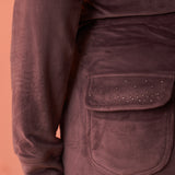 The detail of the stonework in back pocket of Dark Purple Velvet Track Suit