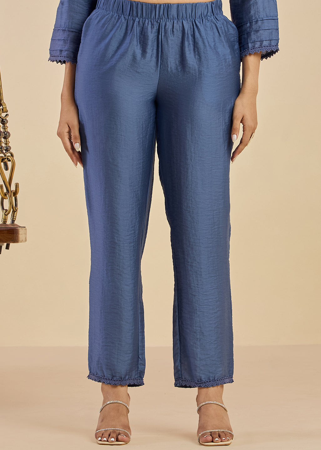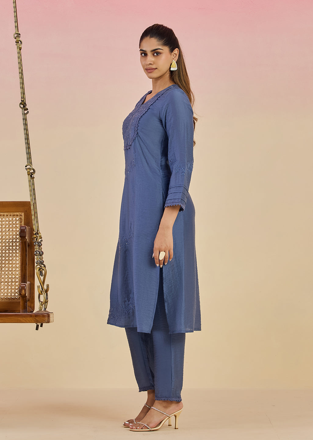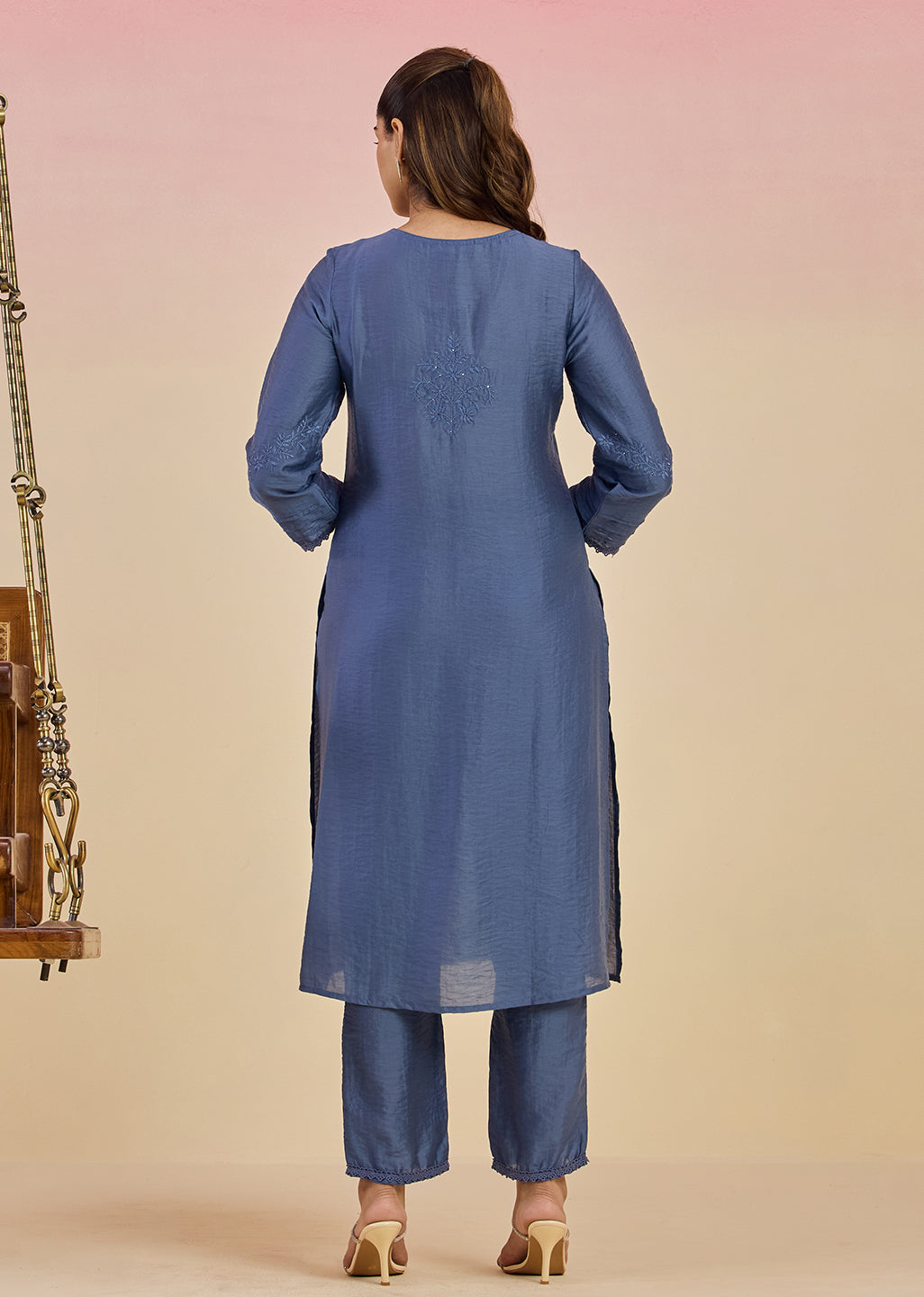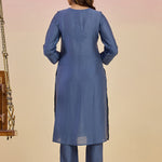A celebration of understated grandeur, this regal blue Co-ord Set is crafted in a luminous viscose satin that moves like a dream. Intricately adorned with tonal threadwork and rhinestone sparkle, the embroidery gently blooms across the front, sleeves, and back. The kurta features detaled accents like scalloped lace around the yoke and pleated cuffs. Paired with straight pants this is a silhouette designed for comfort and worn best when tradition meets ease.
