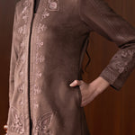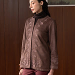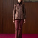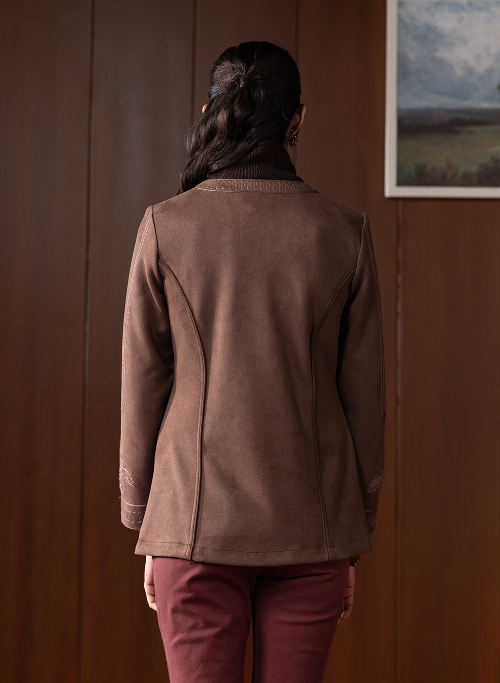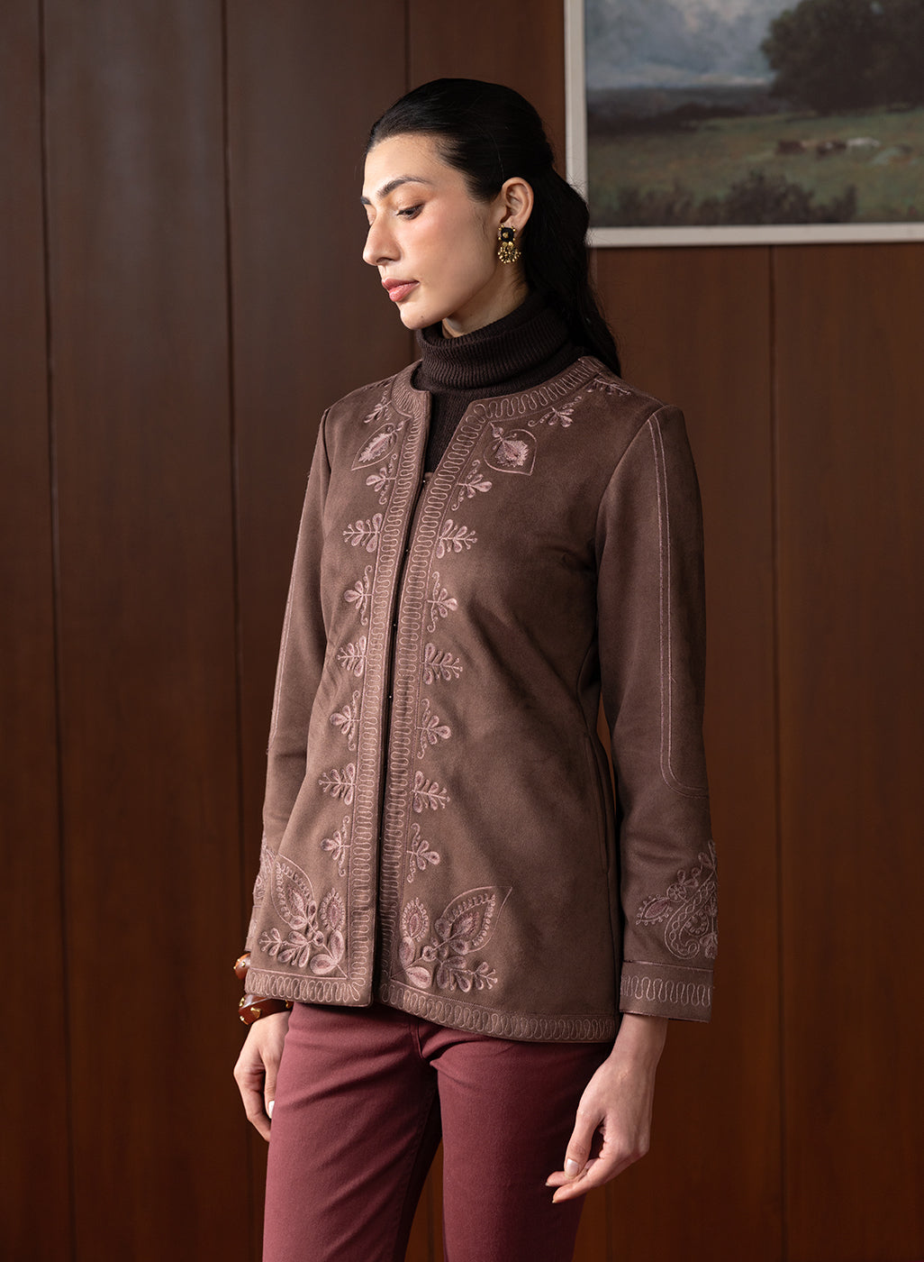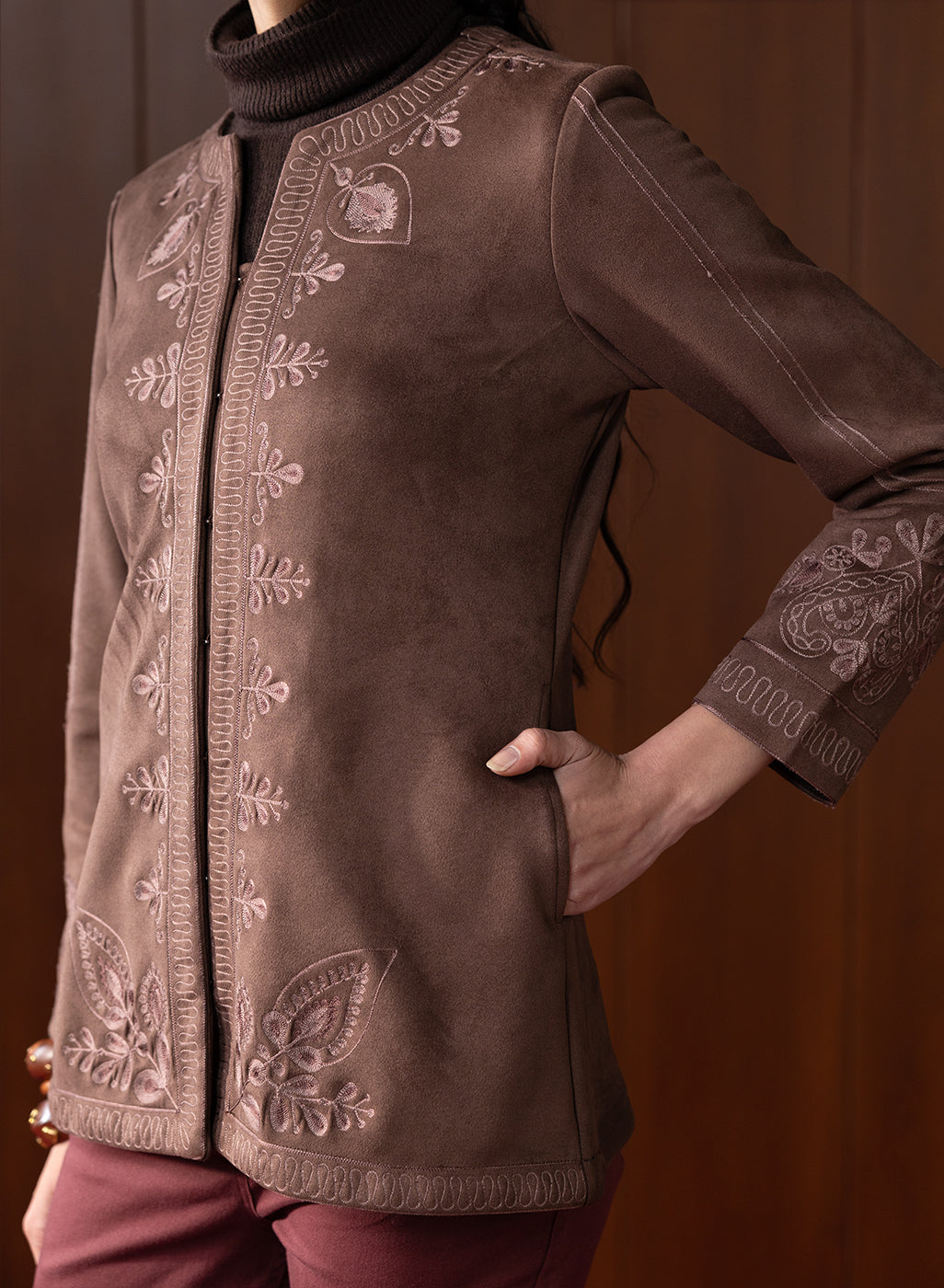 Elegant and timeless, this brown suede jacket blends warmth with refined craftsmanship. The tonal embroidery adds subtle texture, making it an easy pick for elevated everyday wear.