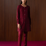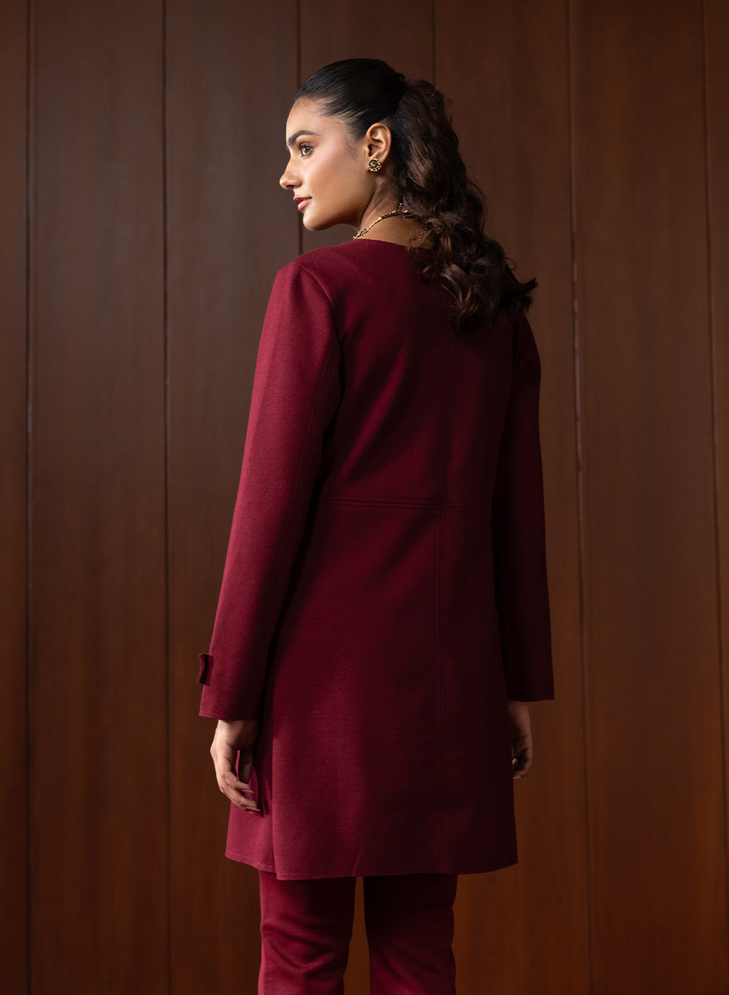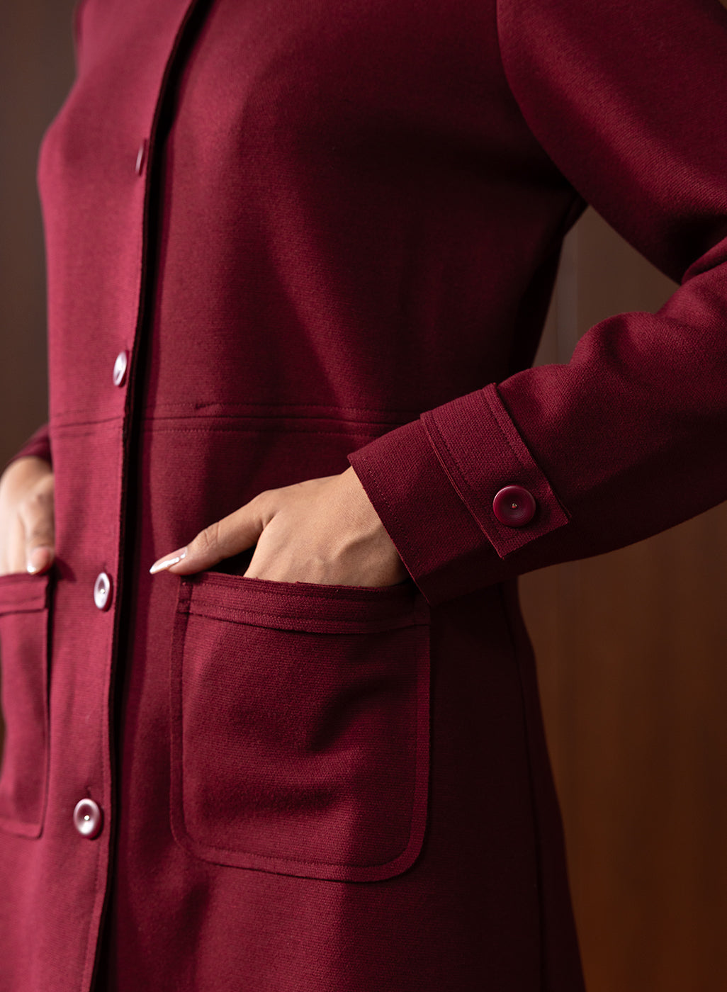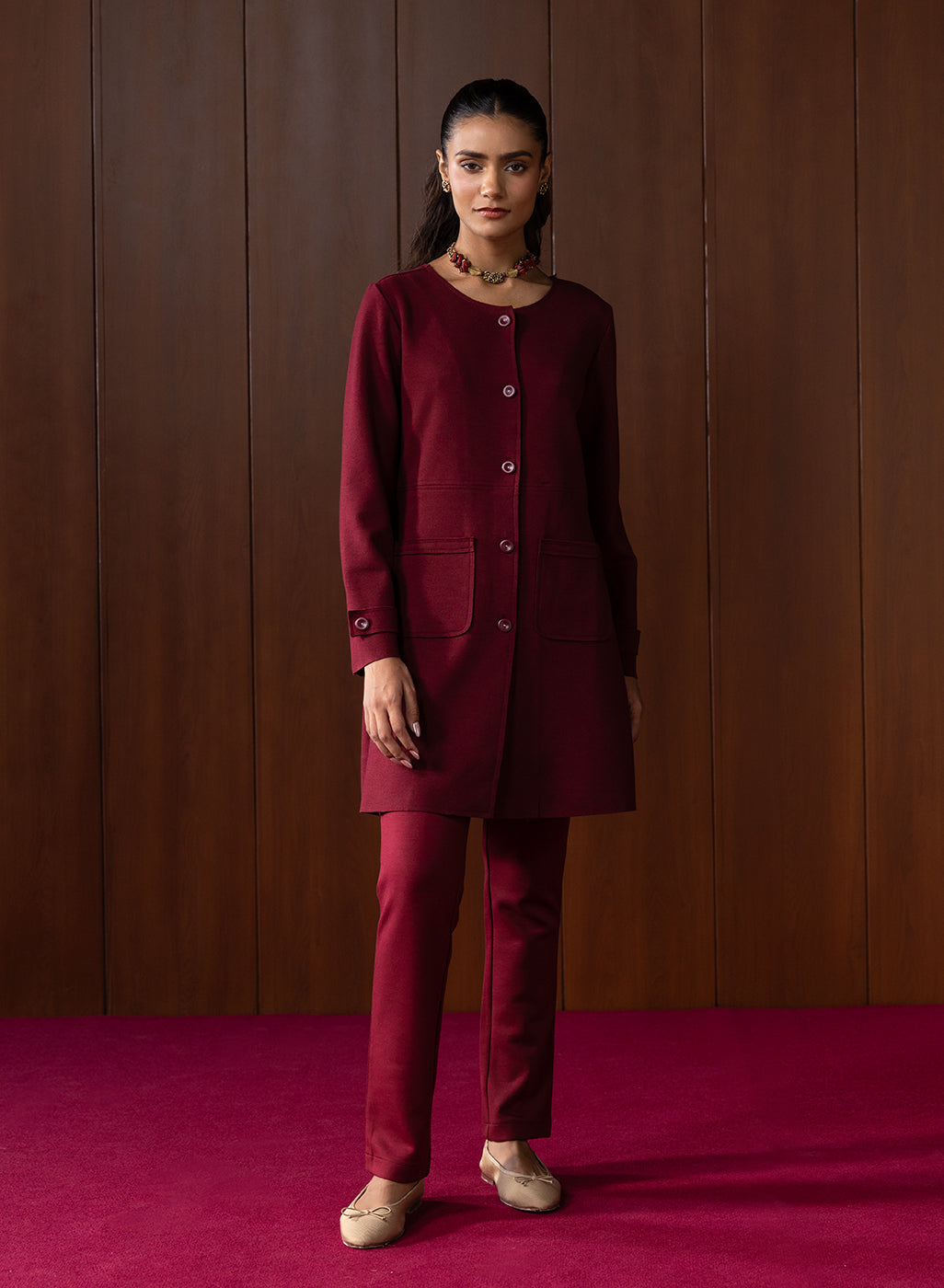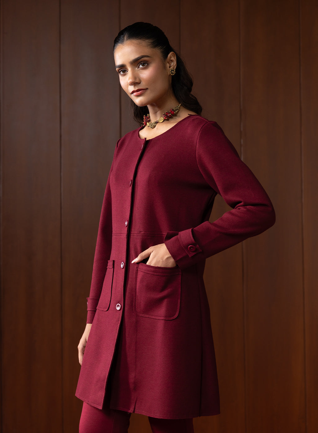 Rich, refined, and perfect for the season, this maroon wool coat is where warmth meets statement-making style. Designed in a straight silhouette with a clean round neckline, it brings a modern minimal vibe while the deep hue keeps you right on trend. With monochrome buttons and sleek patch pockets, it’s a chic choice for everything from workdays to winter evenings.