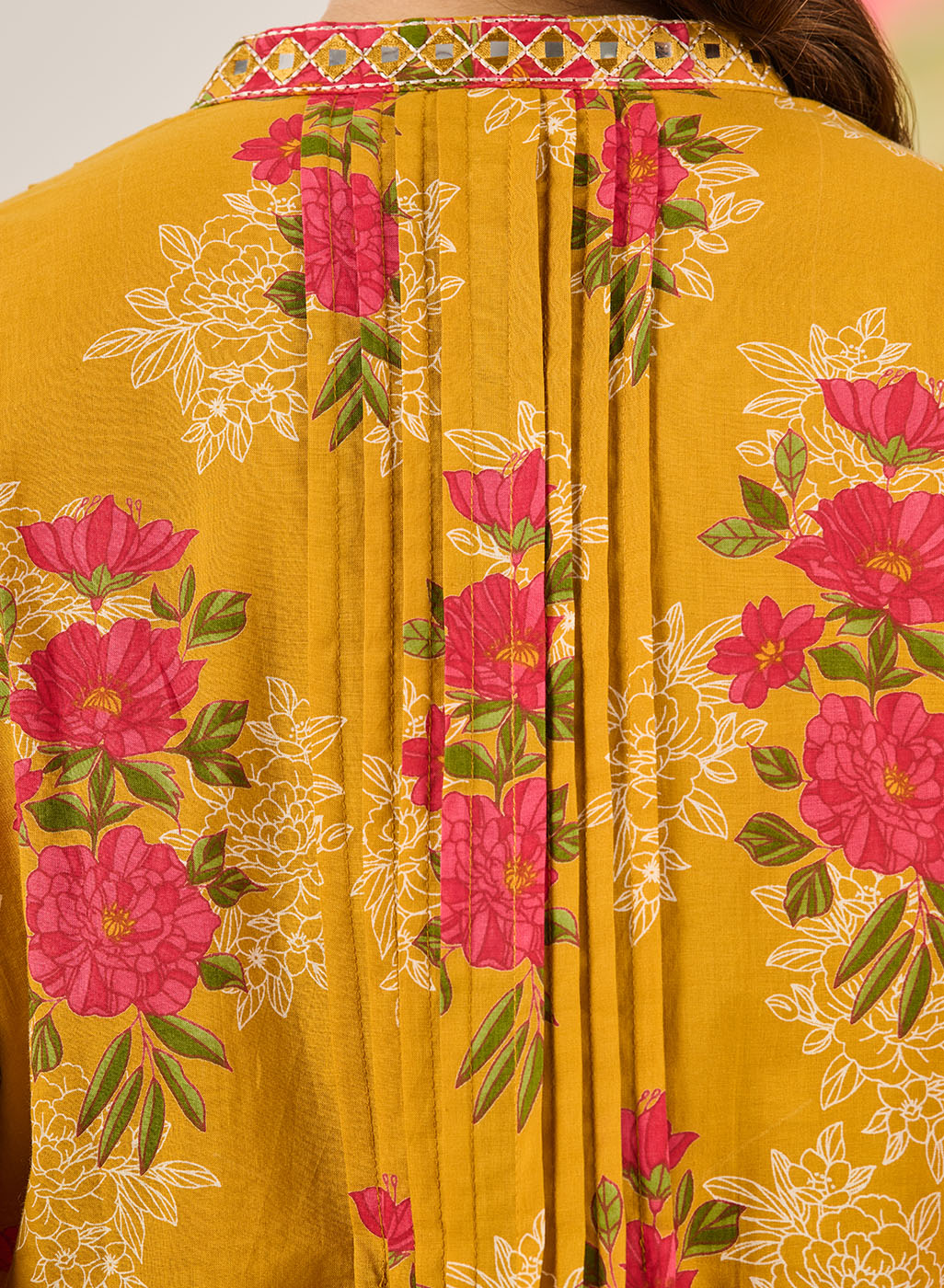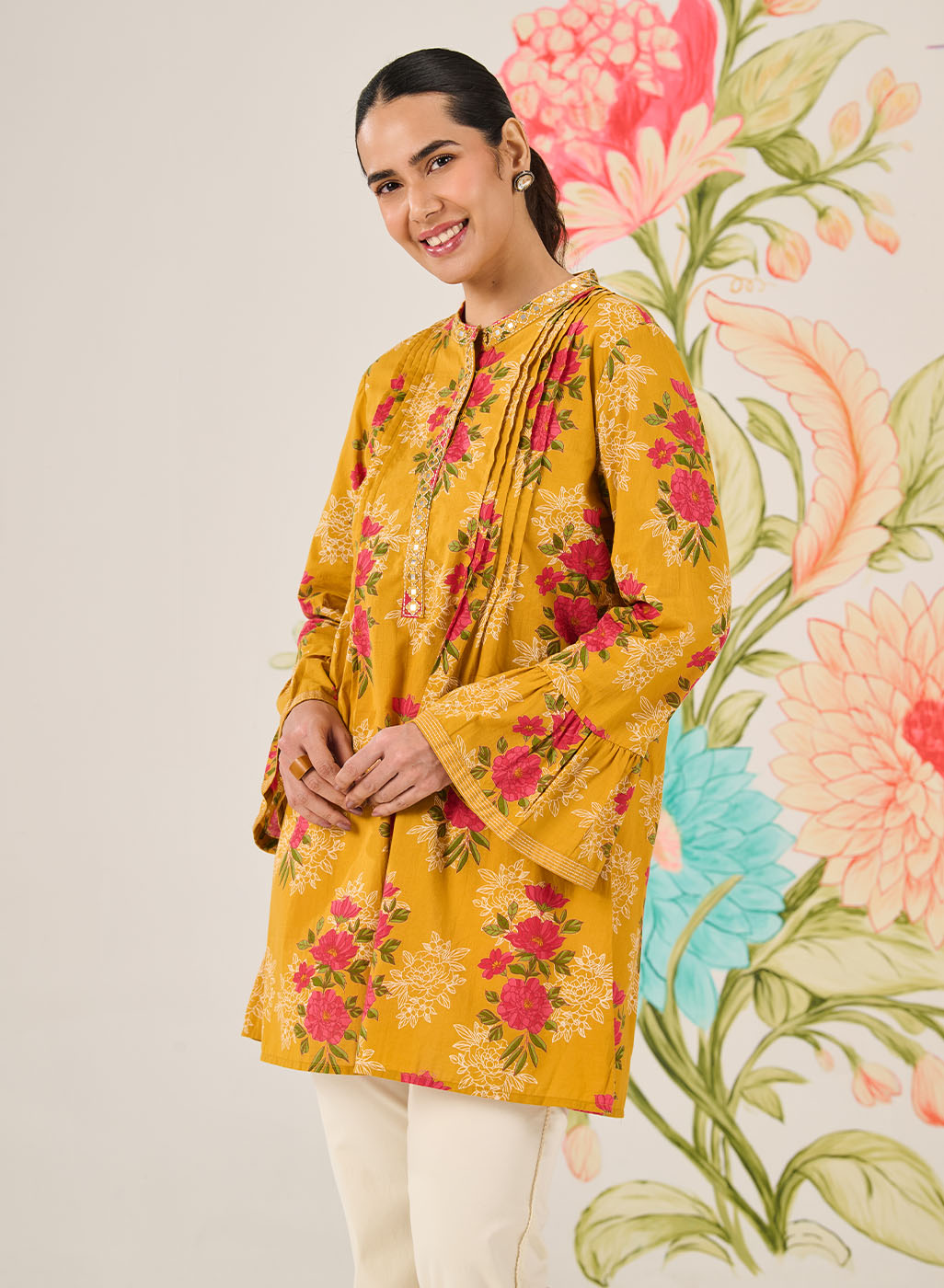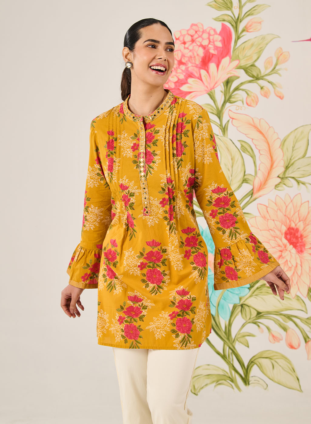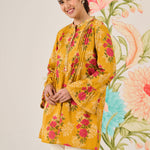 Bright, breezy and made for everyday plans, this mustard floral printed tunic brings together comfort and cheerful detail. The bold floral print stands out beautifully against the bright base, while the thread embroidery with mirror accents adds just a hint of charm without feeling heavy.