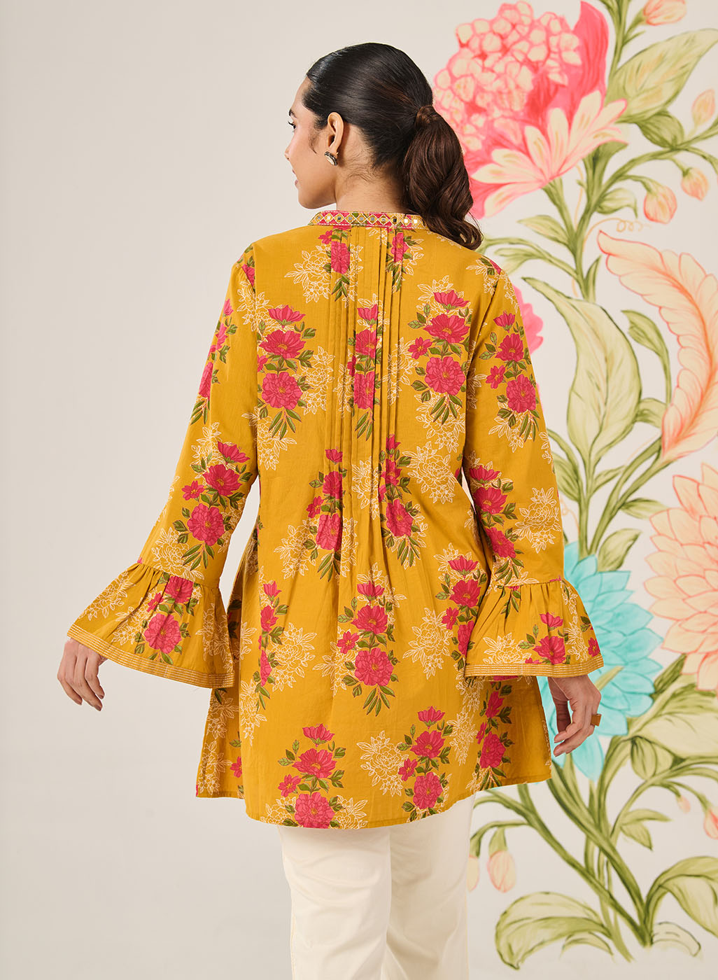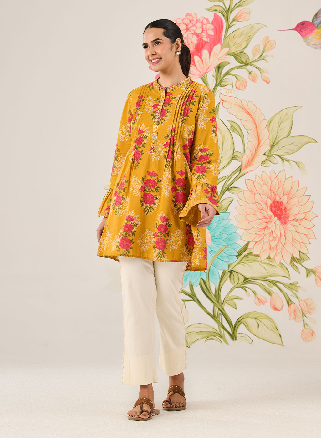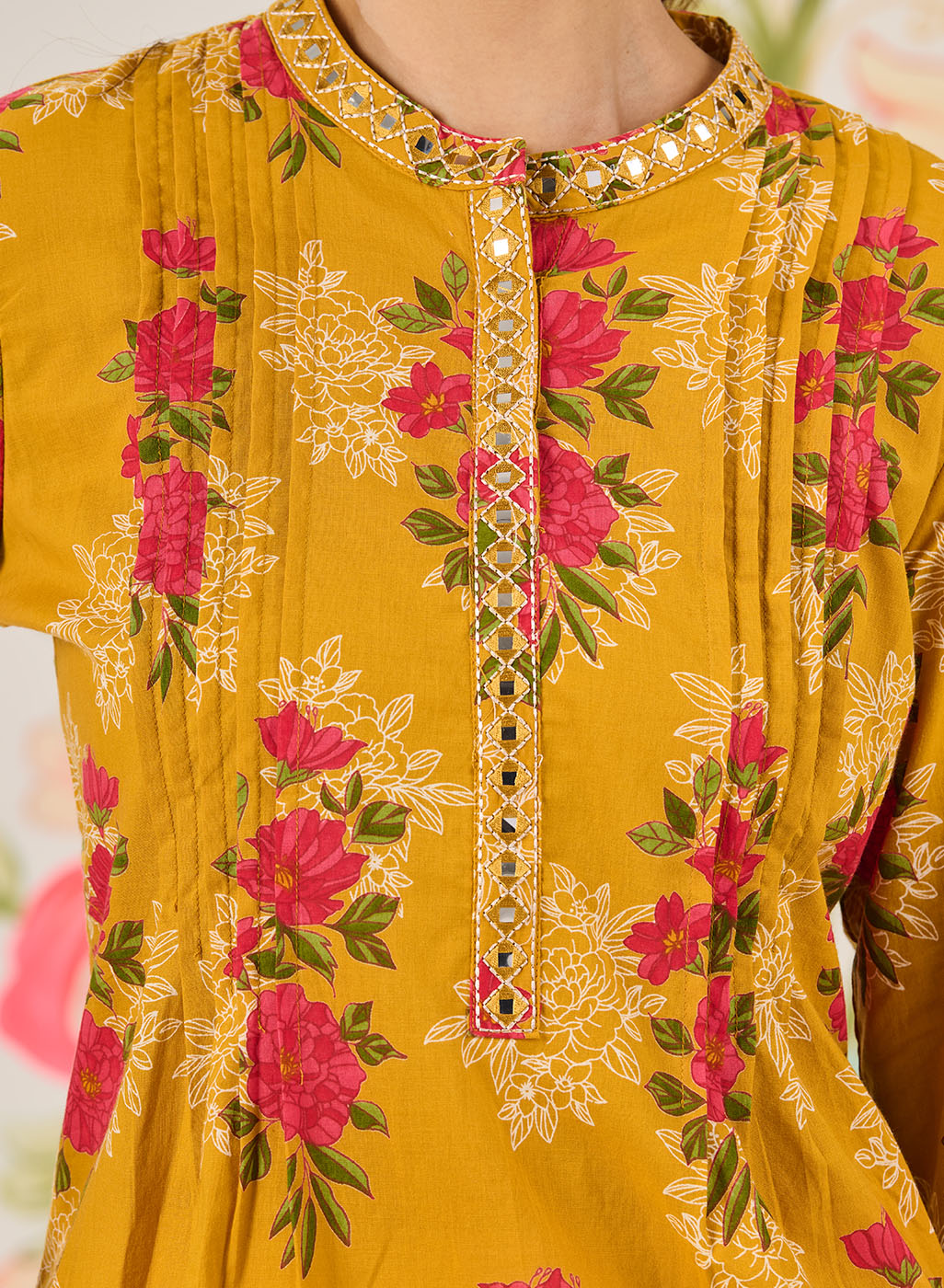Bright, breezy and made for everyday plans, this mustard floral printed tunic brings together comfort and cheerful detail. The bold floral print stands out beautifully against the bright base, while the thread embroidery with mirror accents adds just a hint of charm without feeling heavy.