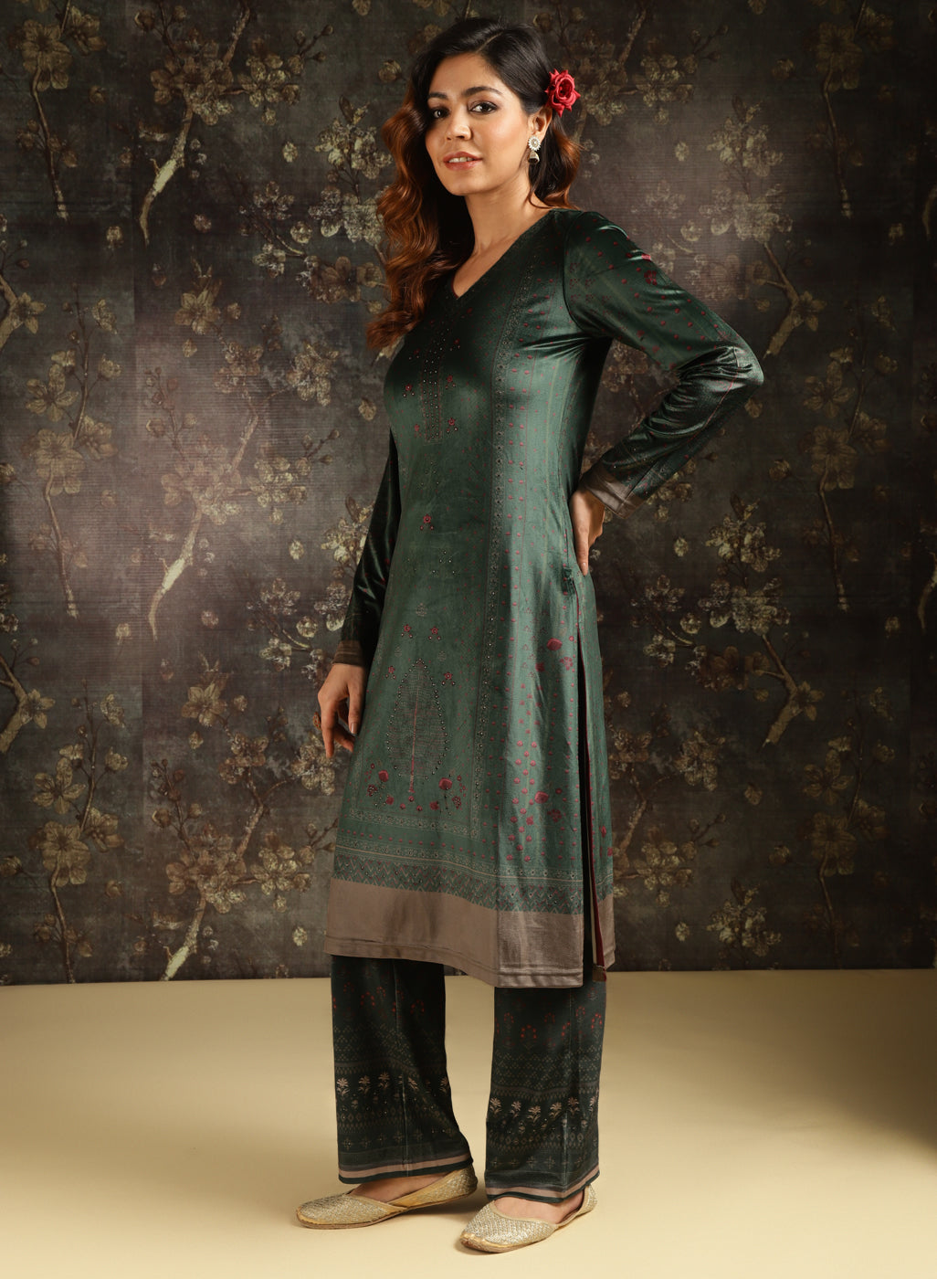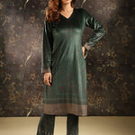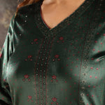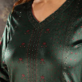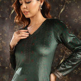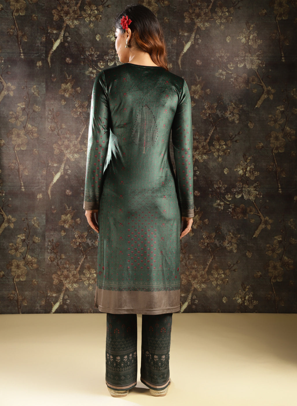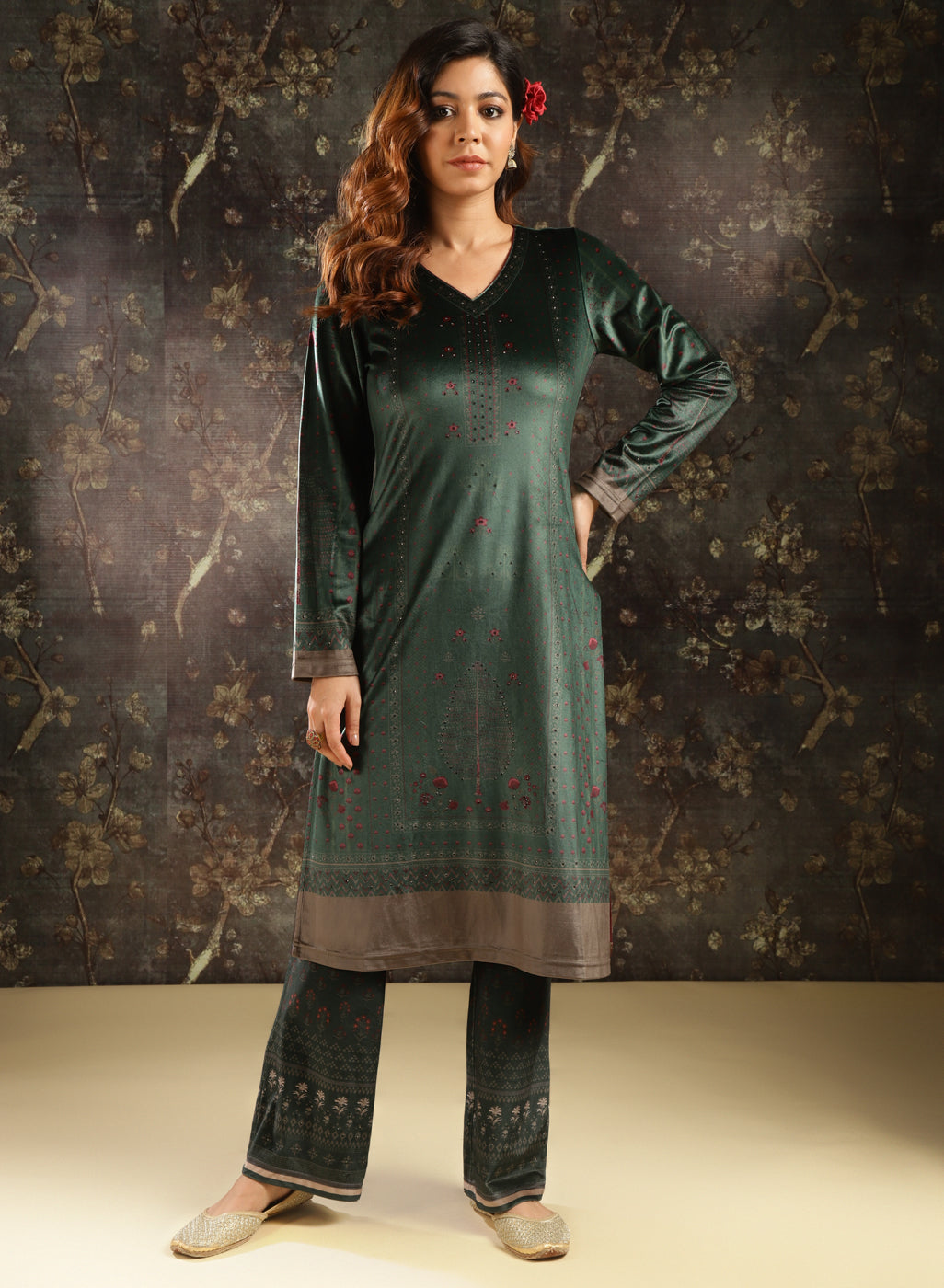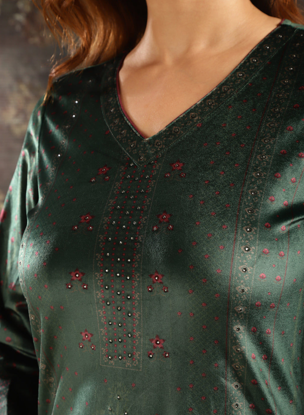 Emerald Green Printed Velvet Kurta Set with Swarovski Work