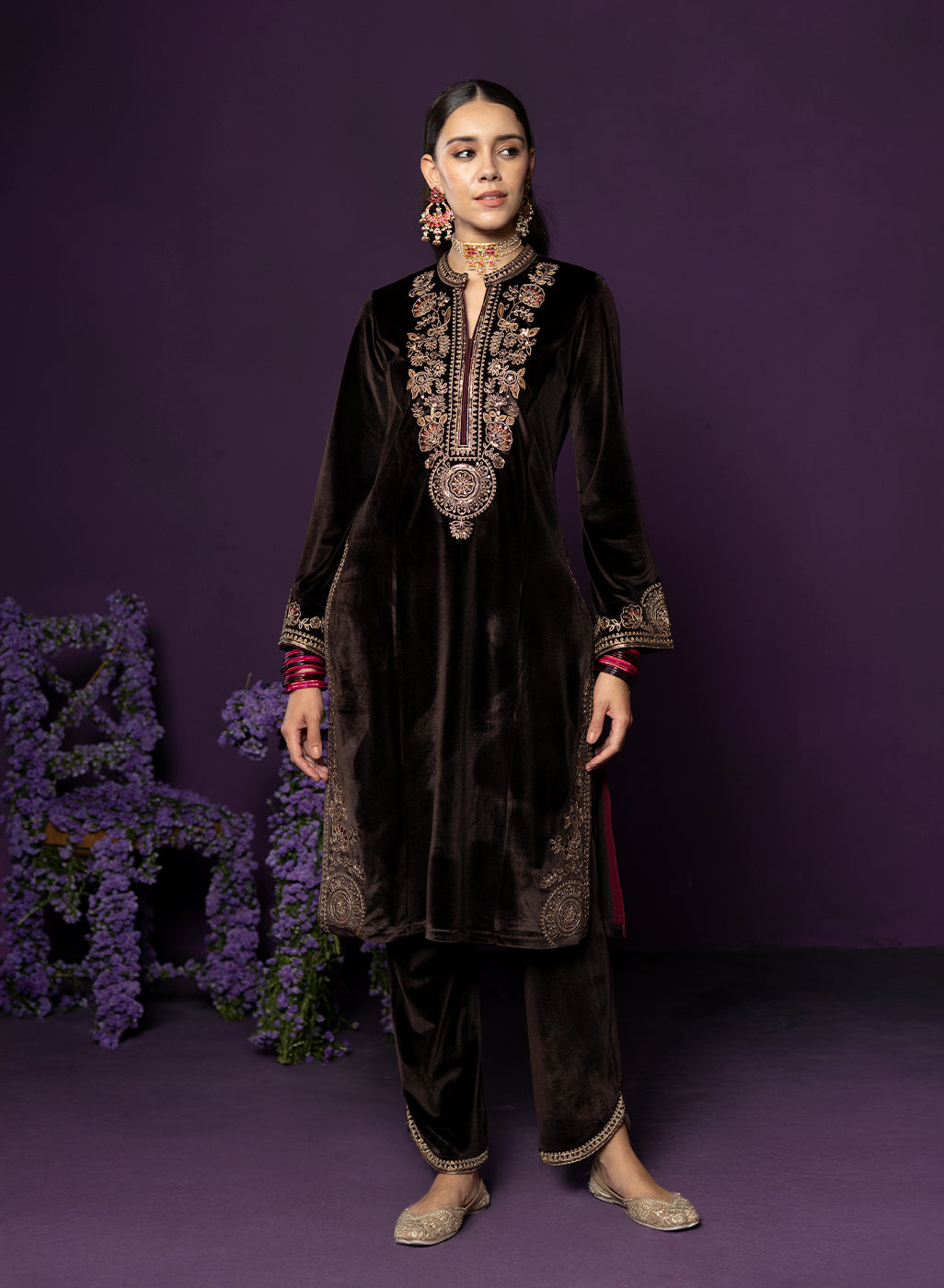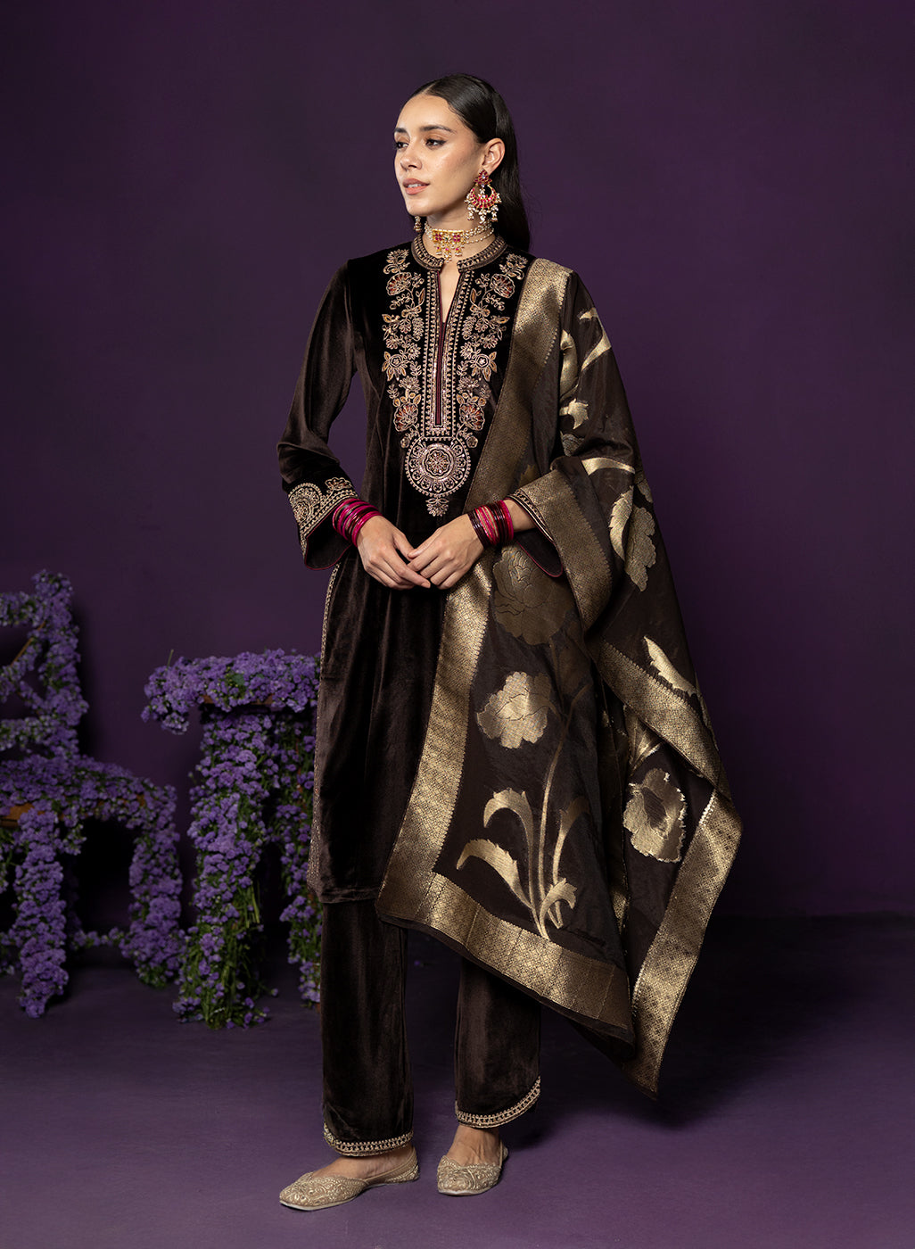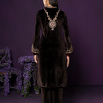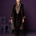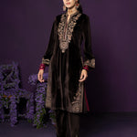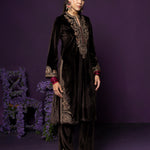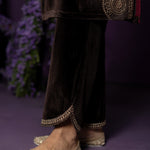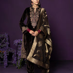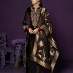 Eshira Brown Embroidered Velvet Suit Set with Banarasi Dupatta