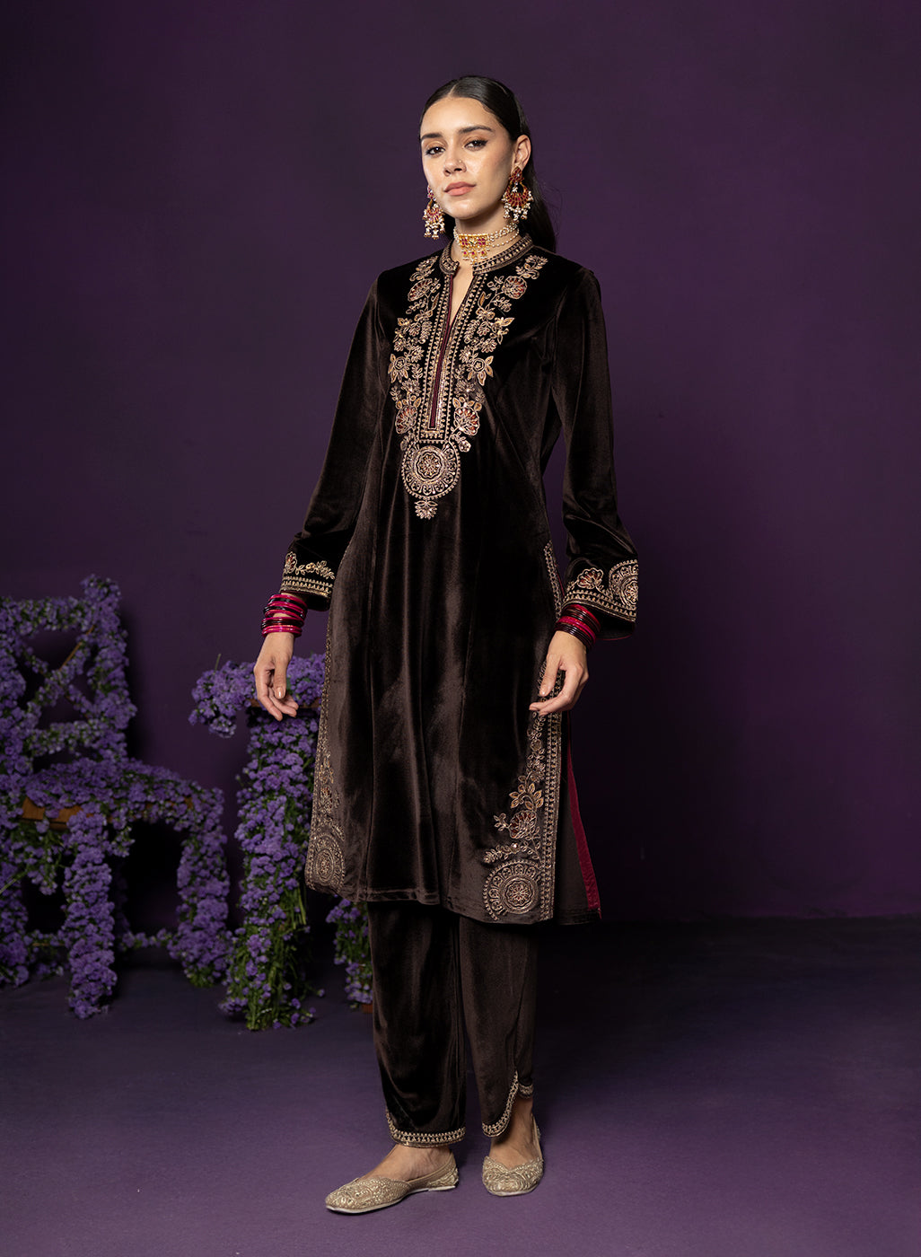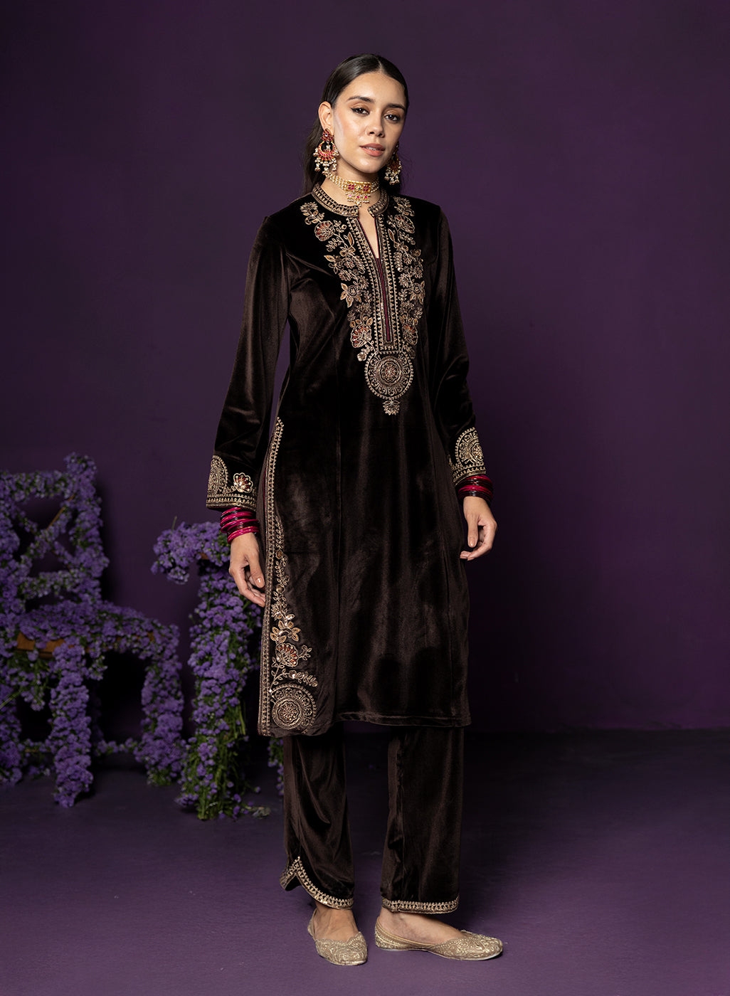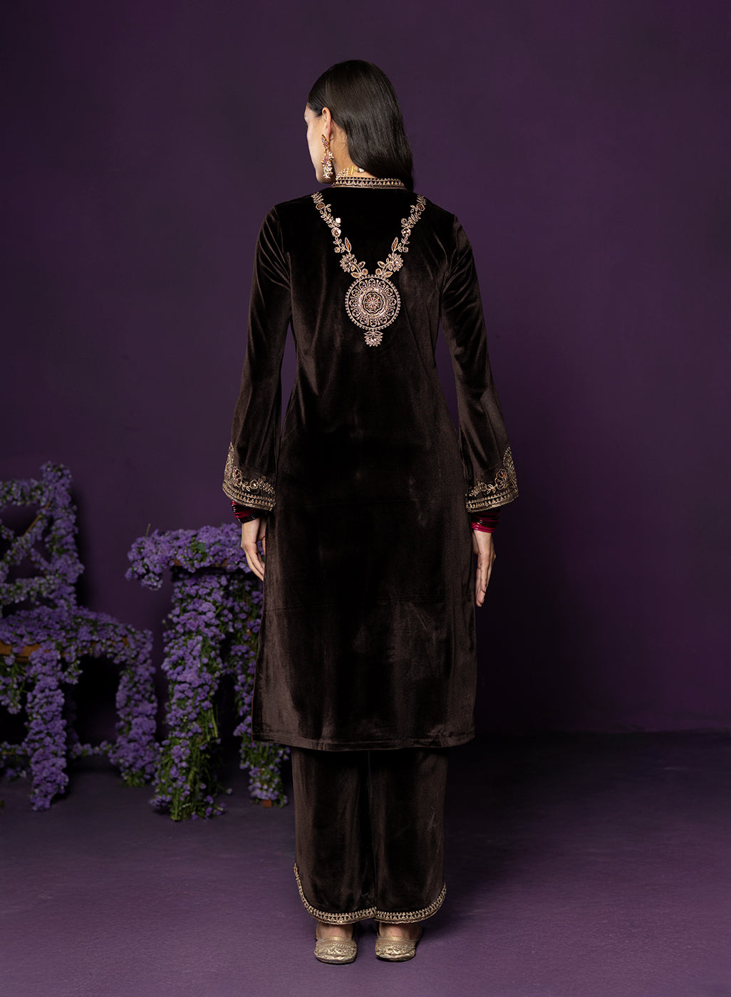 Rich, refined, and quietly striking, this brown velvet suit set is all about old world charm with a modern edge. The plush velvet base catches the light beautifully, while intricate dori embroidery with resham and sequin highlights lends it an additional shimmer. Finished with maroon contrast piping, a mandarin collar, and graceful bell sleeves, the look comes together to serve as the perfect base for the majestic banarasi dupatta.