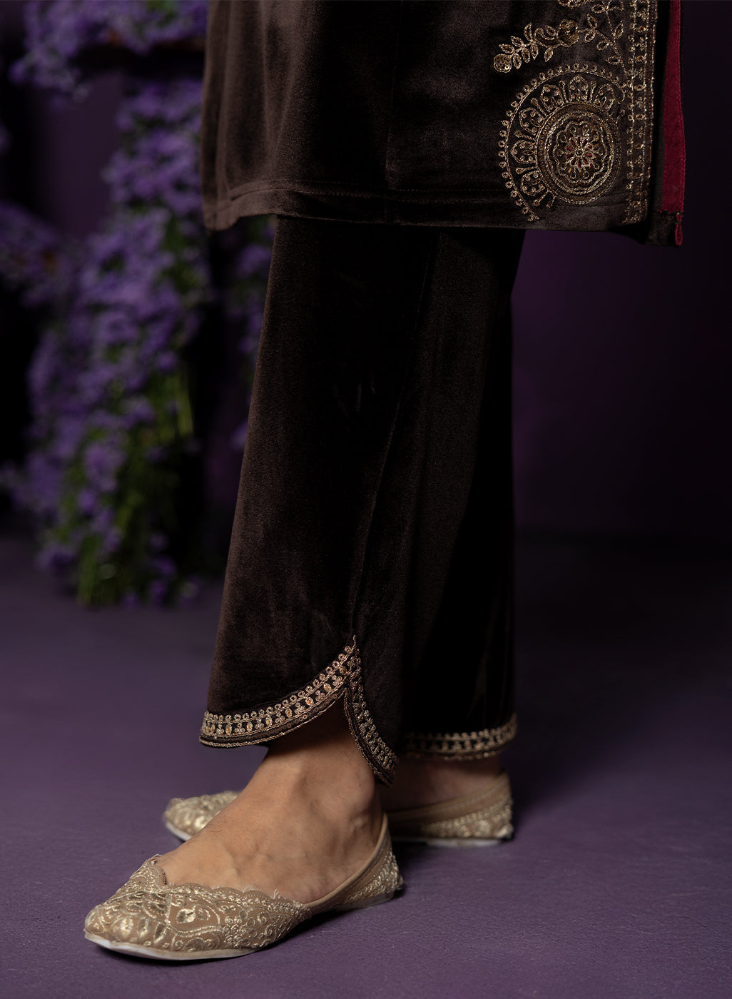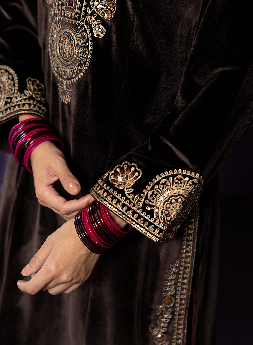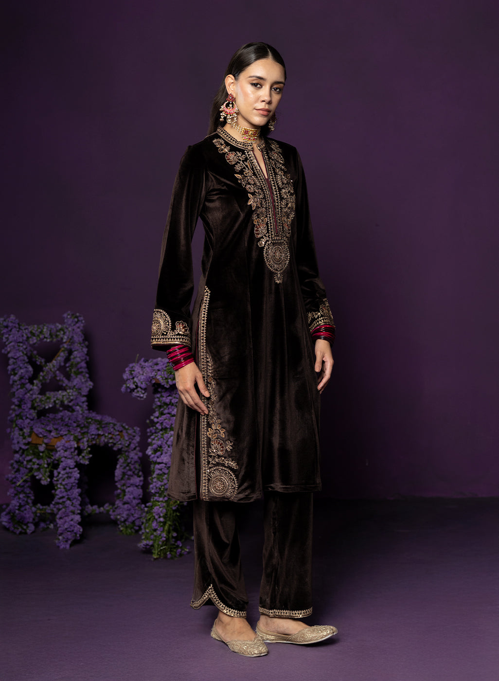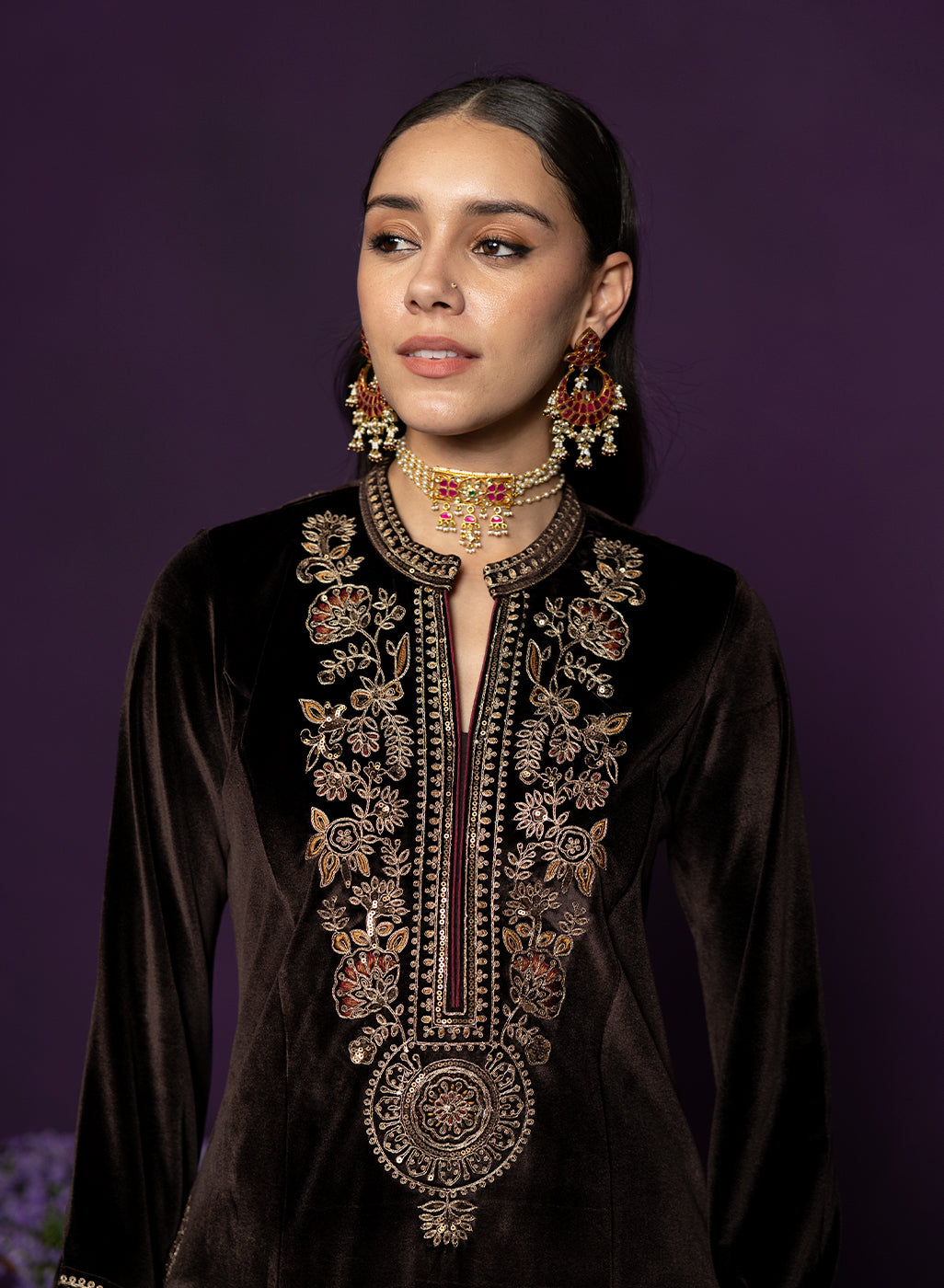 Rich, refined, and quietly striking, this brown velvet suit set is all about old world charm with a modern edge. The plush velvet base catches the light beautifully, while intricate dori embroidery with resham and sequin highlights lends it an additional shimmer. Finished with maroon contrast piping, a mandarin collar, and graceful bell sleeves, the look comes together to serve as the perfect base for the majestic banarasi dupatta.