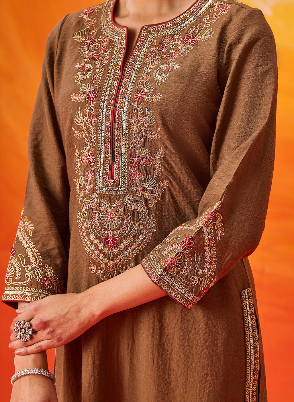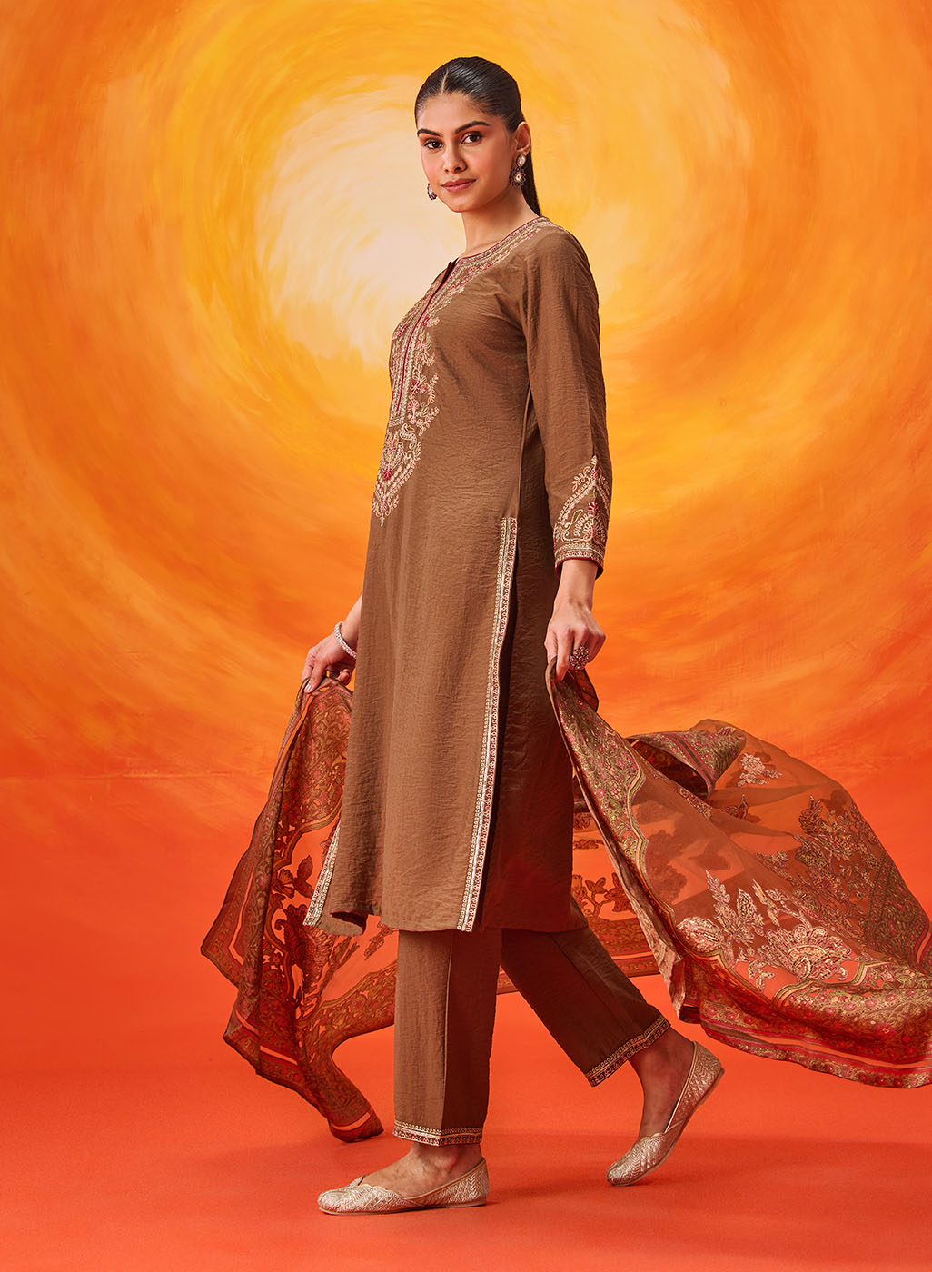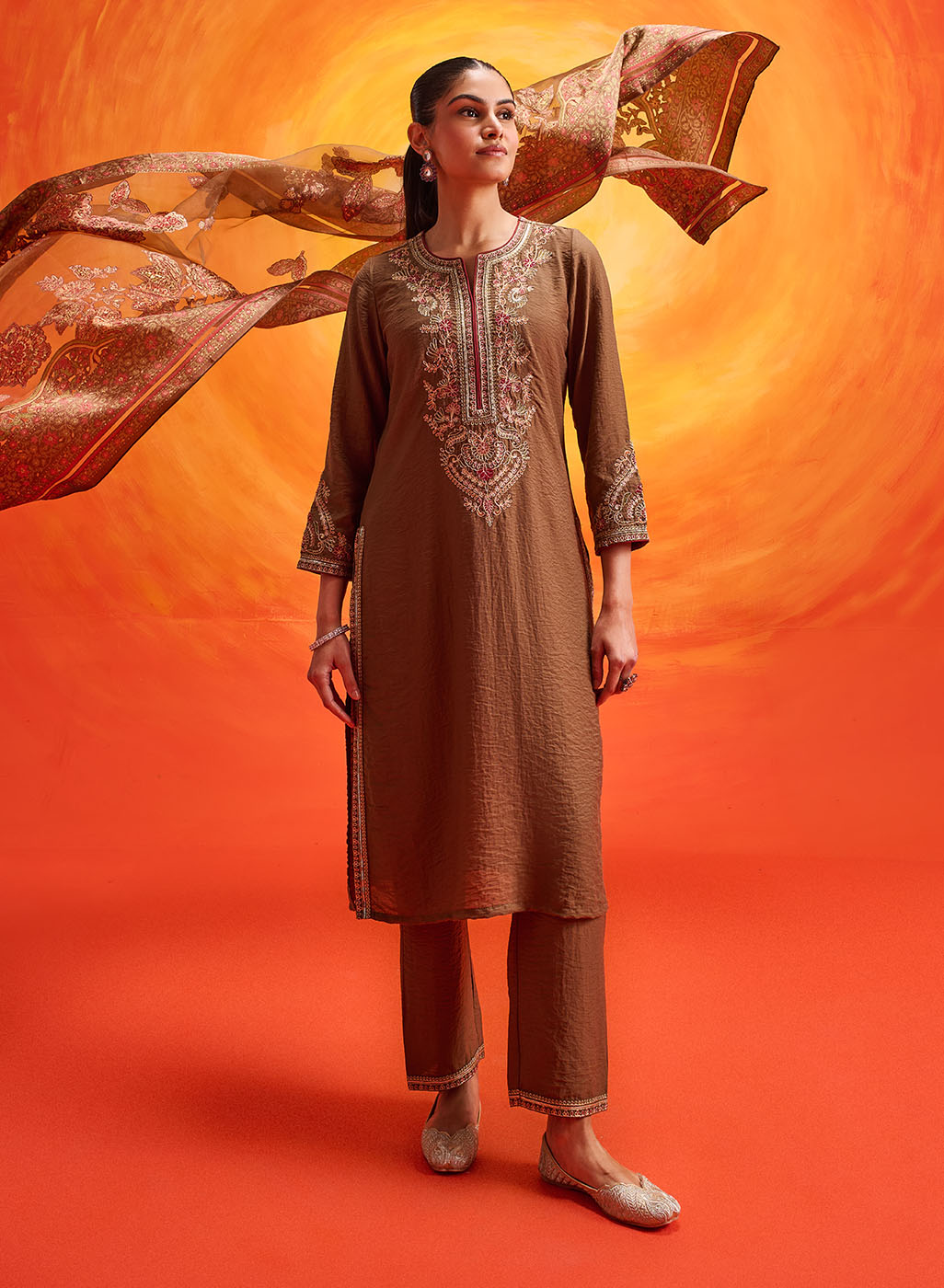 Bring home warmth with this earthy brown suit set finished with a delicate organza brasso dupatta. The straight kurta is tailored with princess seam panels for a flattering fall and detailed with resham and zari embroidery with sequin highlights across the neckline, back neck, sleeve hems, side slits, and kurta hem—adding a stunning festive shimmer. A notched neckline, bell sleeves and contrast piping lend a refined, contemporary charm to the ensemble.