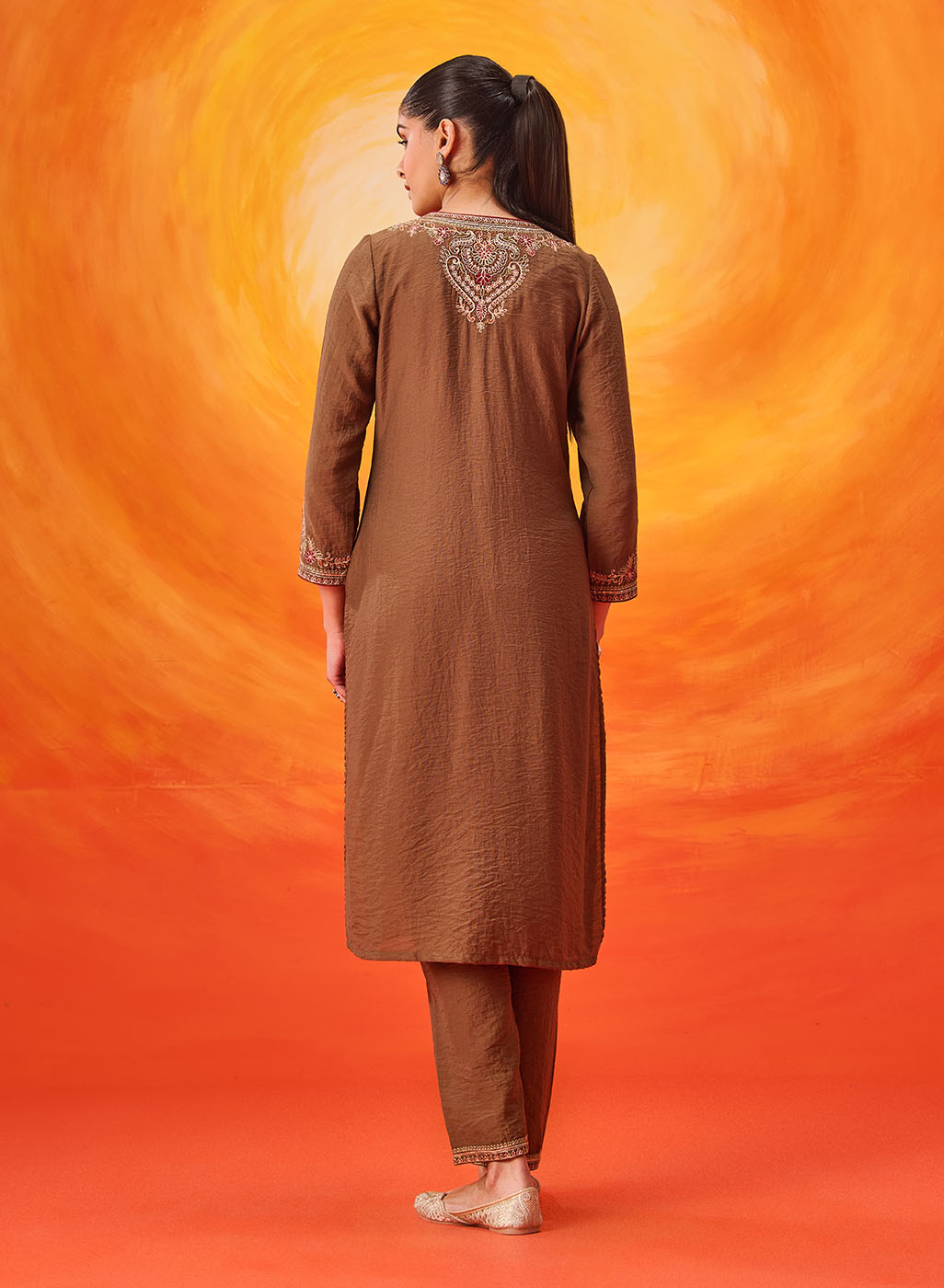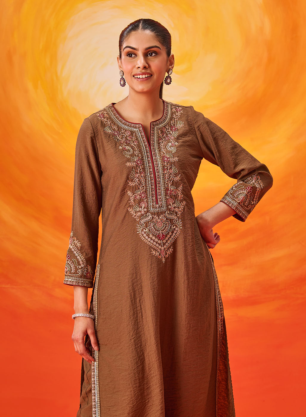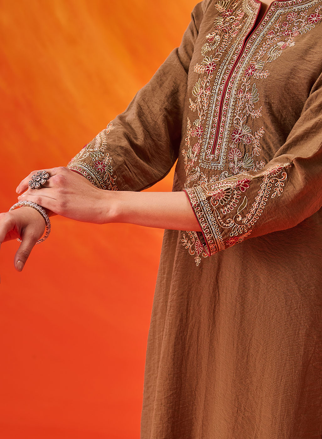 Bring home warmth with this earthy brown suit set finished with a delicate organza brasso dupatta. The straight kurta is tailored with princess seam panels for a flattering fall and detailed with resham and zari embroidery with sequin highlights across the neckline, back neck, sleeve hems, side slits, and kurta hem—adding a stunning festive shimmer. A notched neckline, bell sleeves and contrast piping lend a refined, contemporary charm to the ensemble.