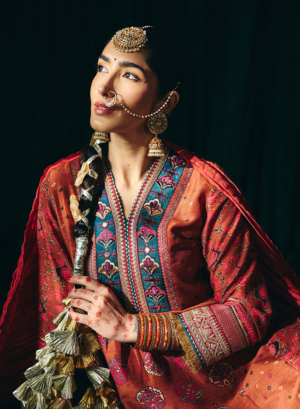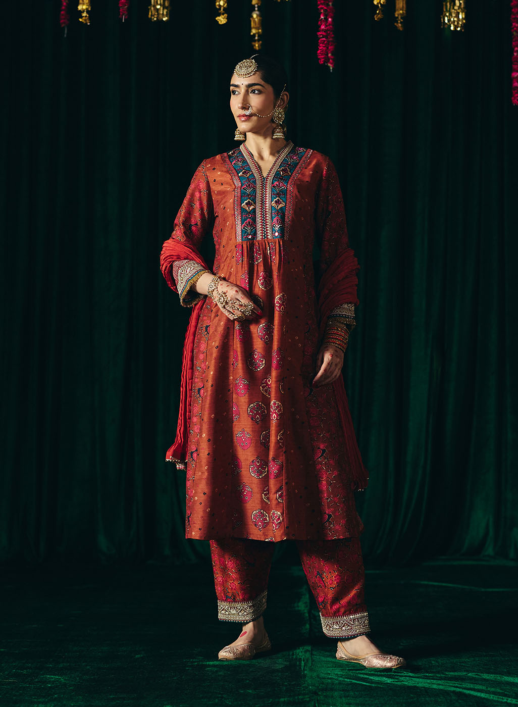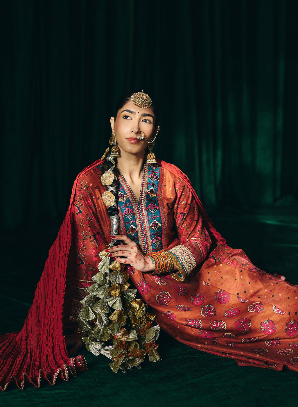 Vibrant and refined, this stunning orange silk kurta set exudes elegance. The all-over print is beautifully complemented by resham and zari embroidery, further enhanced with delicate sequin highlights and mirror accents. The V-neckline, framed with contrast embroidered panels, creates a striking focal point, while gathered detailing at the waist adds a graceful fall to the silhouette. The printed salwar bottoms with contrast piping, and gota lace bring depth and detail, while the organza dupatta, edged with zari-sequin lace, completes the ensemble with ethereal sophistication.