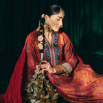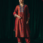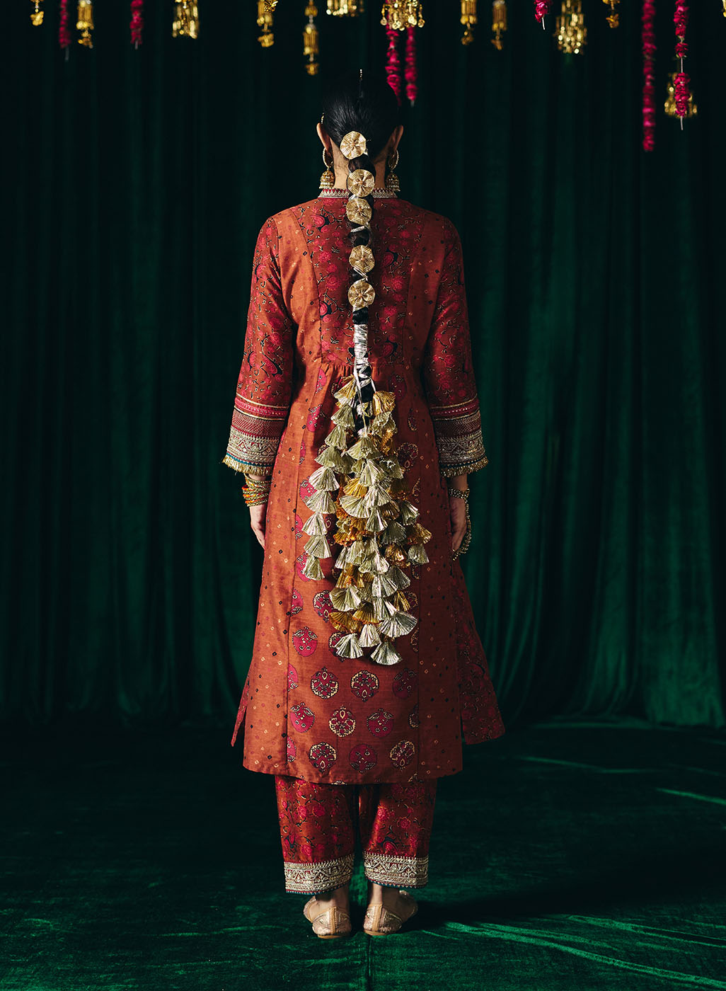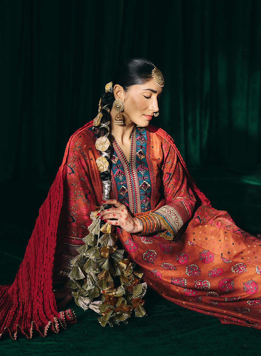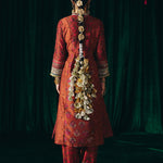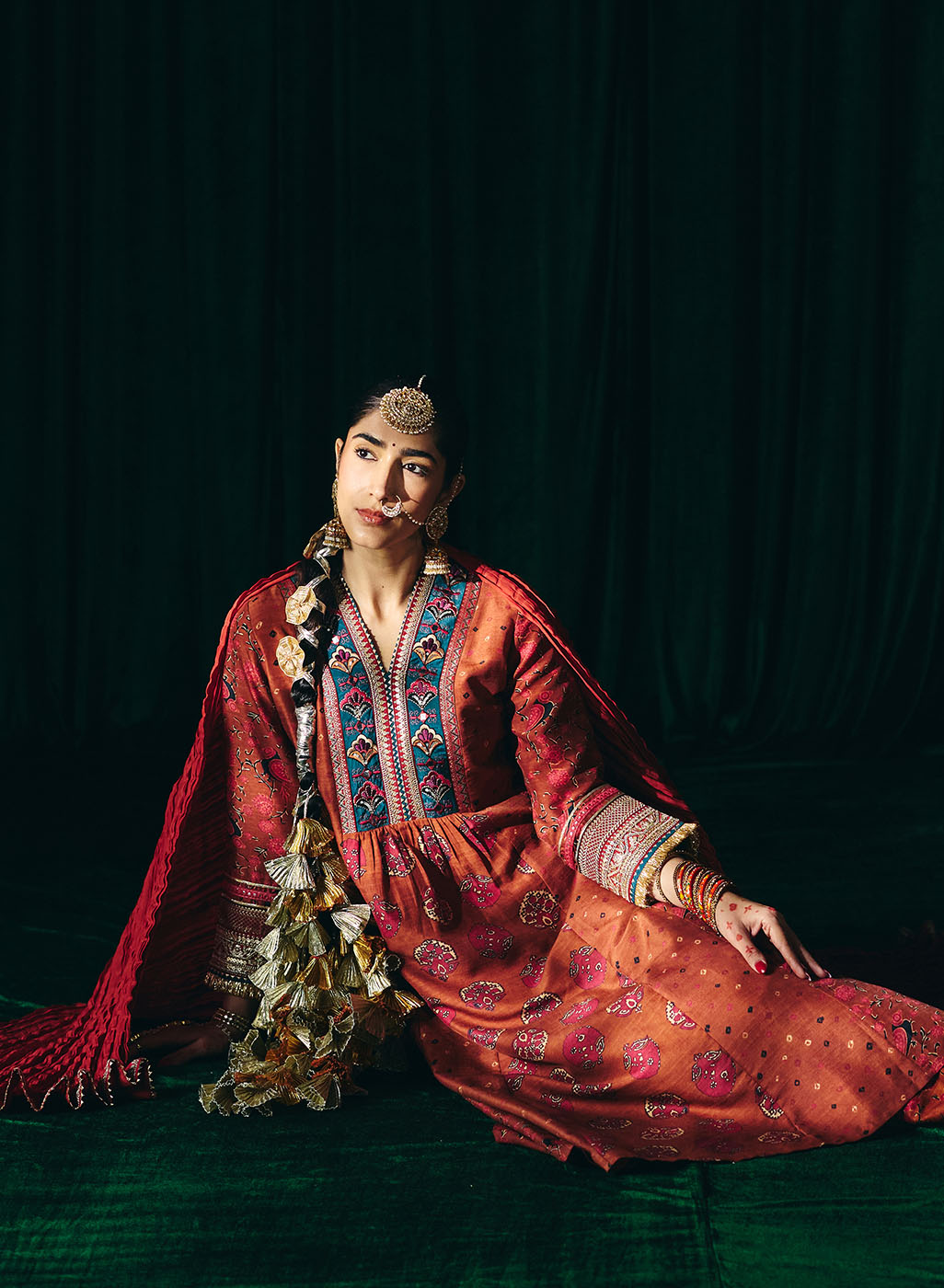 Vibrant and refined, this stunning orange silk kurta set exudes elegance. The all-over print is beautifully complemented by resham and zari embroidery, further enhanced with delicate sequin highlights and mirror accents. The V-neckline, framed with contrast embroidered panels, creates a striking focal point, while gathered detailing at the waist adds a graceful fall to the silhouette. The printed salwar bottoms with contrast piping, and gota lace bring depth and detail, while the organza dupatta, edged with zari-sequin lace, completes the ensemble with ethereal sophistication.