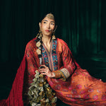 • V-neckline with contrast embroidered patch, resham & zari embroidery, sequin highlights & mirror accents