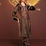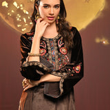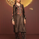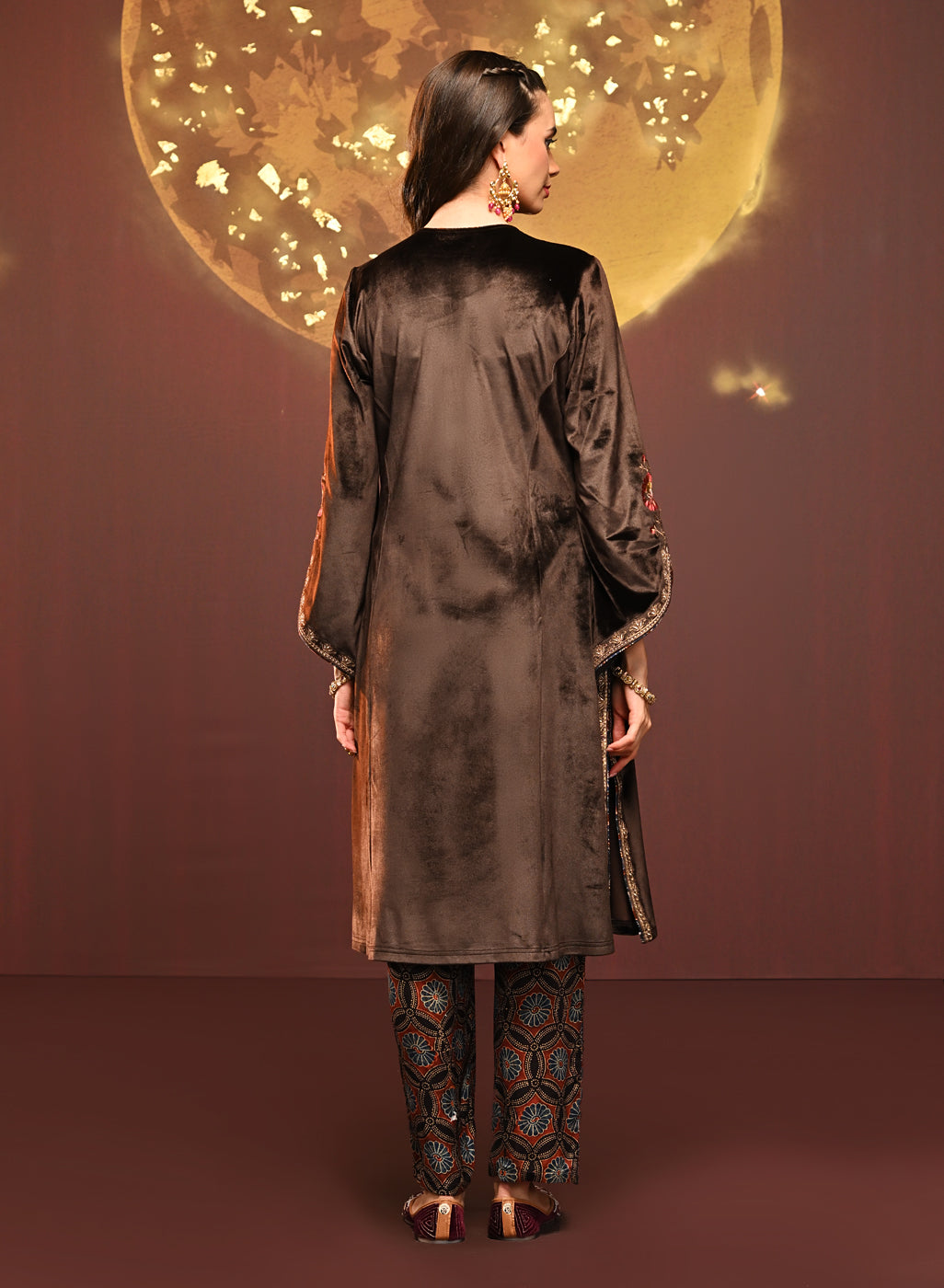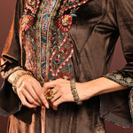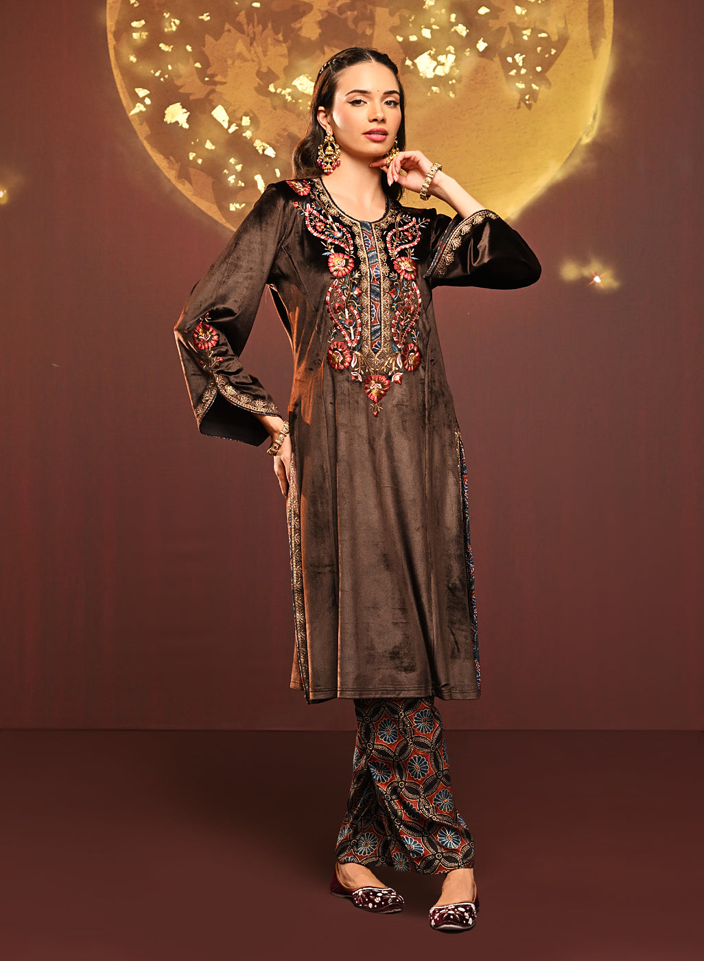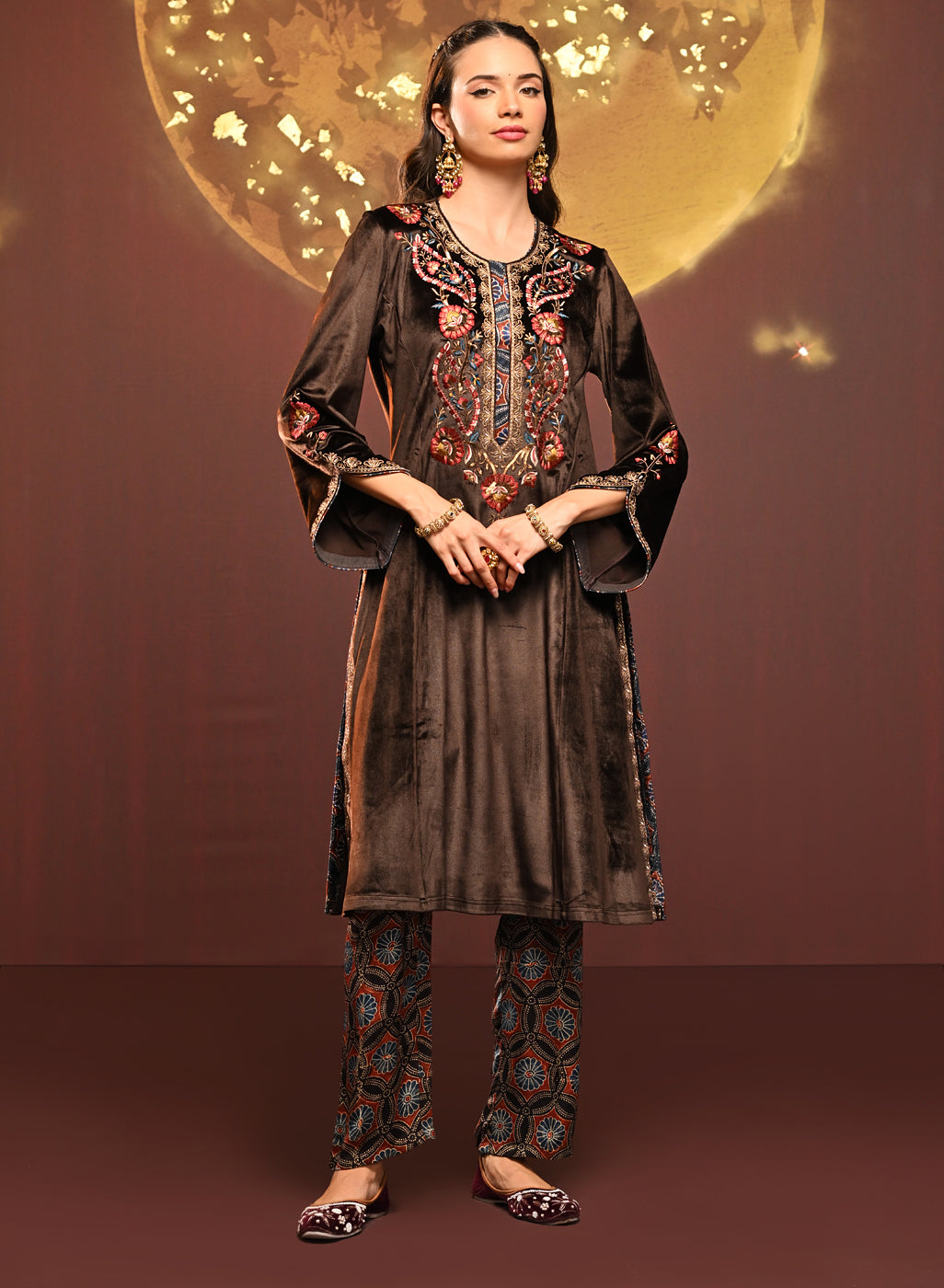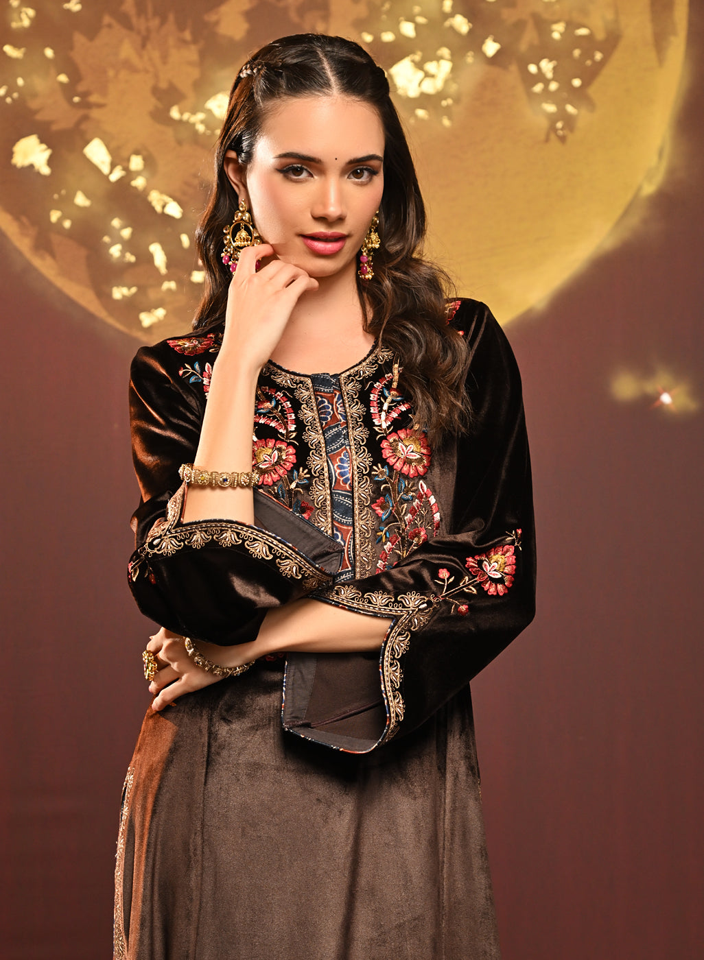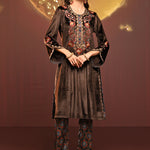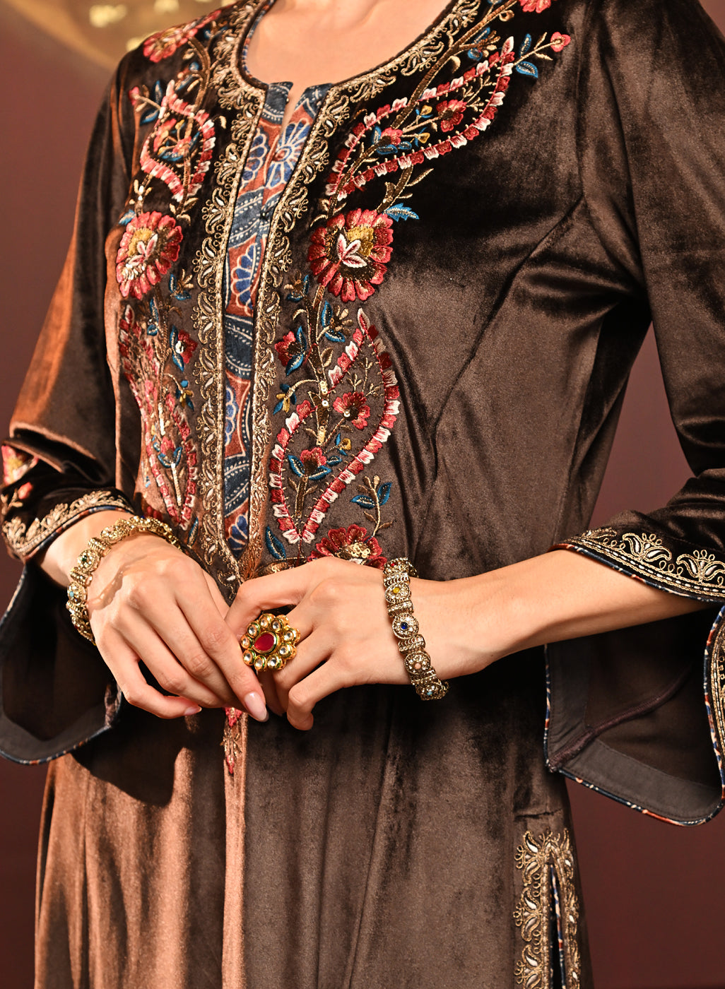 Faha Chocolate Brown Embroidered Velvet Kurta Set for Women with Dupatta