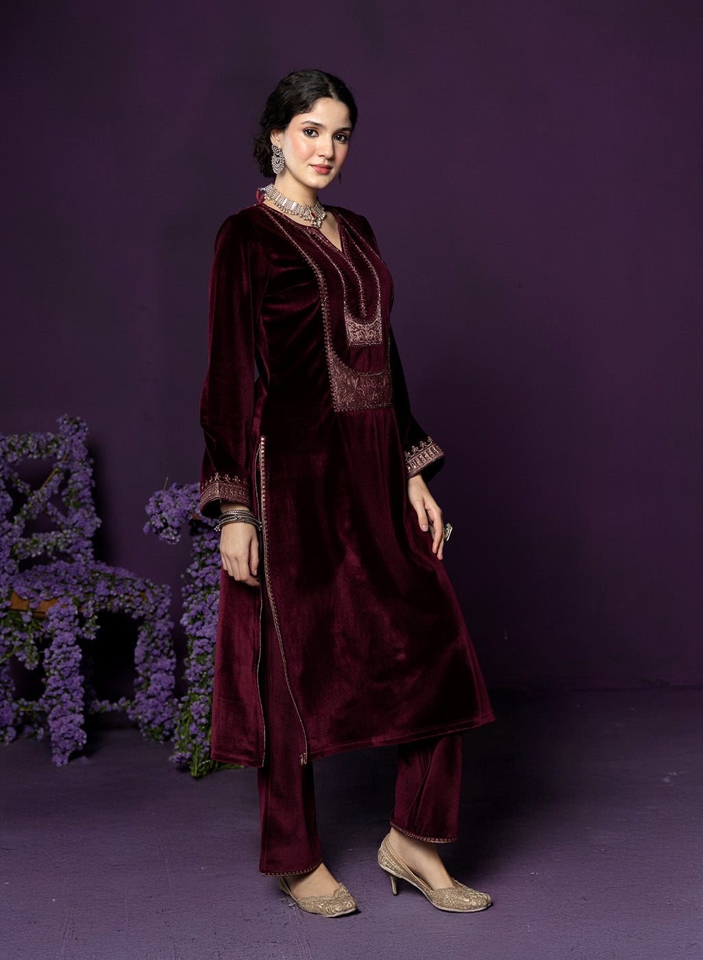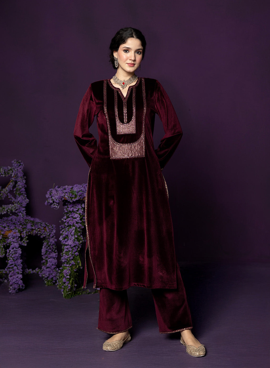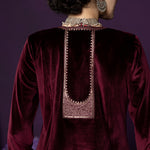 The maroon velvet kurta set exudes a deep, regal warmth—perfect for intimate winter festivities. Intricate applique work, shimmering bead accents, and a structured notched neckline give the ensemble a rich, heritage-inspired appeal. Paired with straight pants and a scalloped organza dupatta, it effortlessly balances tradition with luxurious refinement.
