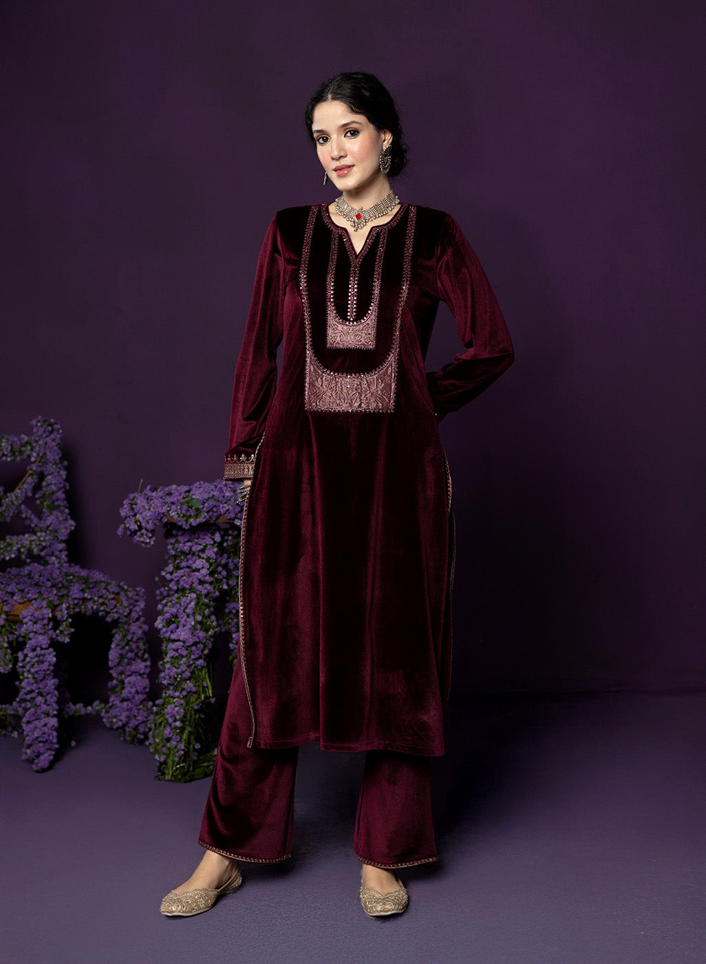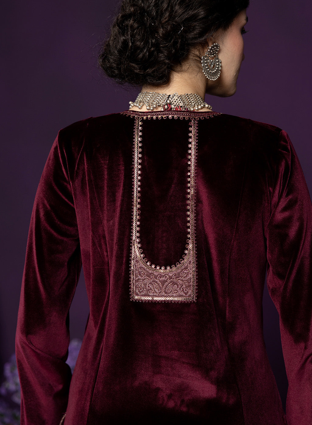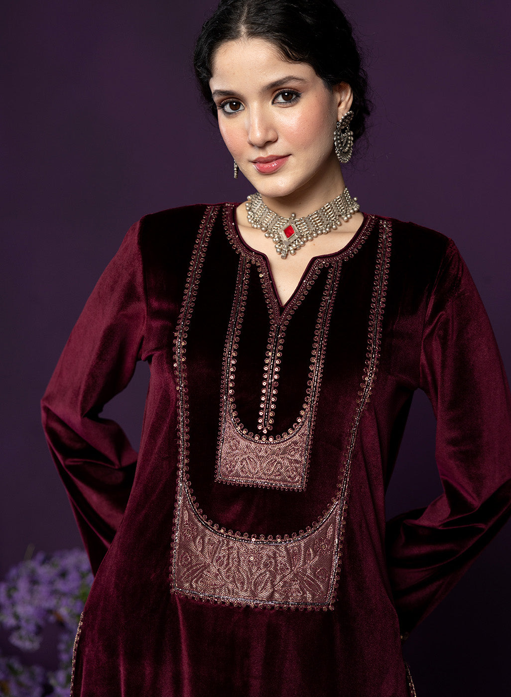 Style Tip: Pair the maroon set with gold jhumkas and a soft glam makeup look to highlight its rich festive undertone.