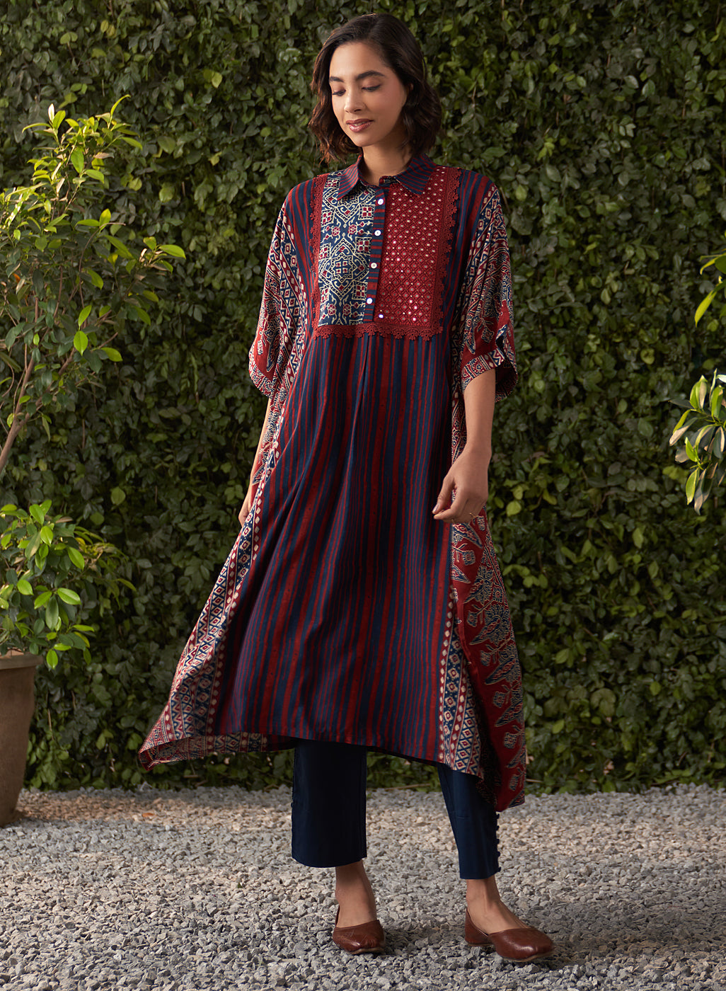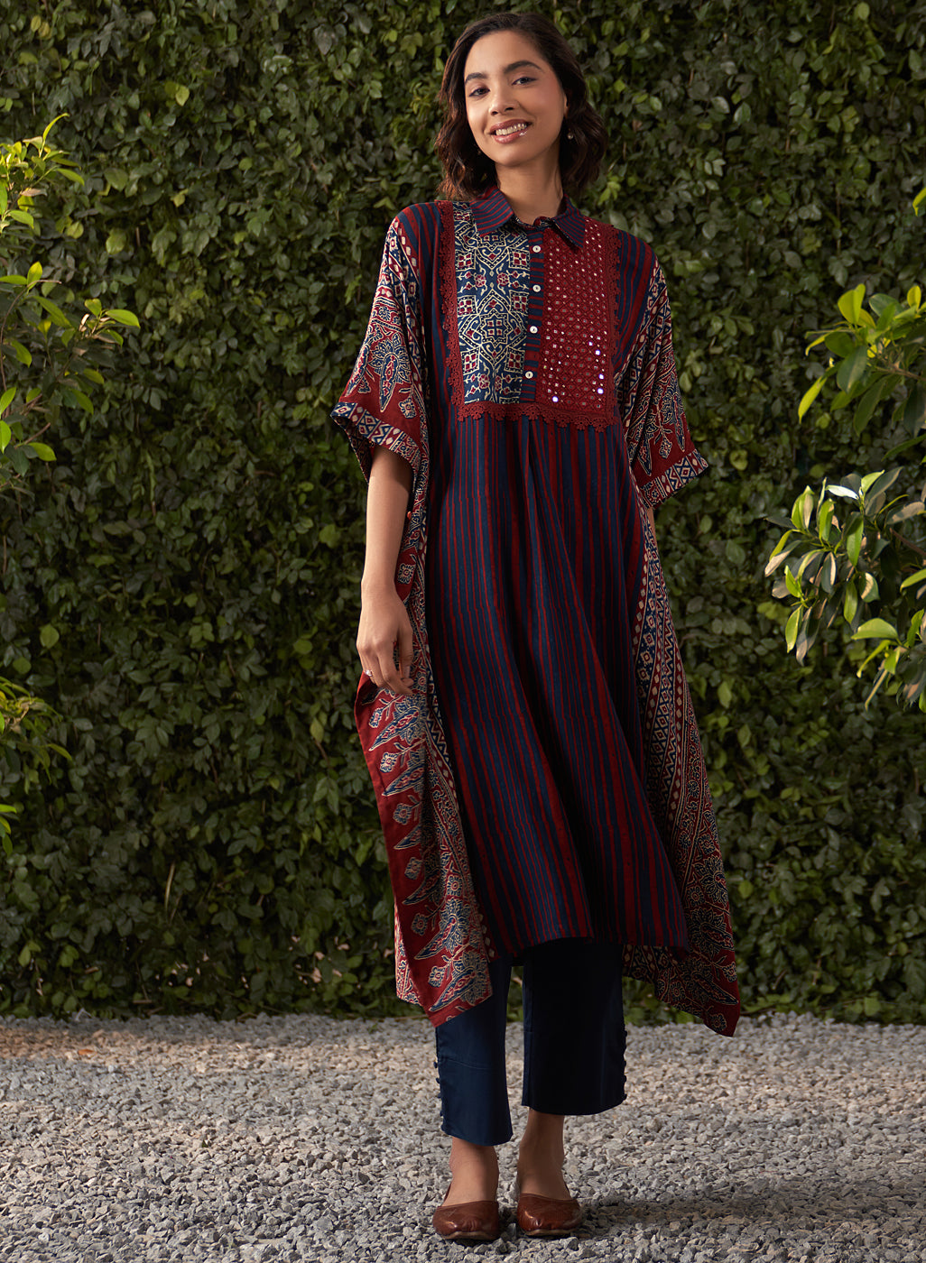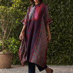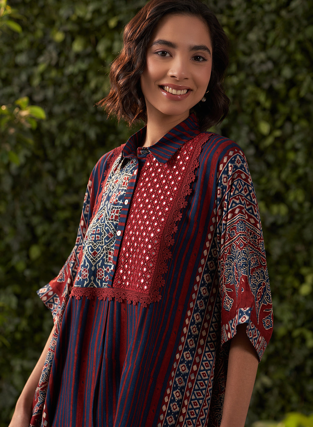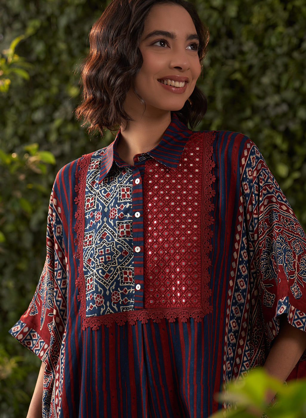 This Fiona Kaftan dress is a striking fusion of traditional craftsmanship and contemporary flair. Crafted from a soft, breathable rayon, it flows gracefully, embracing you in a loose, relaxed fit that offers unmatched comfort. The rich hue of deep red creates a dramatic canvas, enhanced by the all-over printed Ajrakh pattern.