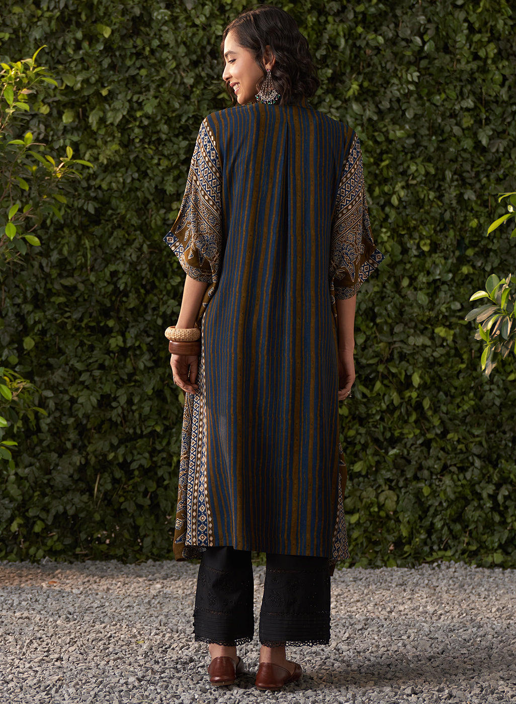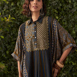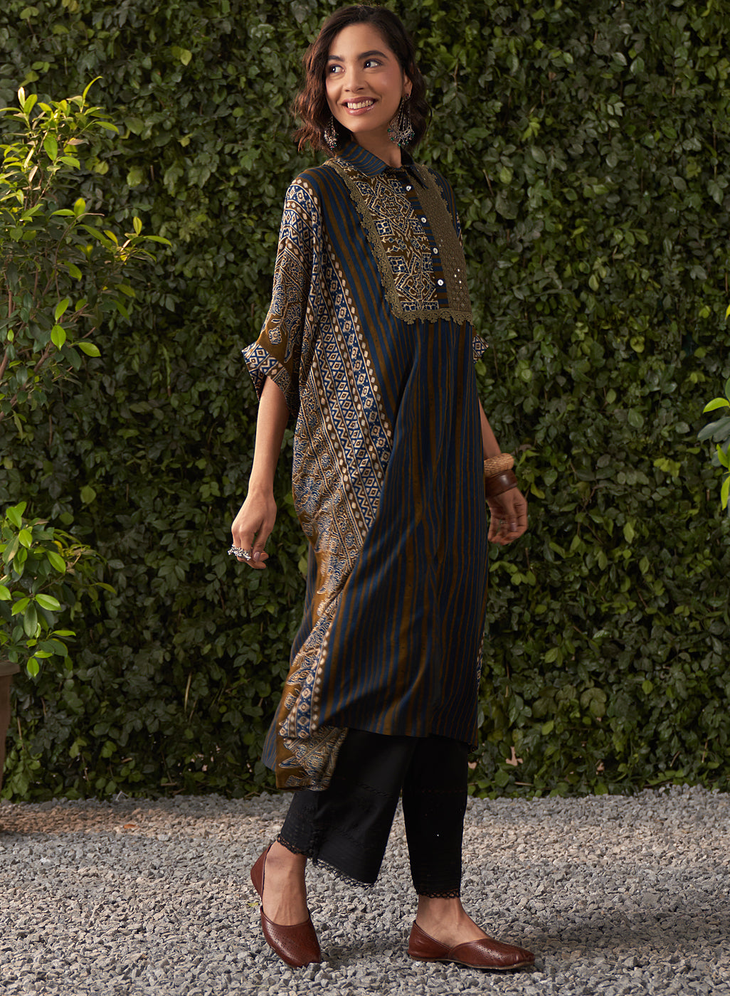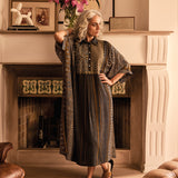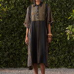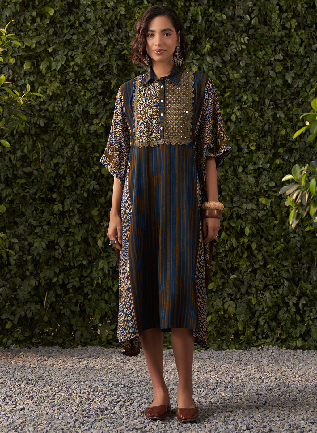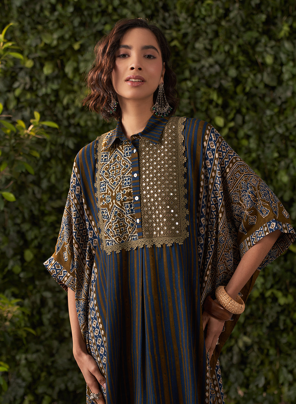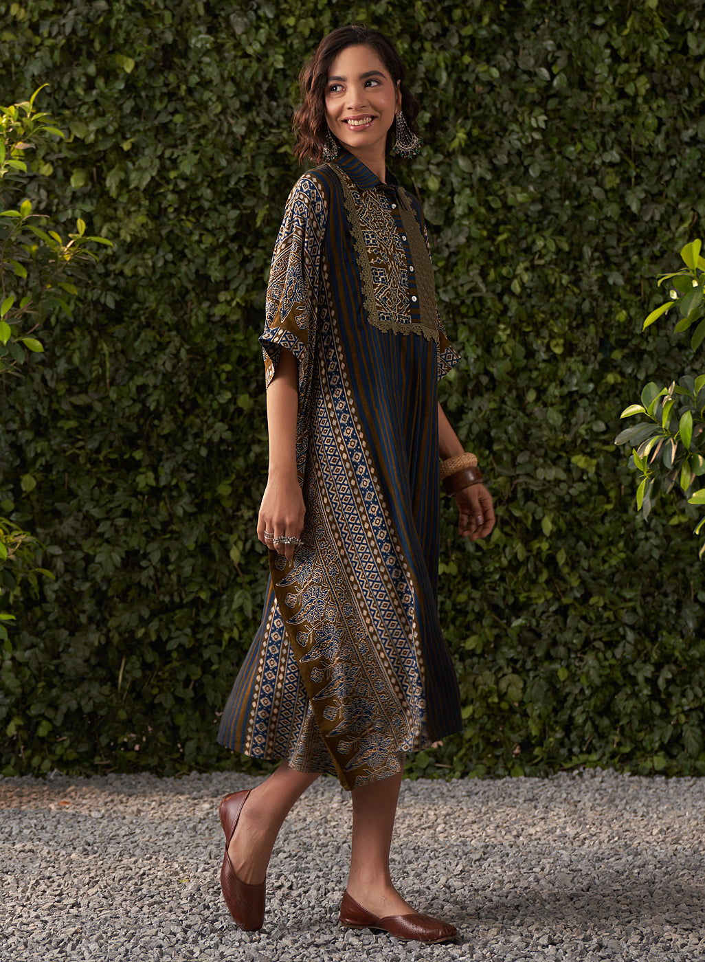 This Fiona Kaftan dress is a striking fusion of traditional craftsmanship and contemporary flair. Crafted from a soft, breathable rayon, it flows gracefully, embracing you in a loose, relaxed fit that offers unmatched comfort. The rich hue of deep red creates a dramatic canvas, enhanced by the all-over printed Ajrakh pattern.