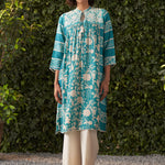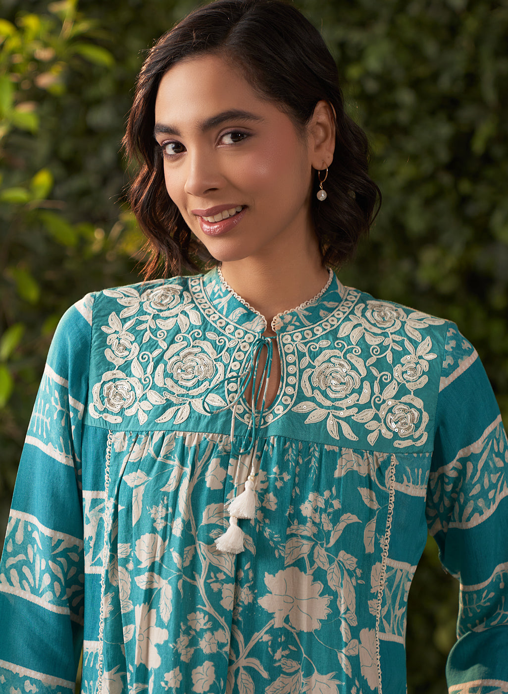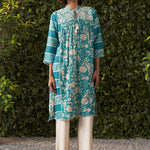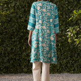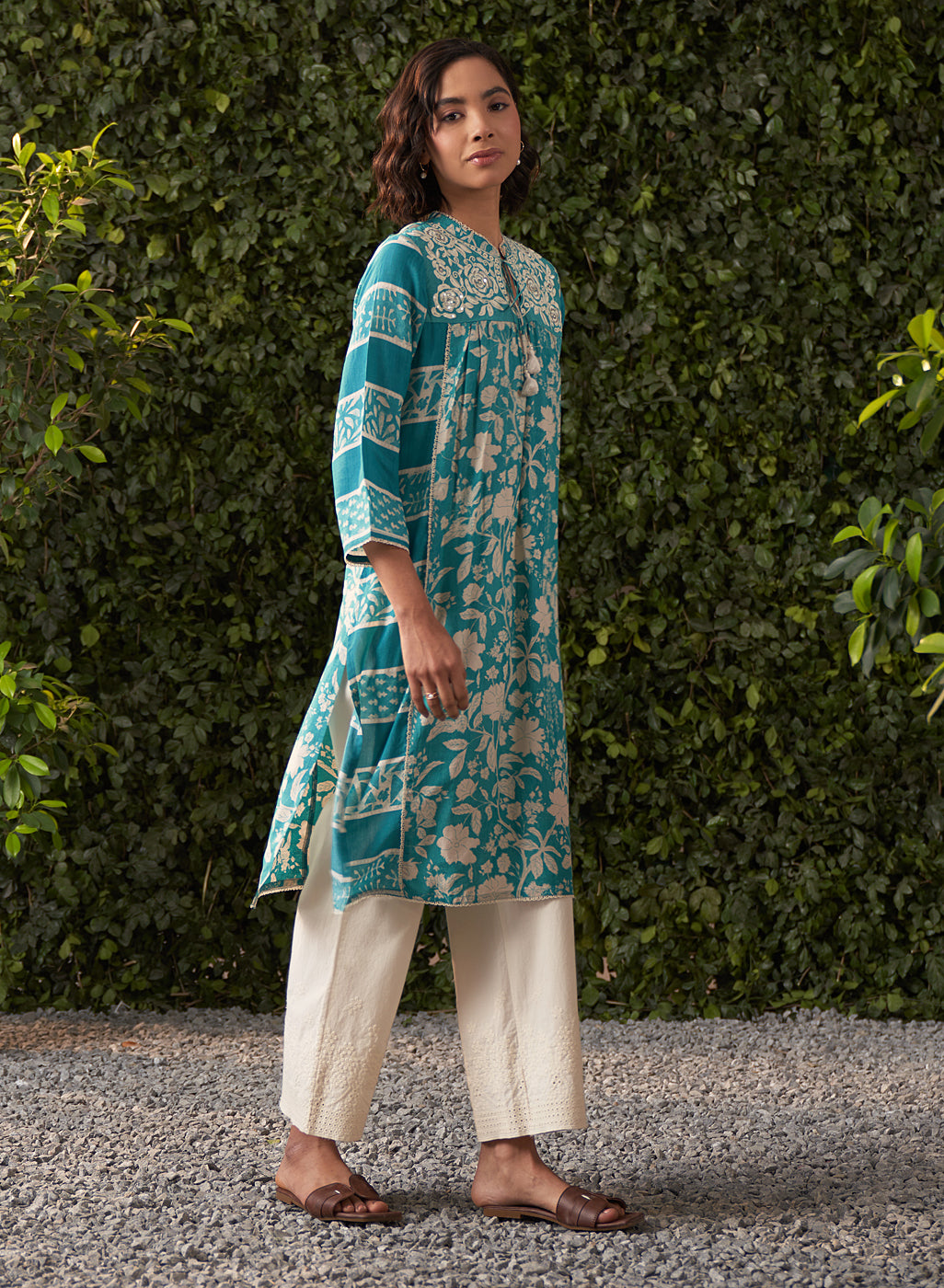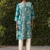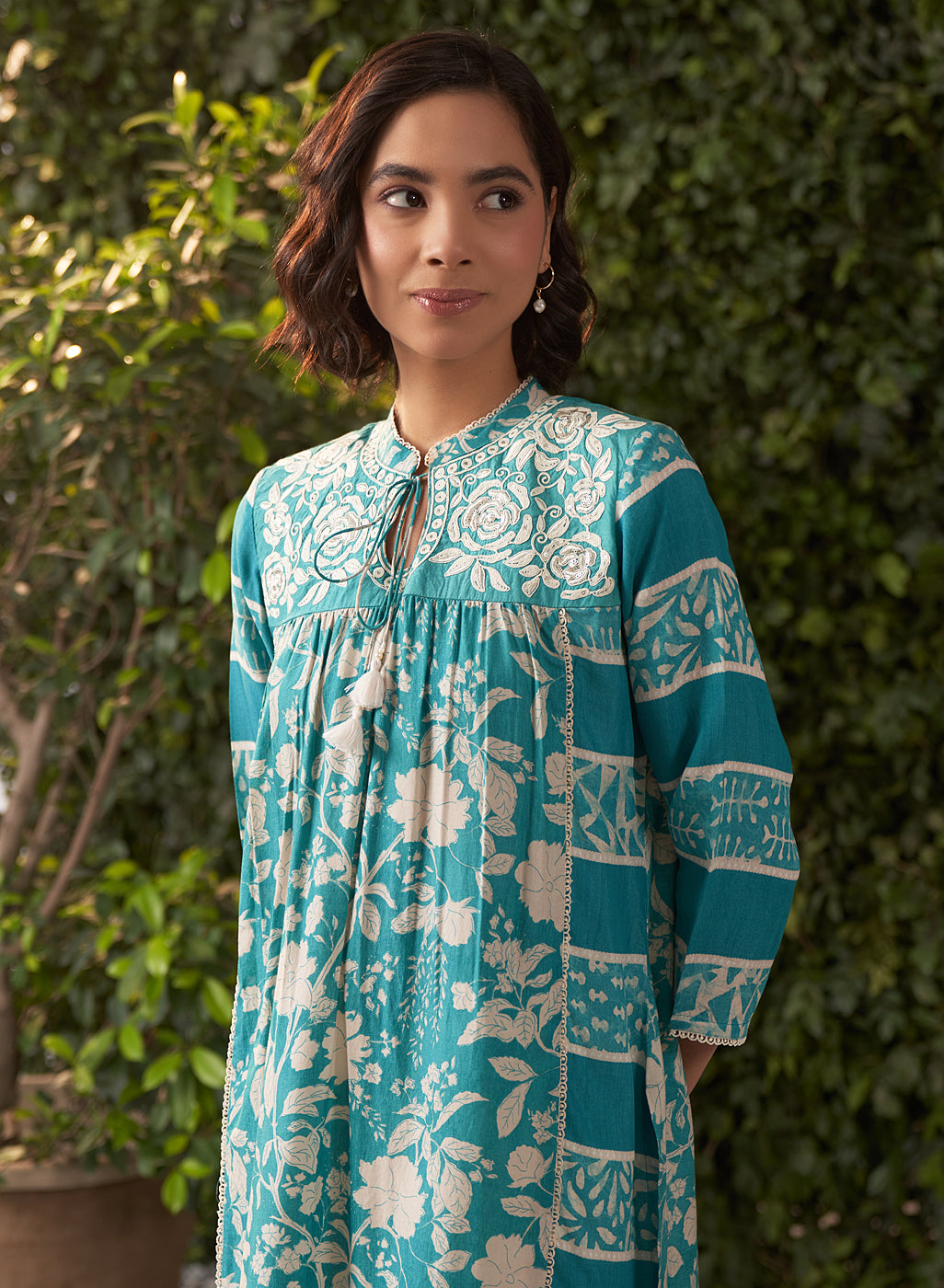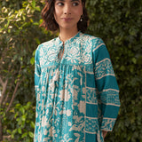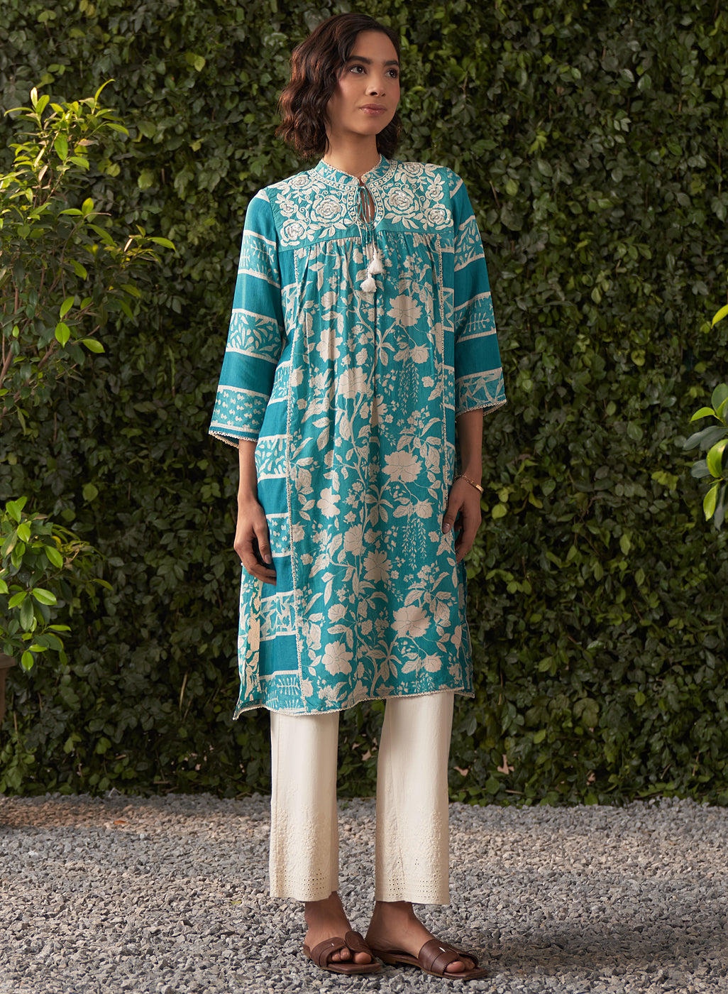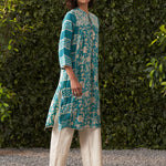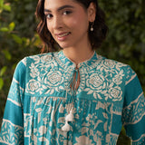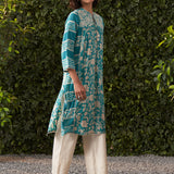 Firoza Blue Printed Muslin A-line Kurta for Women