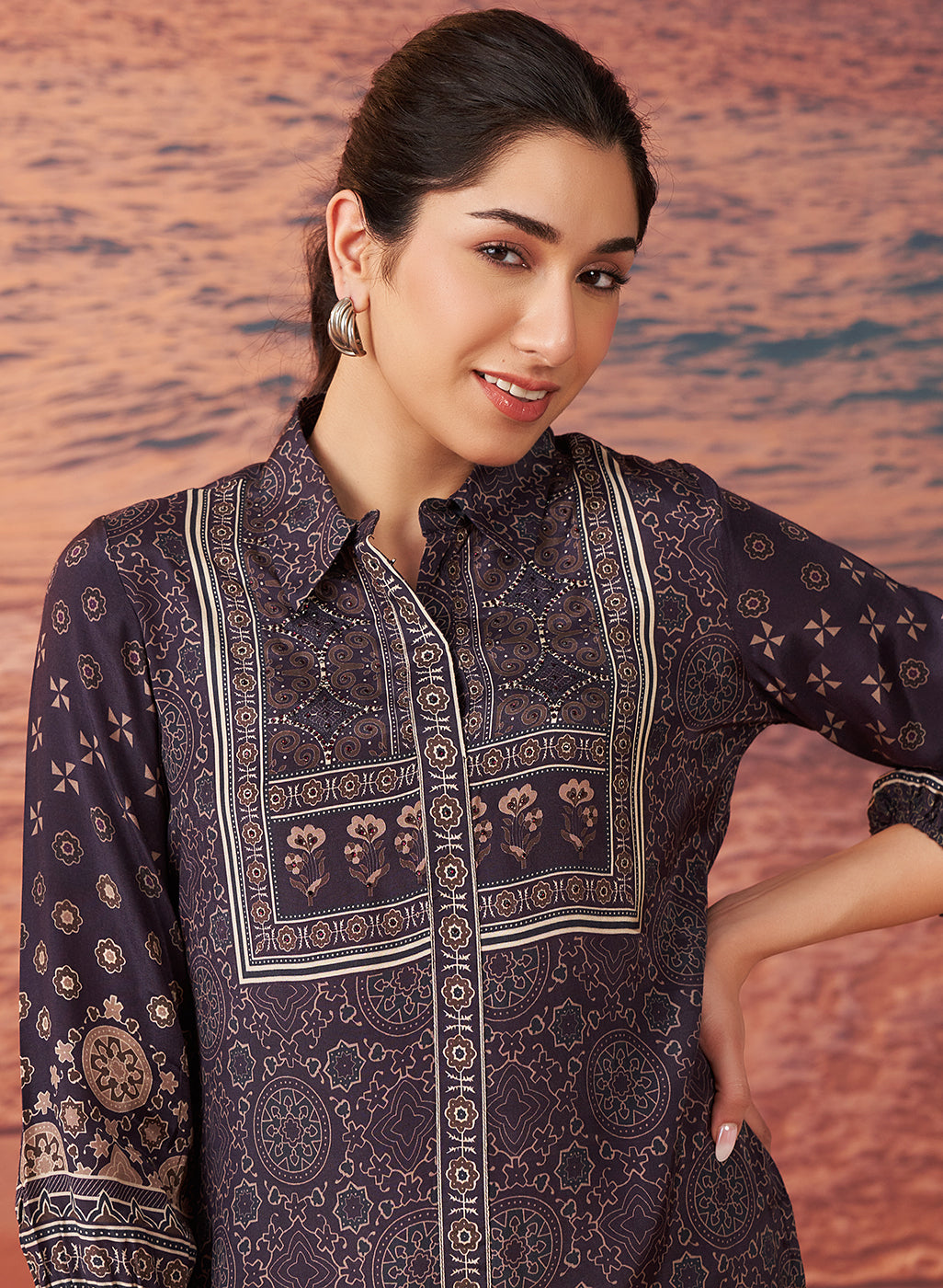 This Flora long kurta in luxurious viscose shantoon offers an exceptional balance of style and comfort. The rich Mughal floral print stretches across the fabric, bringing a sophisticated and bold aesthetic. The neckline is adorned with sparkling rhinestone embellishments.