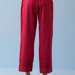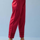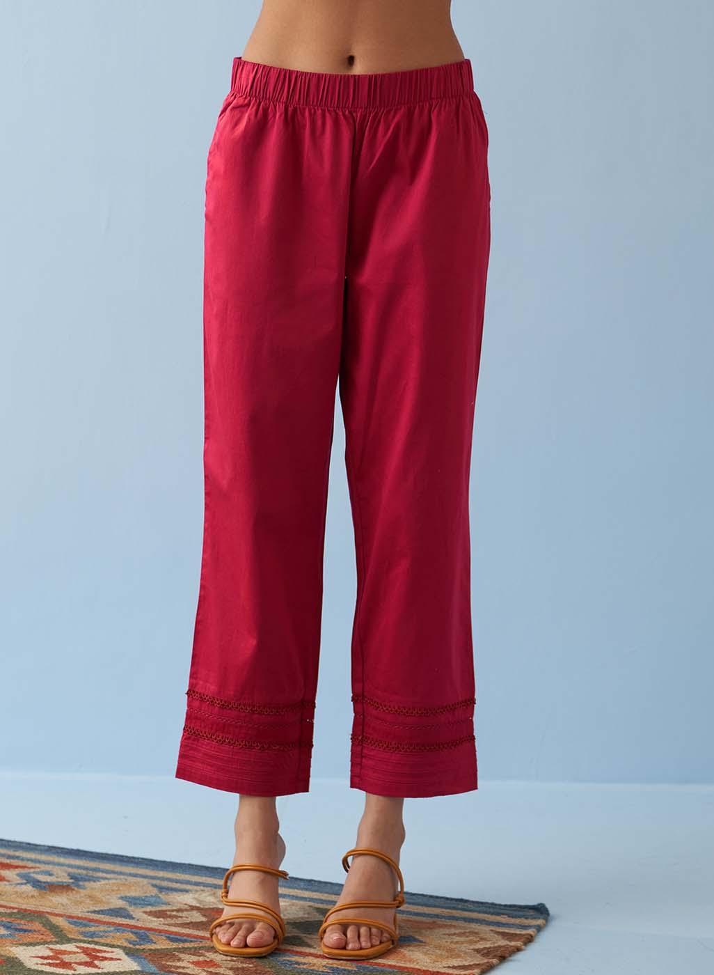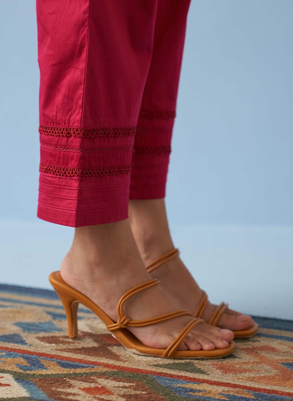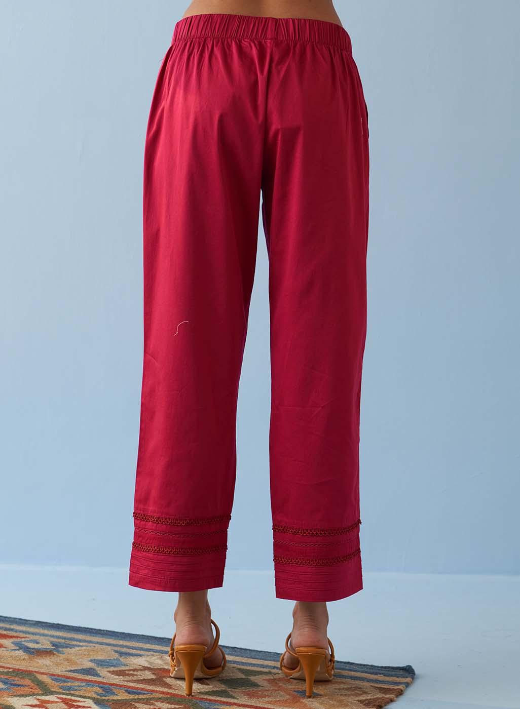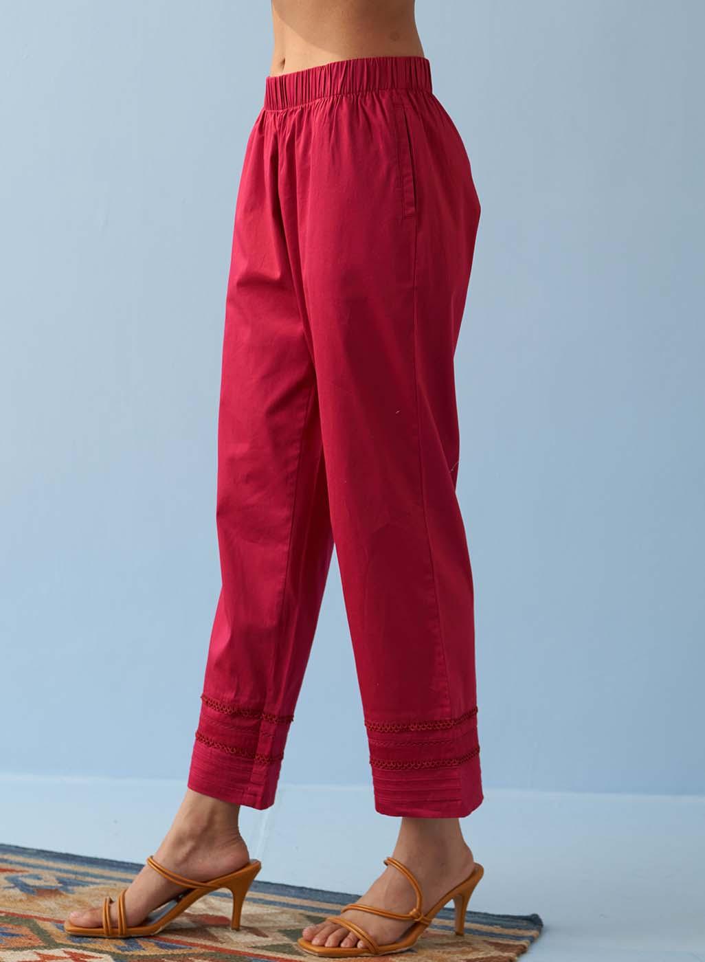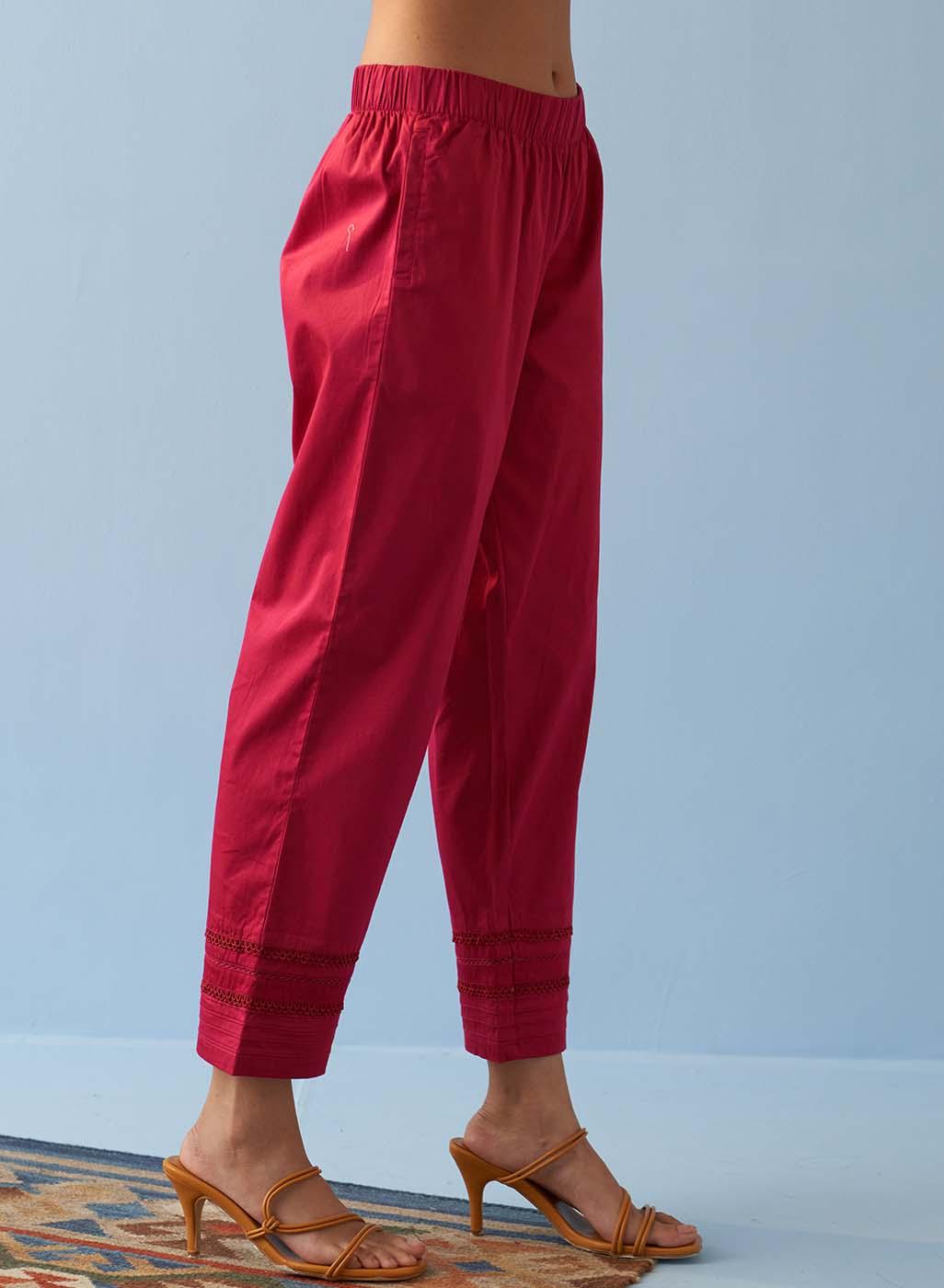 The Fuchsia Straight Fit Pants with Decorative Lace Work offer a stylish and flattering look. These pants are made of high-quality fabric and feature intricate lace work that adds an elegant touch. They are perfect for special occasions and for casual, everyday wear.