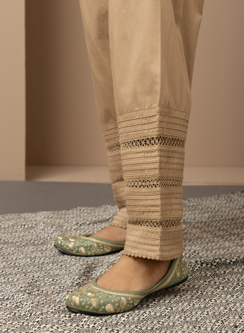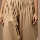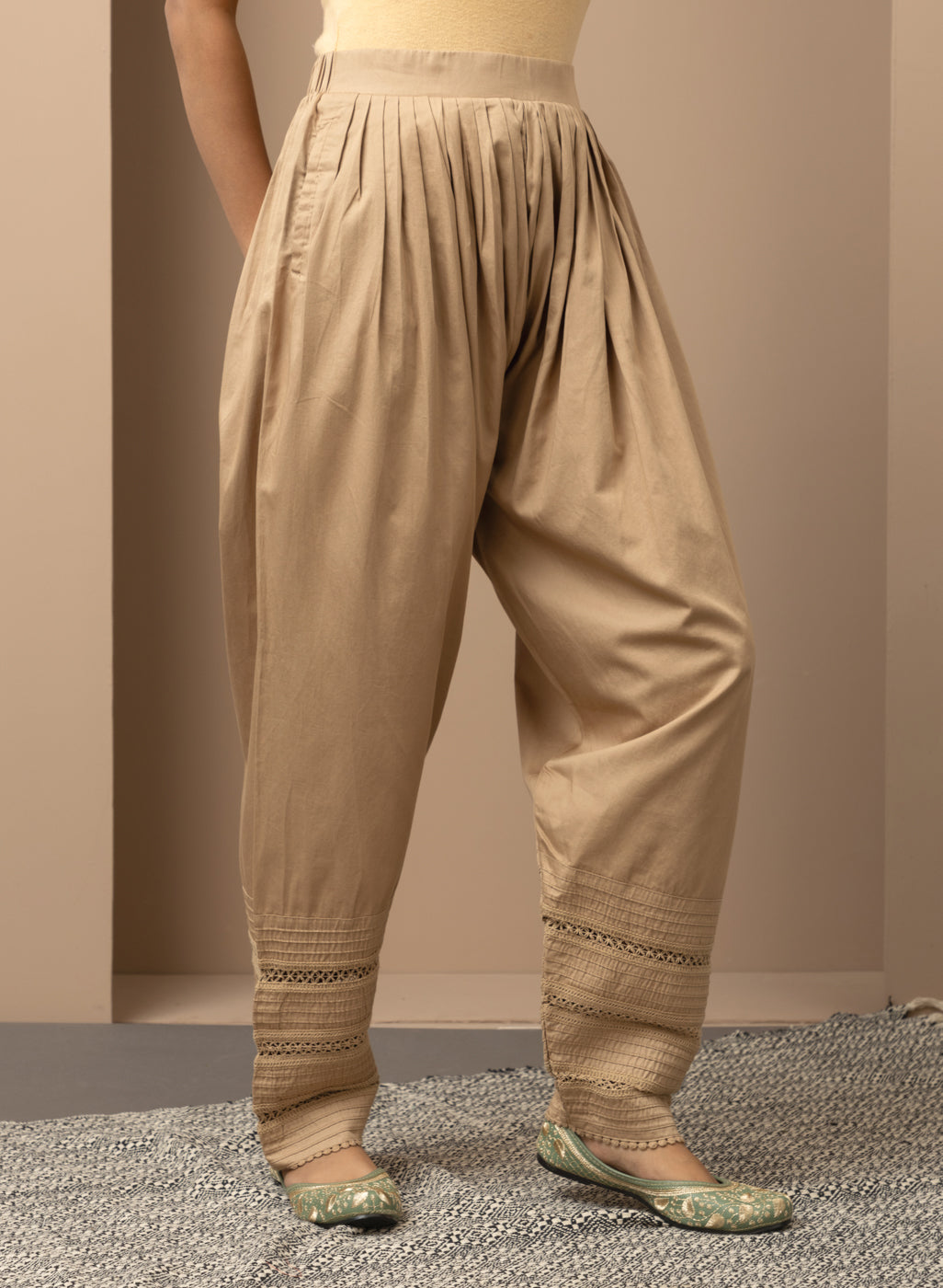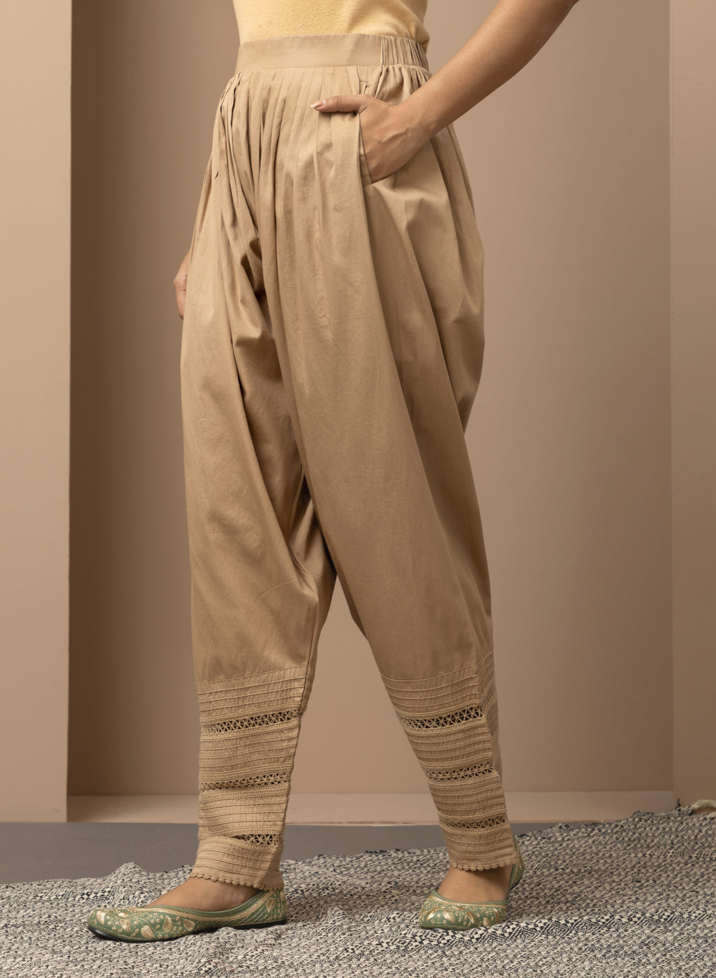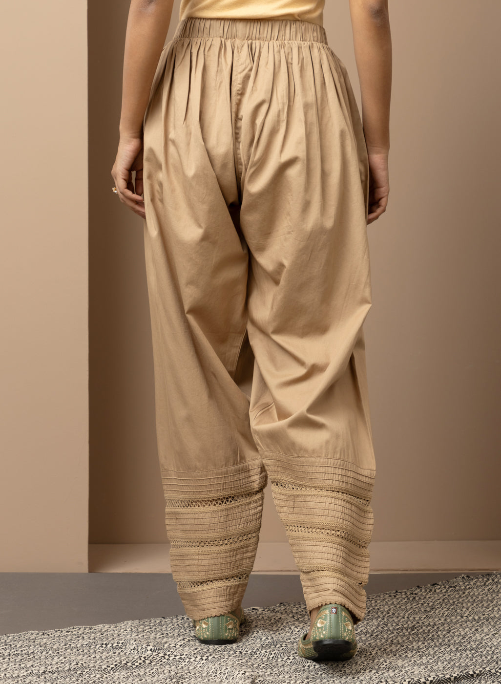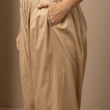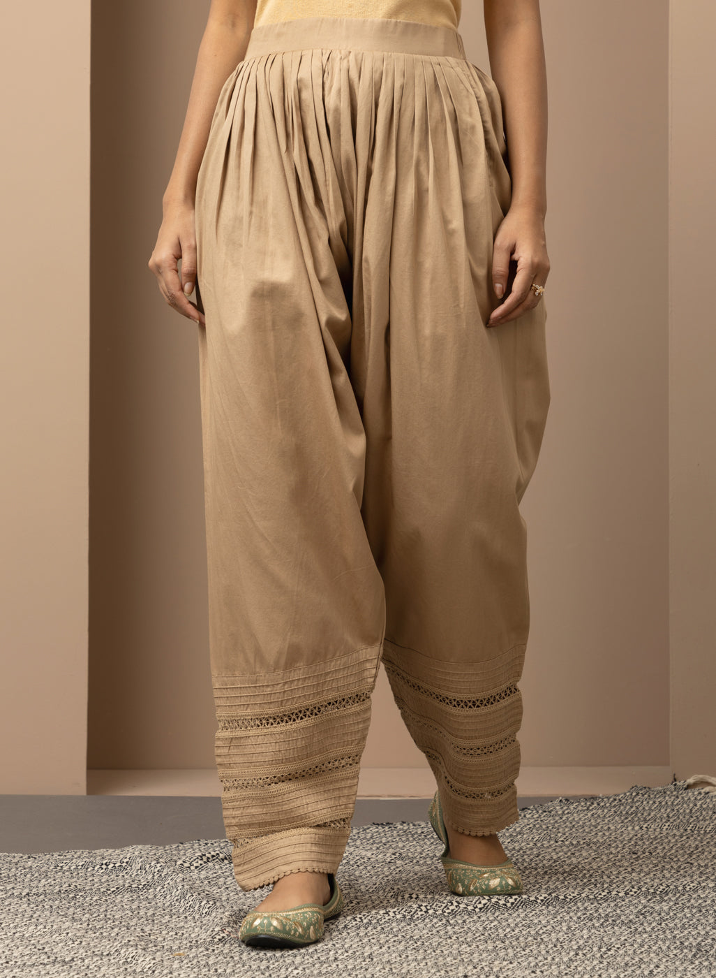 This golden salwar is made of luxurious fabric with a bottom hem adorned with intricate lace work. The design combines classic details with modern comfort and style, making it an immensely fashionable choice.
