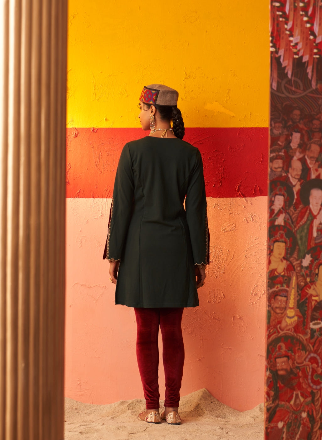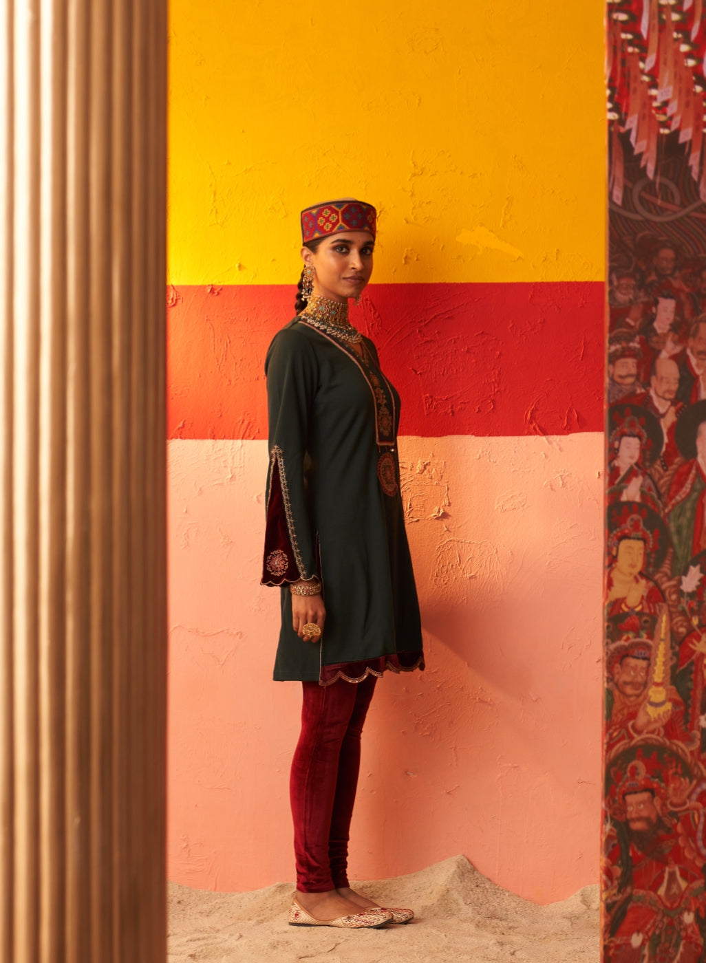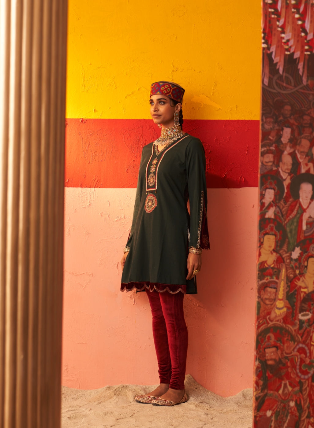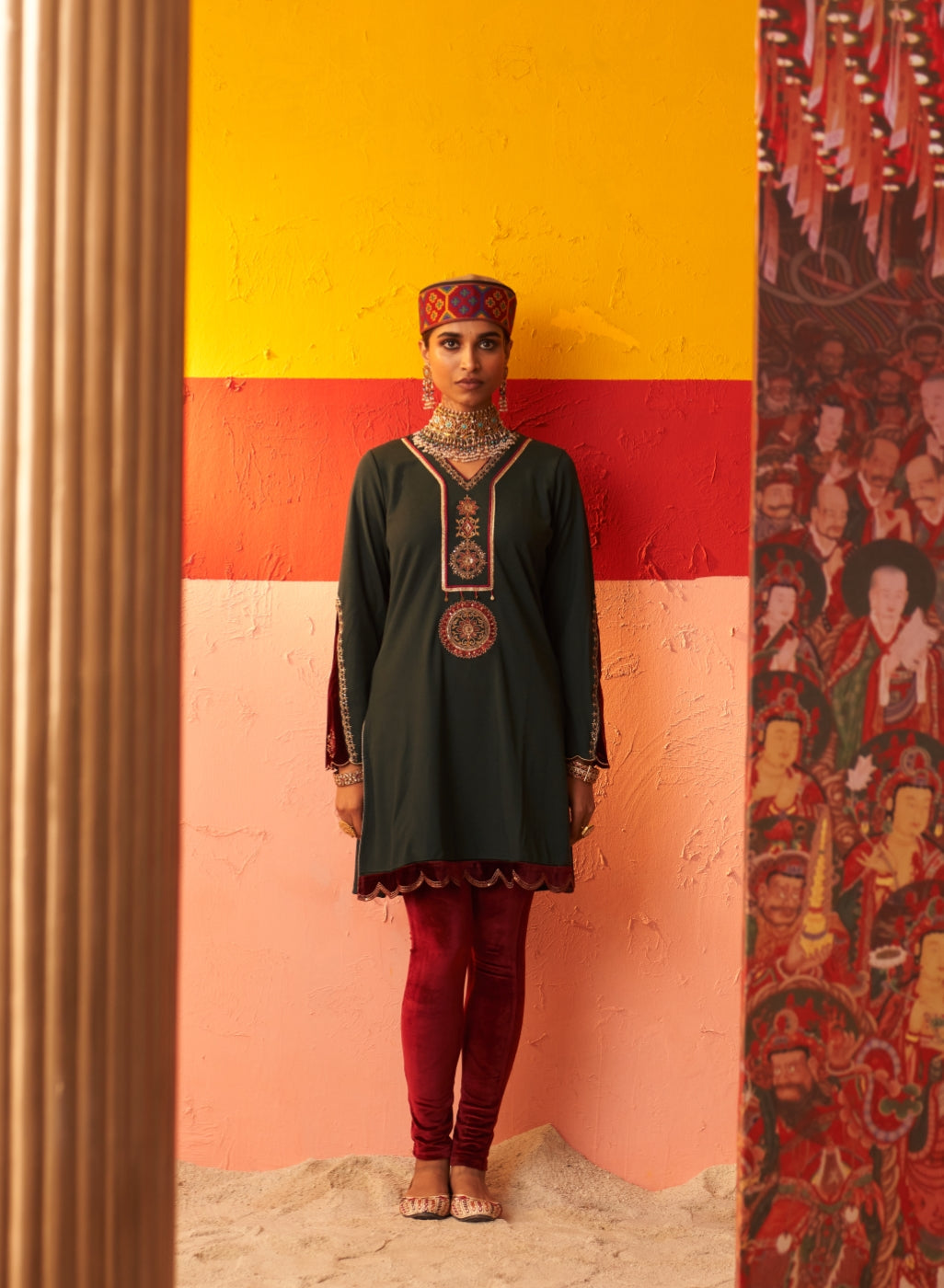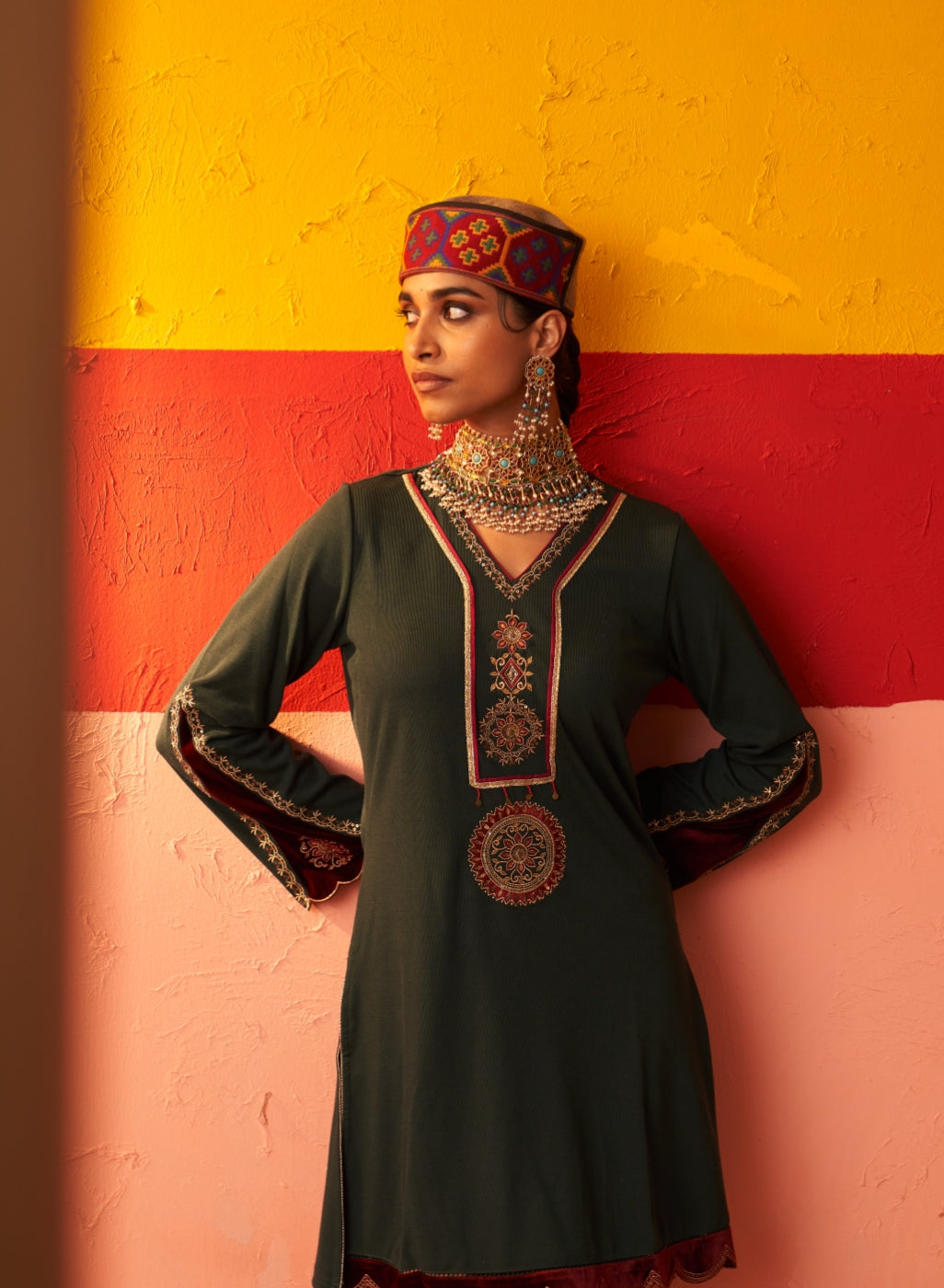 • Exude grace and charm in this beautiful woollen kurti with velvet inserts that will keep you warm and cosy all day long.