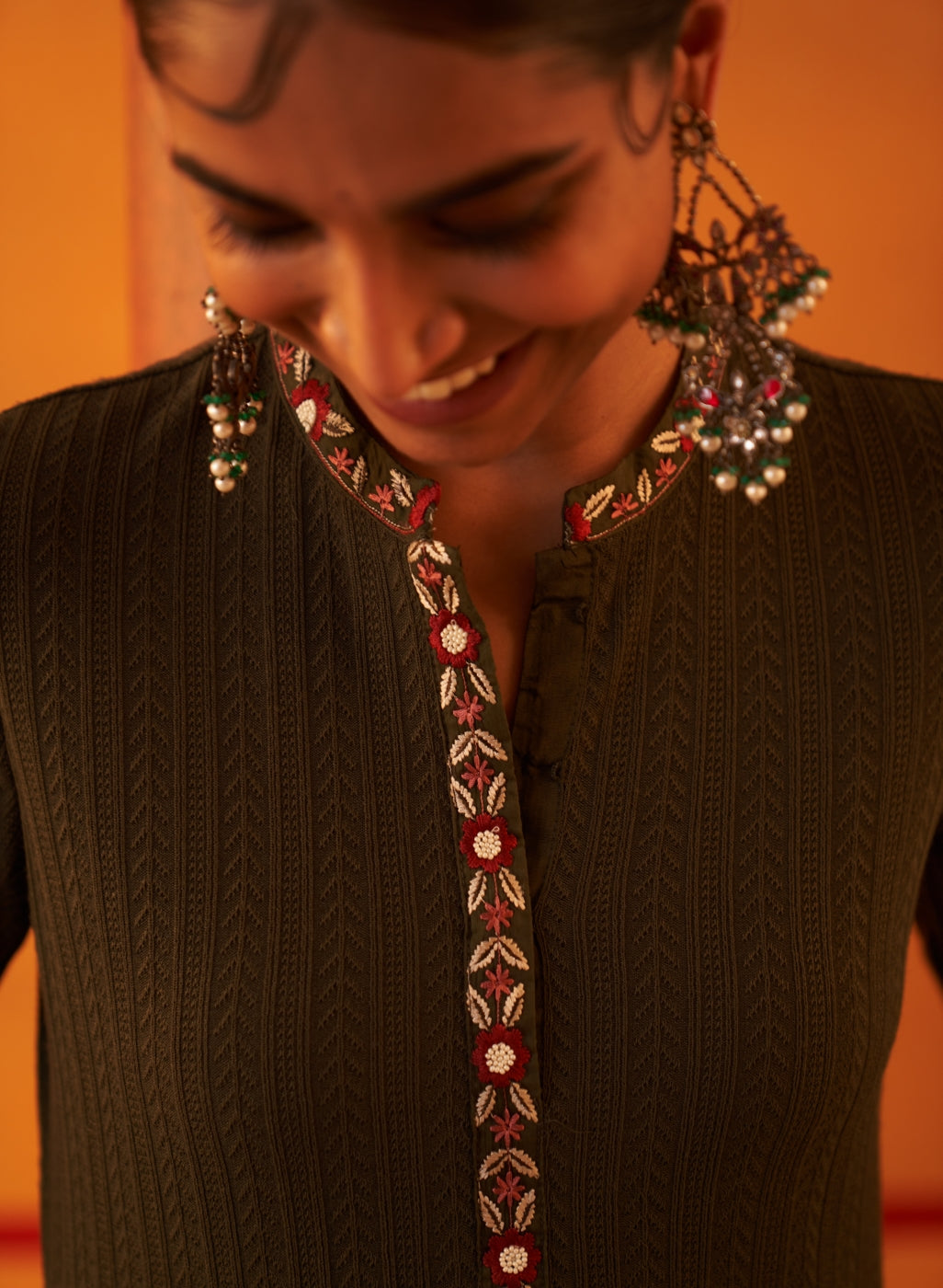• This jacquard kurta features intricate thread work on the mandarin collar.