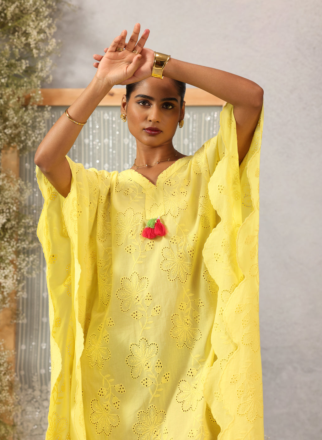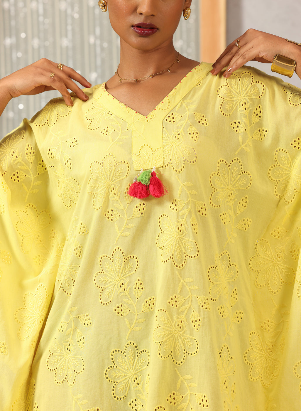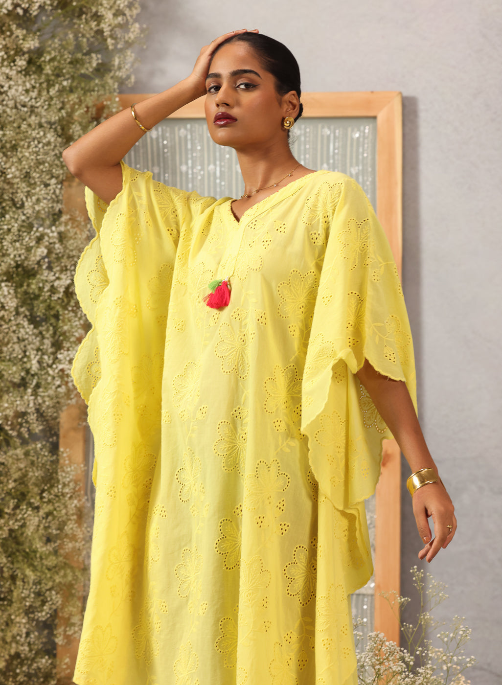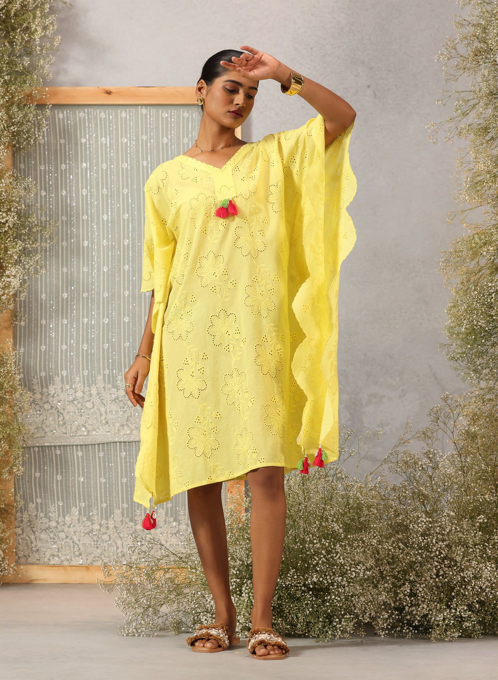 As light as a whisper and soft as a summer breeze, this kaftan in lemon yellow captures the quiet joy of easy dressing. Crafted in breathable cotton with delicate all-over schiffli work, it drapes gently — offering movement, grace, and effortless charm. Asymmetric scalloped edges and pearl-draped tassels at the neckline and hem lend a handcrafted poetry to the piece, making it perfect for sunlit hours that flow slow and free.
