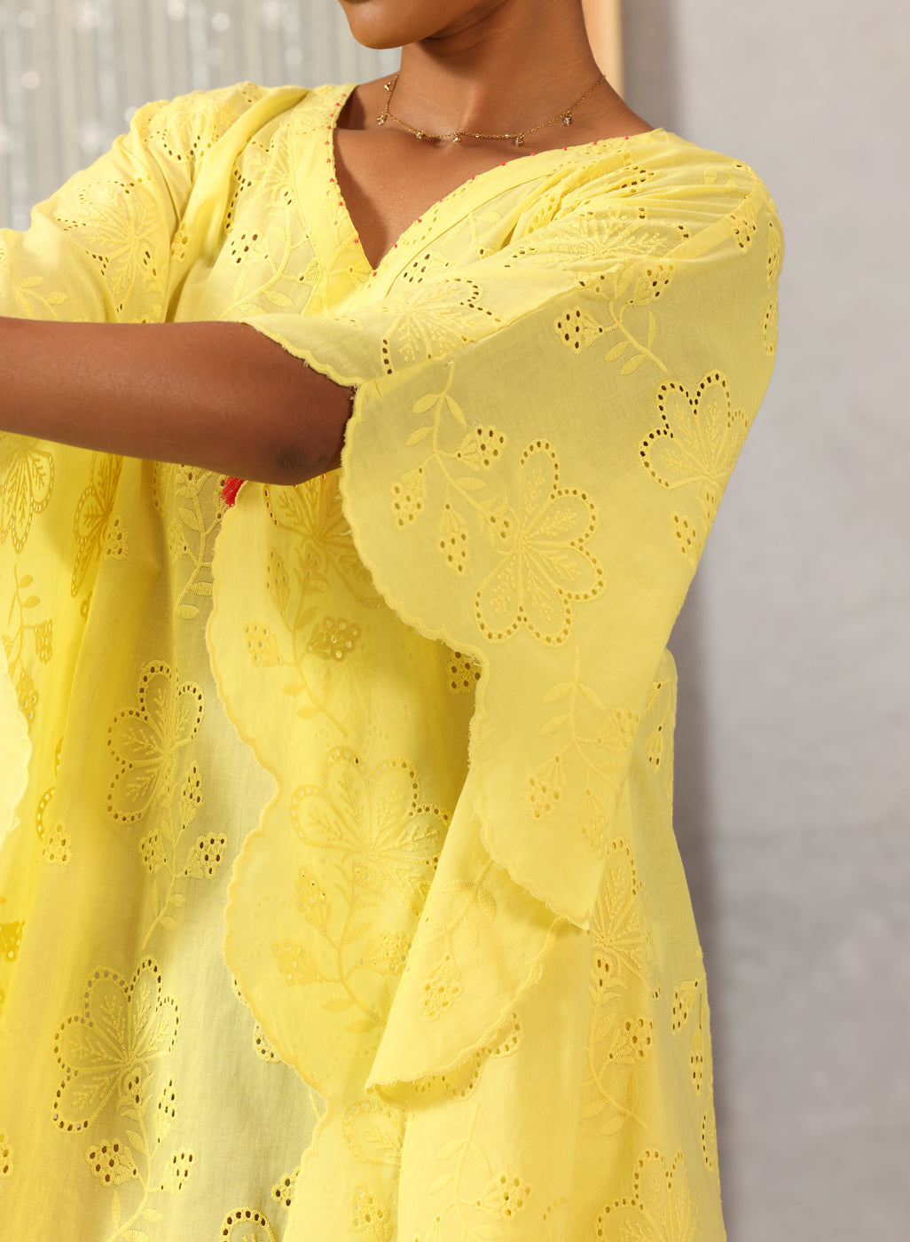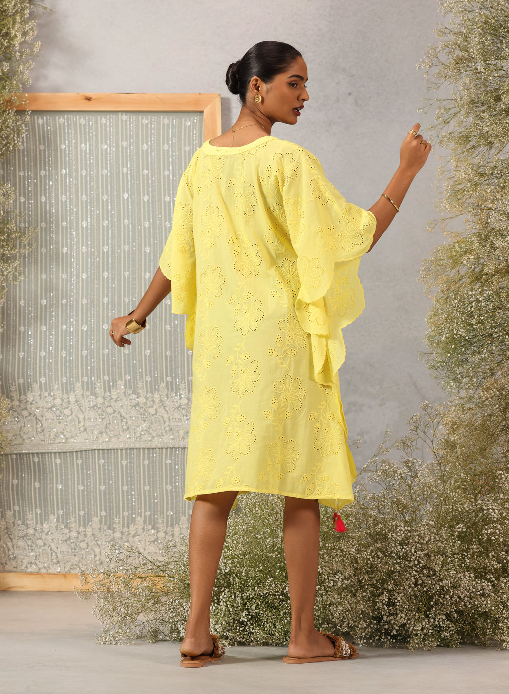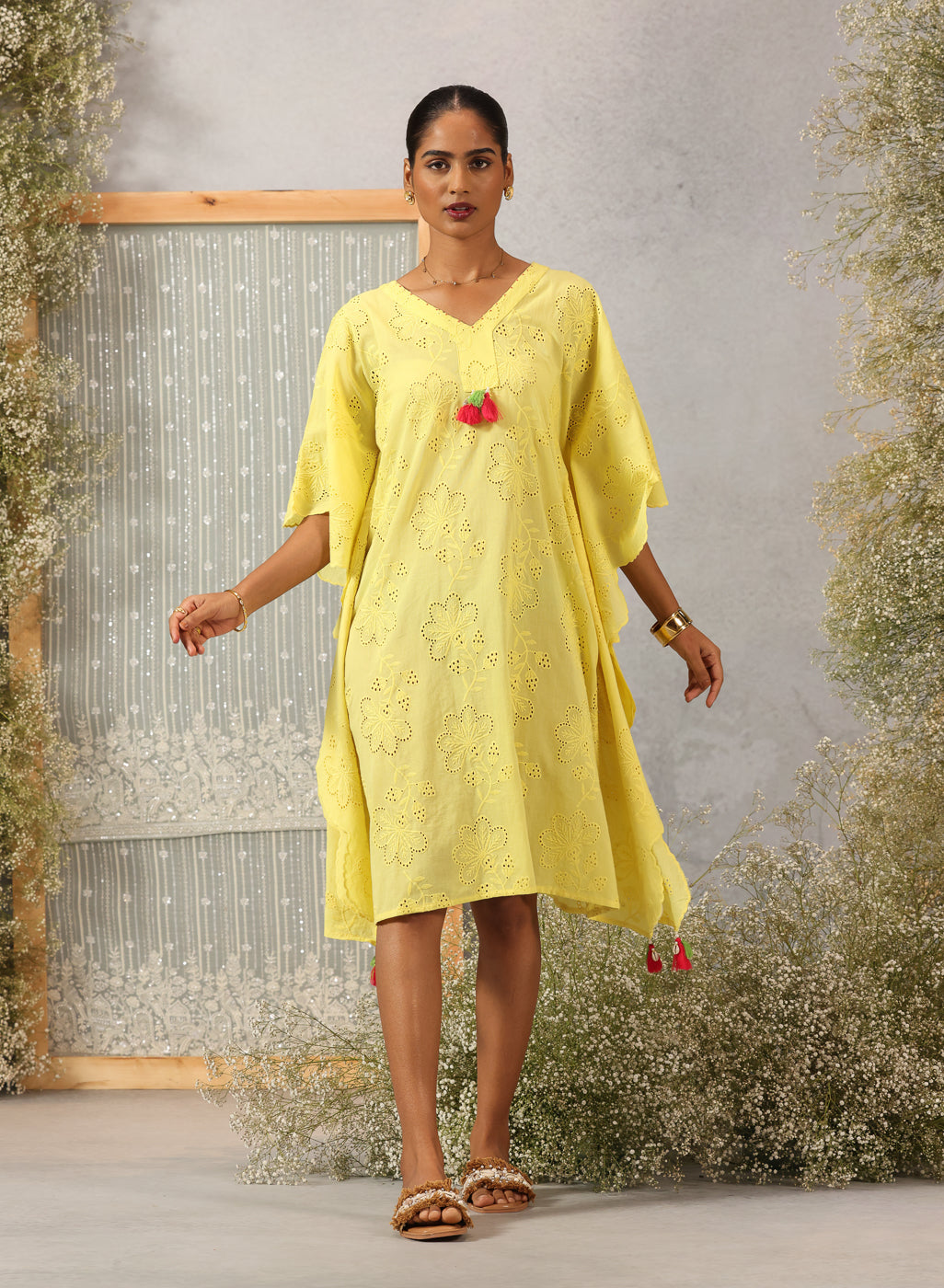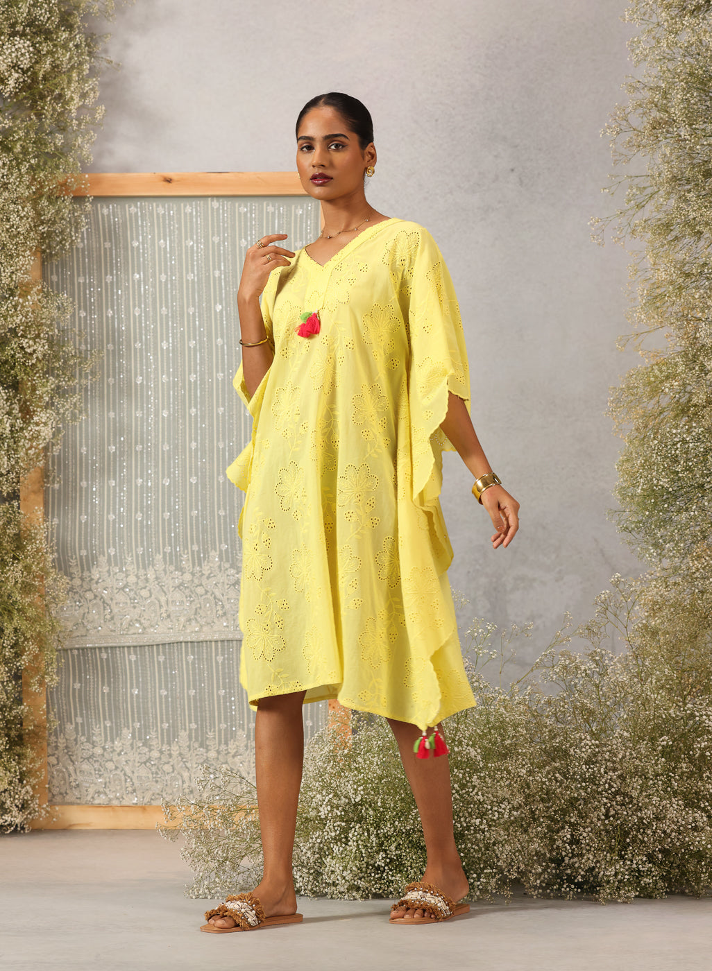 As light as a whisper and soft as a summer breeze, this kaftan in lemon yellow captures the quiet joy of easy dressing. Crafted in breathable cotton with delicate all-over schiffli work, it drapes gently — offering movement, grace, and effortless charm. Asymmetric scalloped edges and pearl-draped tassels at the neckline and hem lend a handcrafted poetry to the piece, making it perfect for sunlit hours that flow slow and free.