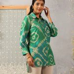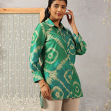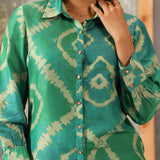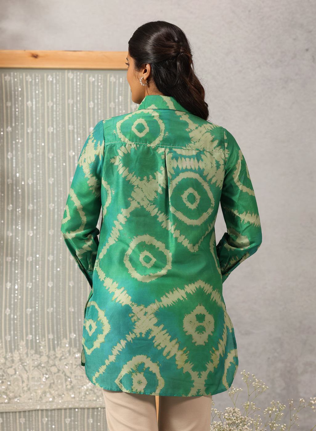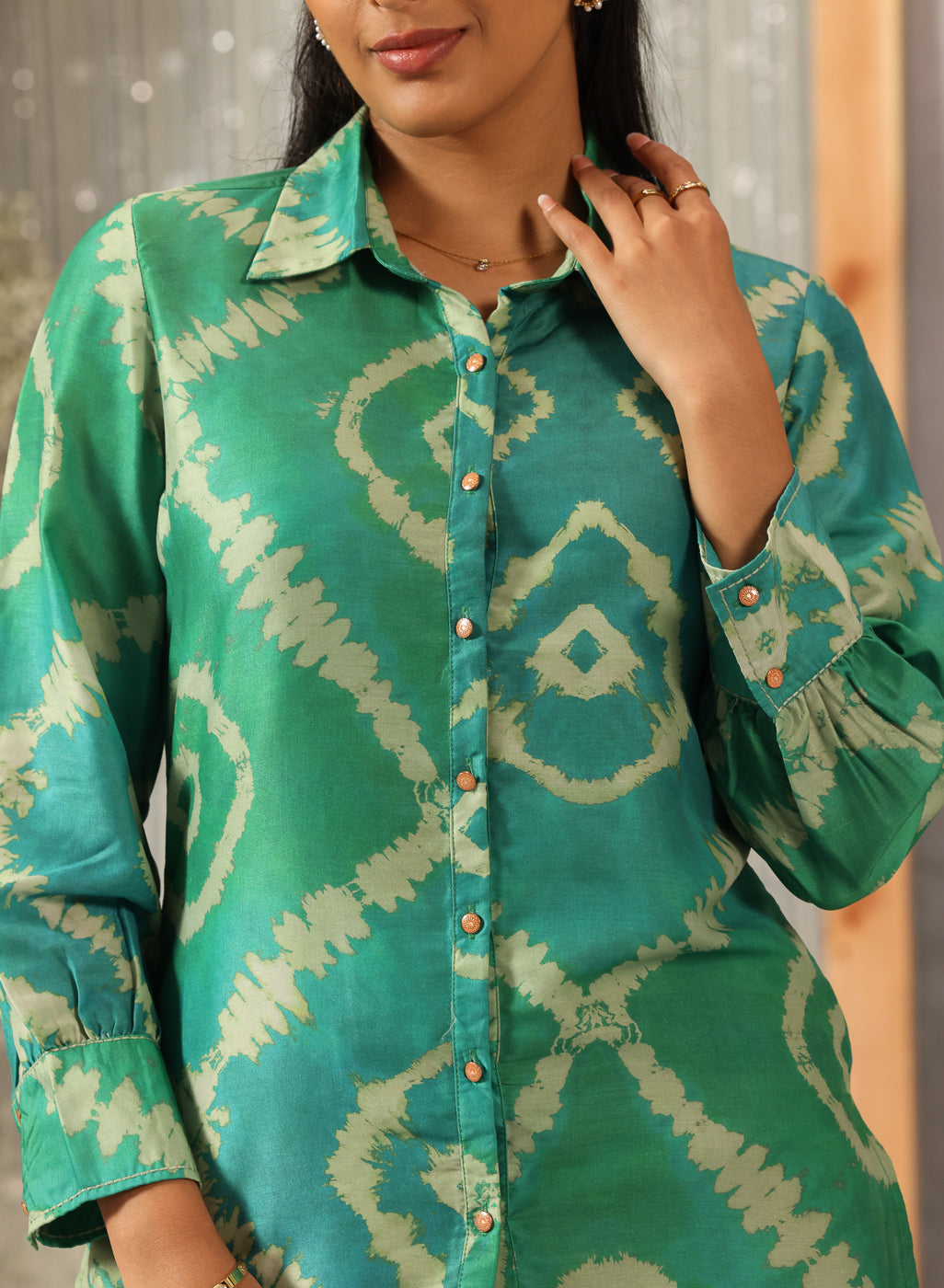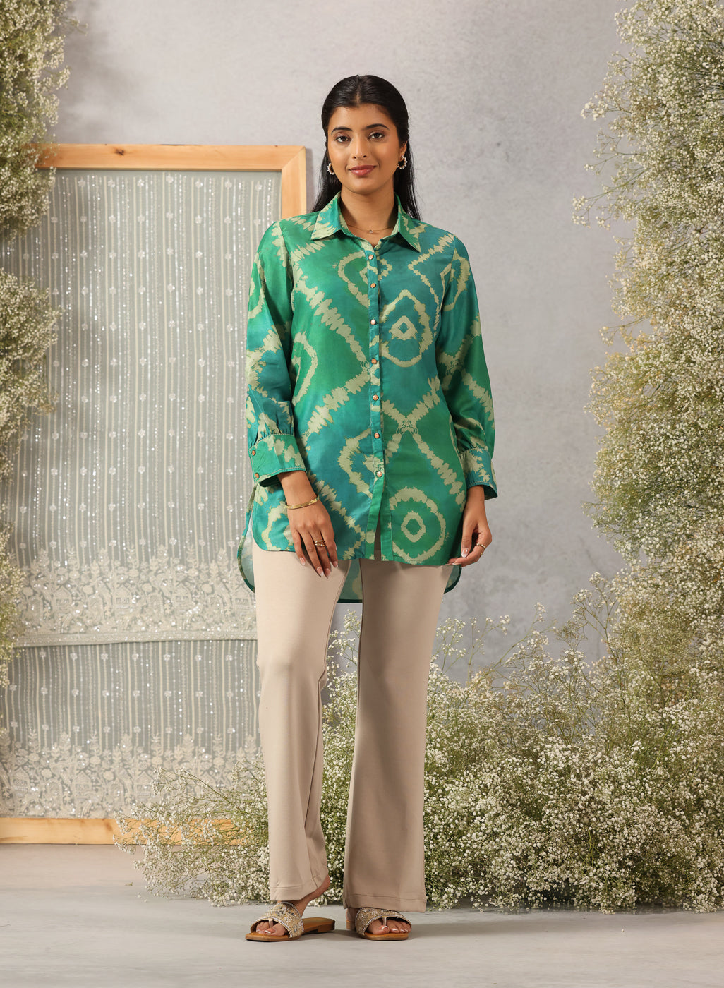 Fresh as new leaves and calm as morning light, this spring green shirt brings an airy charm to everyday dressing. With an all-over tie-dye inspired print, the silhouette flows in soft, breathable fabric with a gentle sheen — effortless yet eye-catching Structured with a collar neck and full gathered sleeves, this shirt brings together playful details and elevated polish.