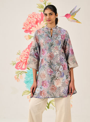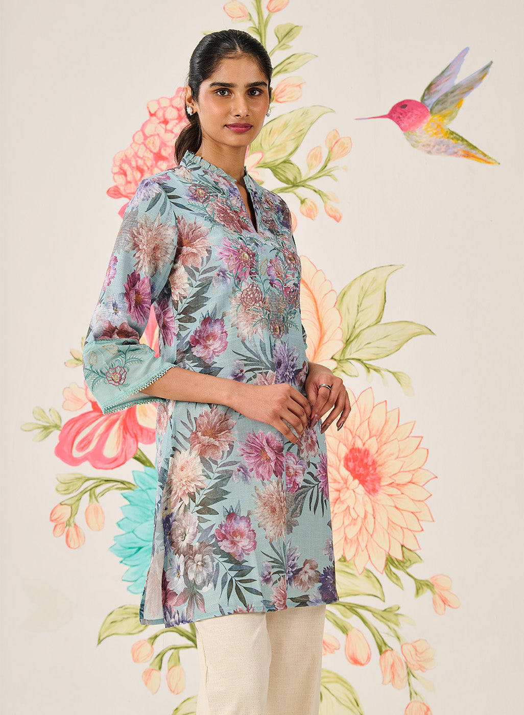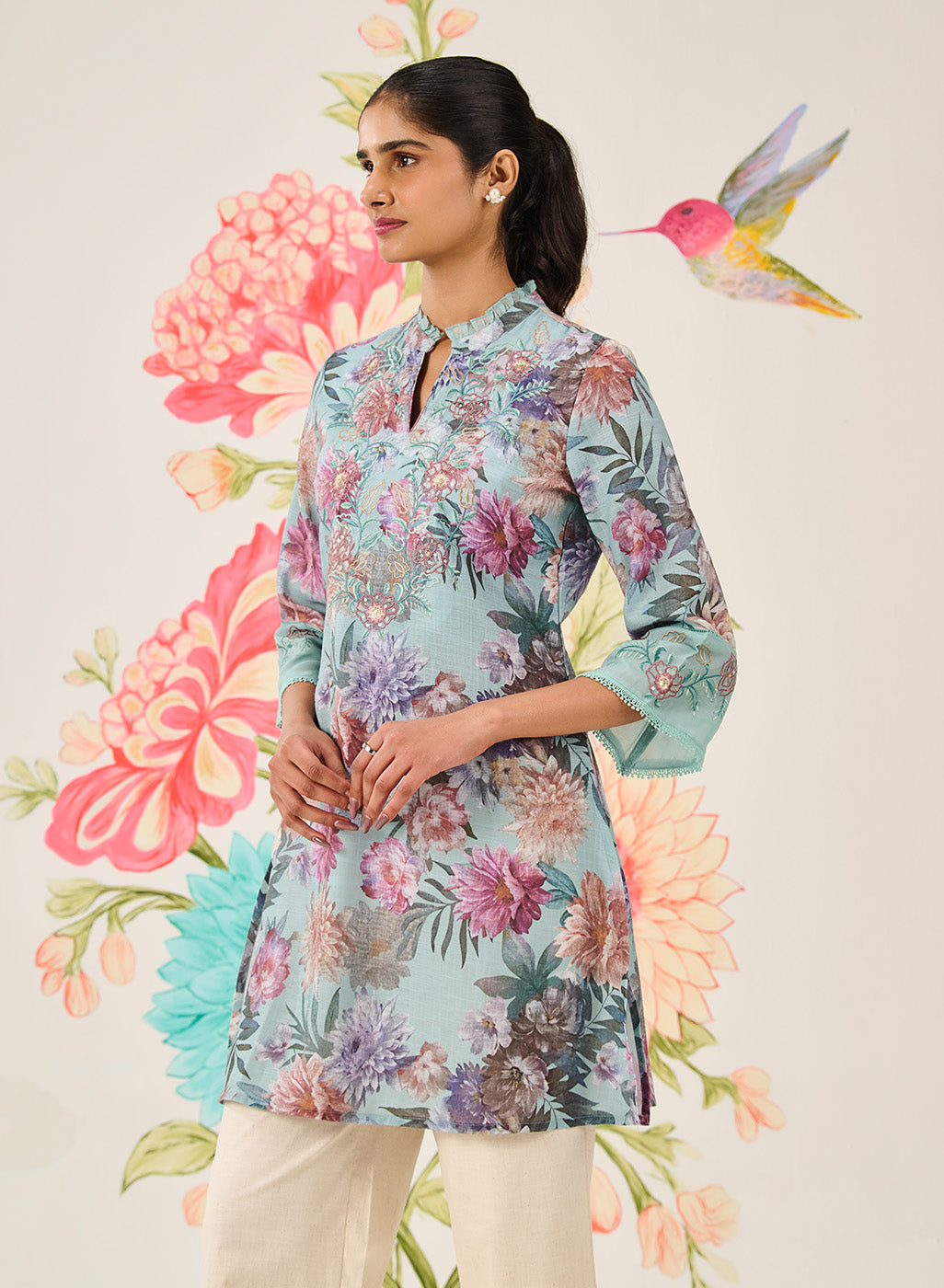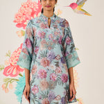 In a refreshing light blue hue, this printed kurti brings effortless elegance to your wardrobe. Crafted in a nylon-rayon-linen blend and accented with resham embroidery and sequin highlights, it offers a light and graceful charm—perfect for festive days and intimate celebrations. Inspired by tropical floral motifs, it carries an added layer of visual appeal.