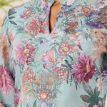 • Mandarin collar paired with romantic bell sleeves for a graceful silhouette.