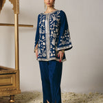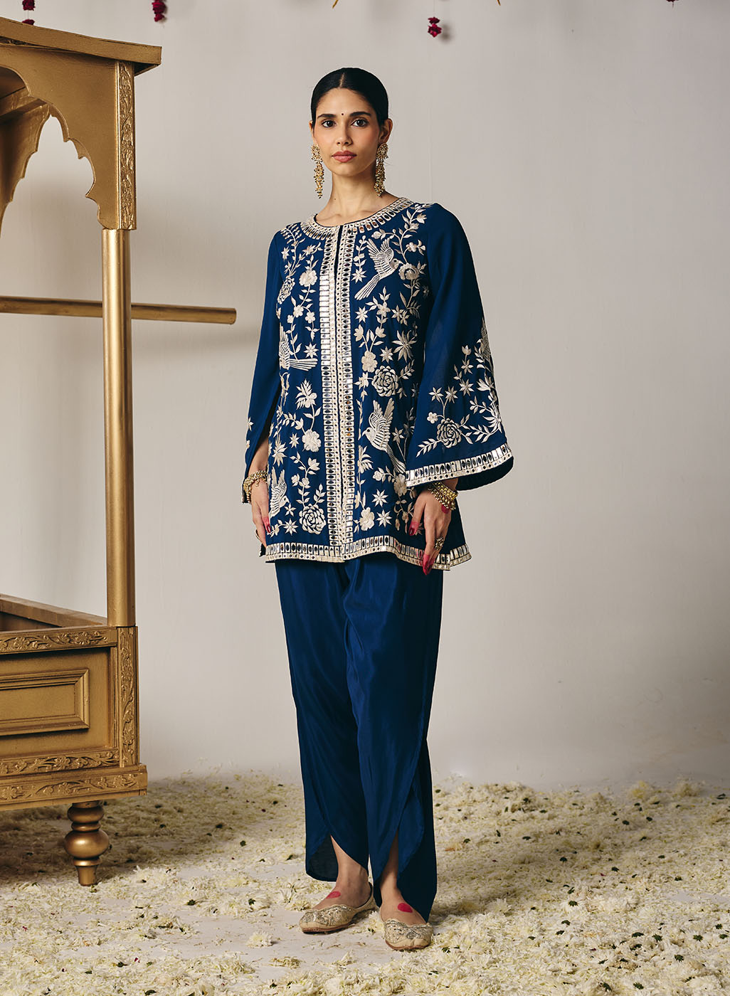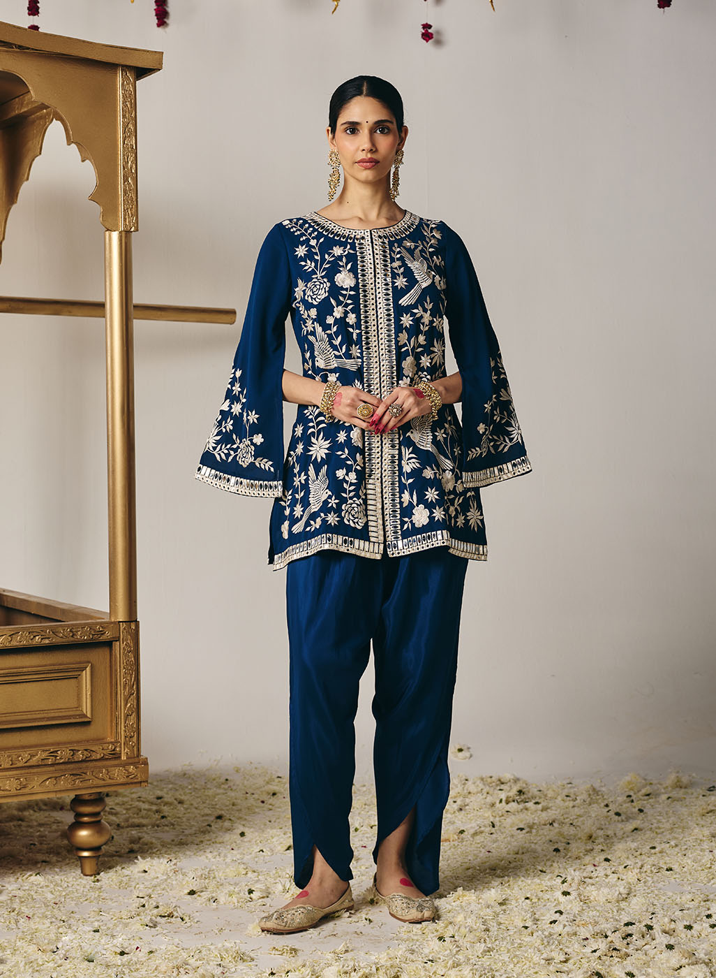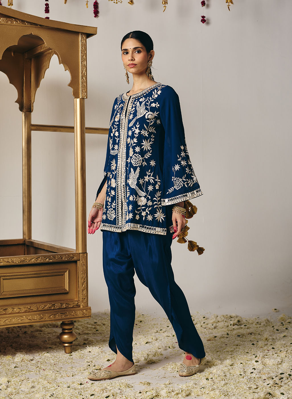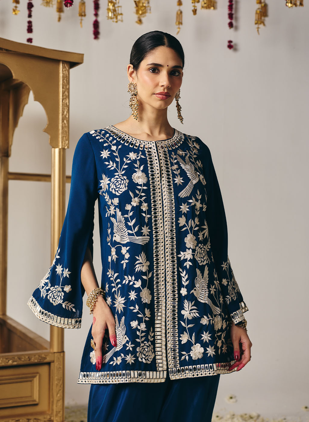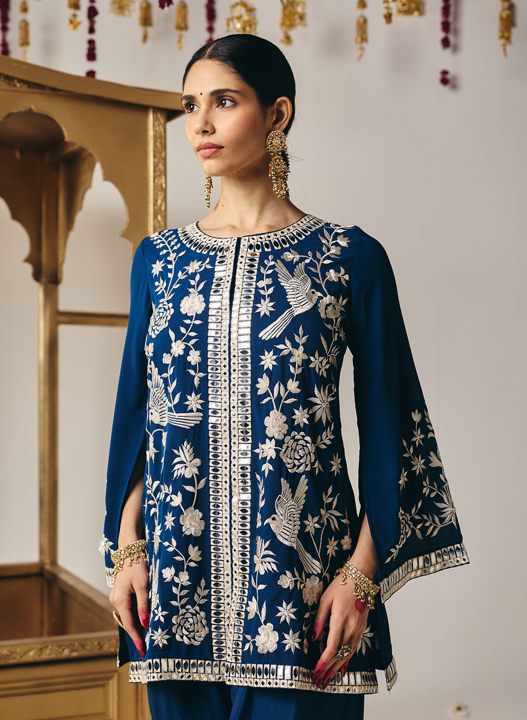 A striking ode to Mughal artistry, this vivid blue co-ord set exudes opulence. The flared georgette top is adorned with exquisite silk thread embroidery, where florals and birds entwine in Mughal-inspired motifs, accented with glimmering mirrorwork. Paired with fluid dhoti-style pants, the silhouette balances regal craftsmanship with modern ease, making it an ensemble that is both dramatic and effortlessly elegant.