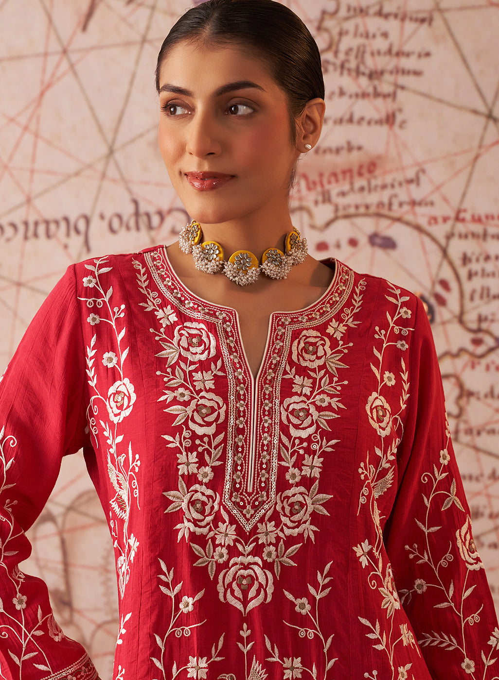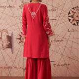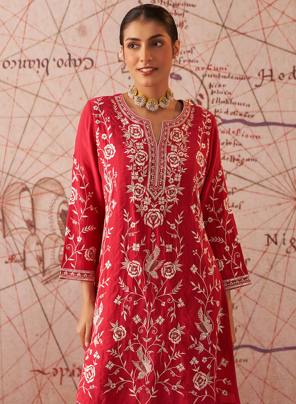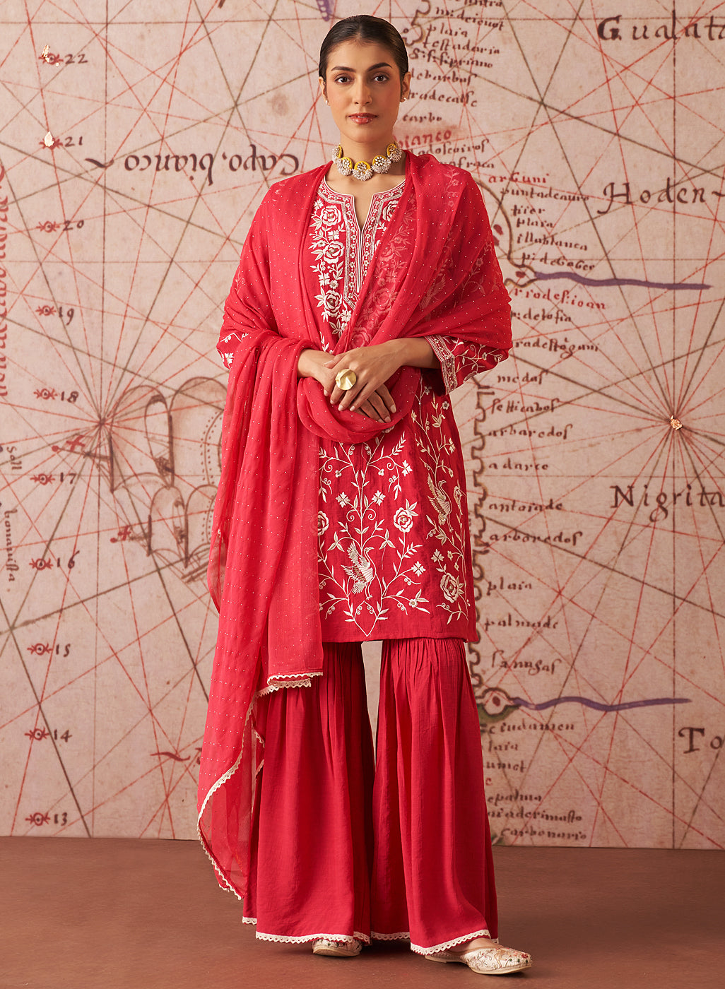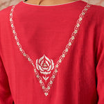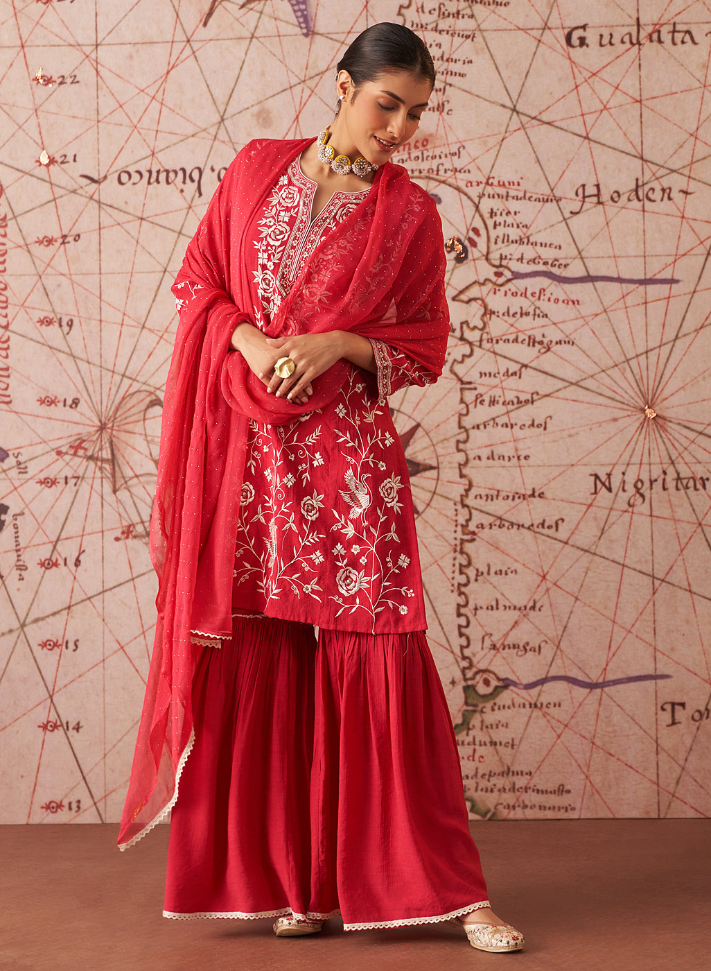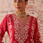 Joy Carmine Red Embroidered Rayon Salwar Suit Set with Dupatta