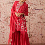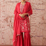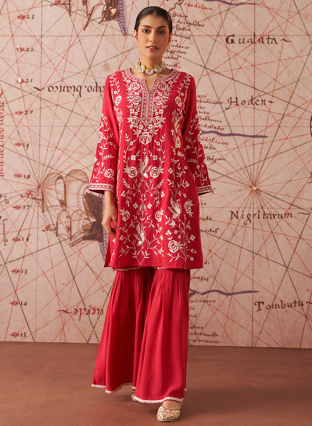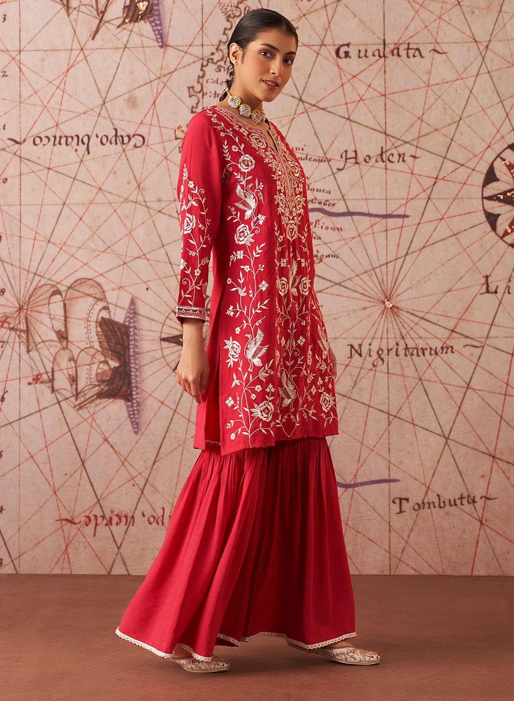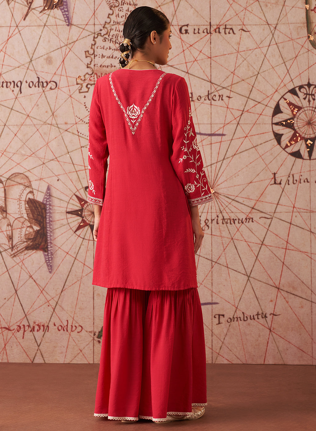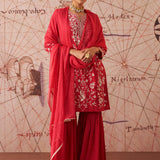 Joy Carmine Red Embroidered Rayon Salwar Suit Set with Dupatta