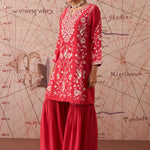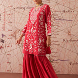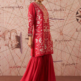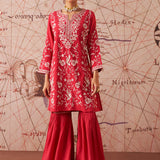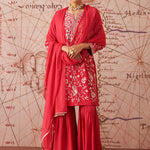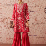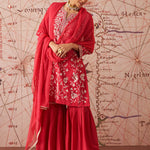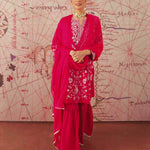 •The exquisite resham embroidery with sequin highlights is what sets this set apart. The contrast piping adds more detail to its design.