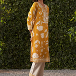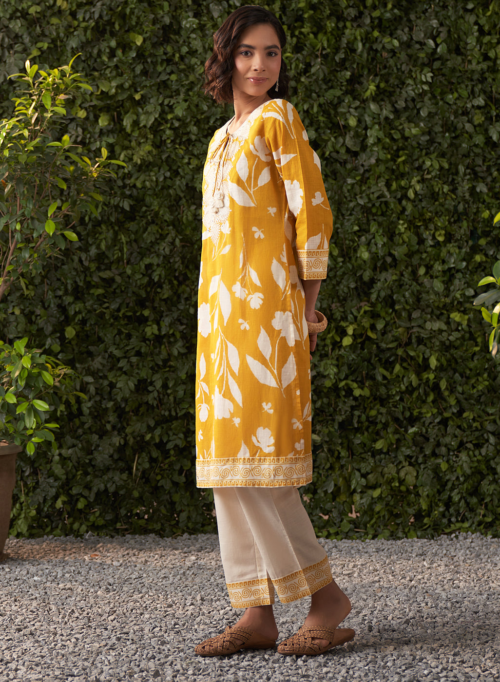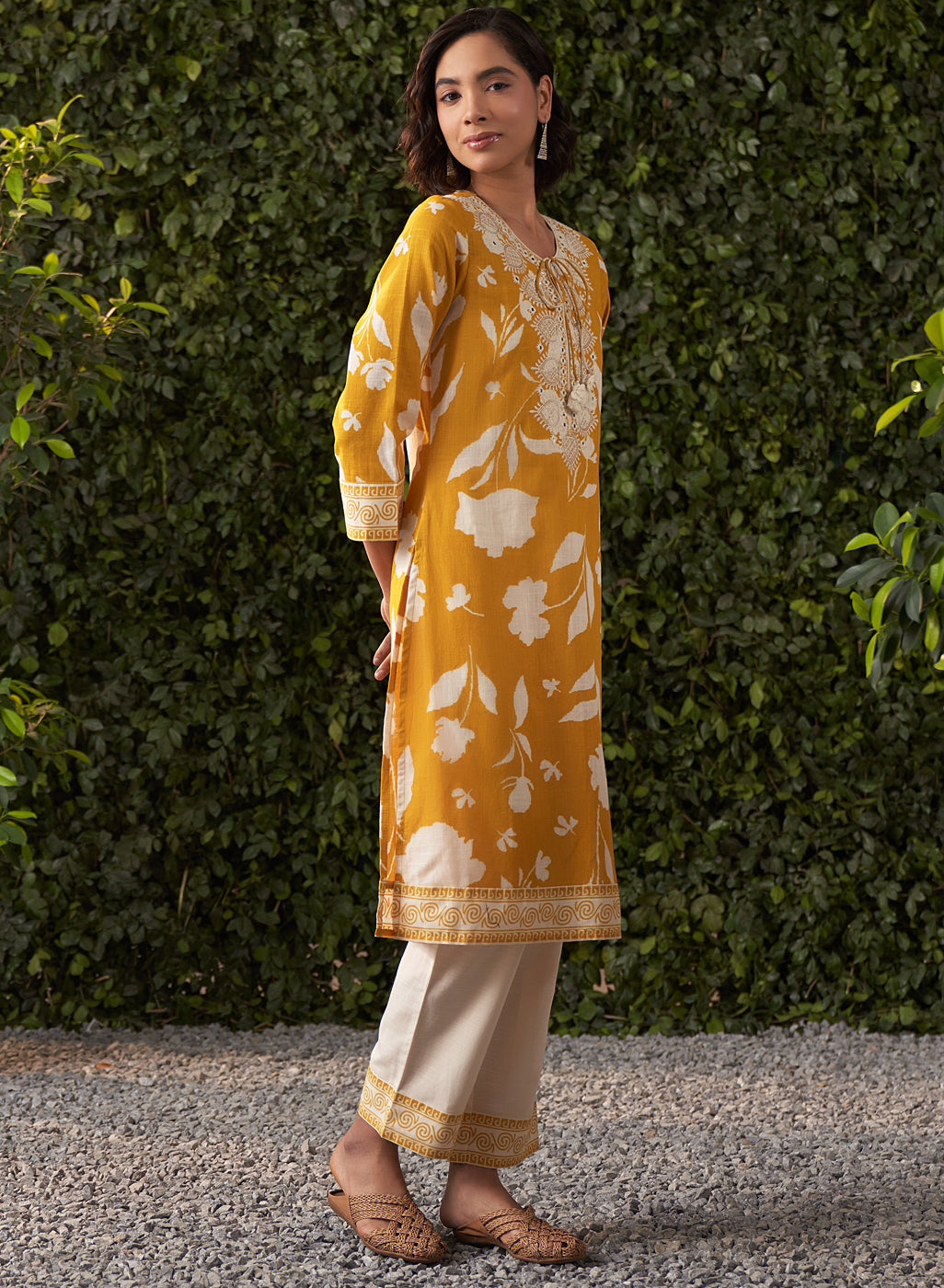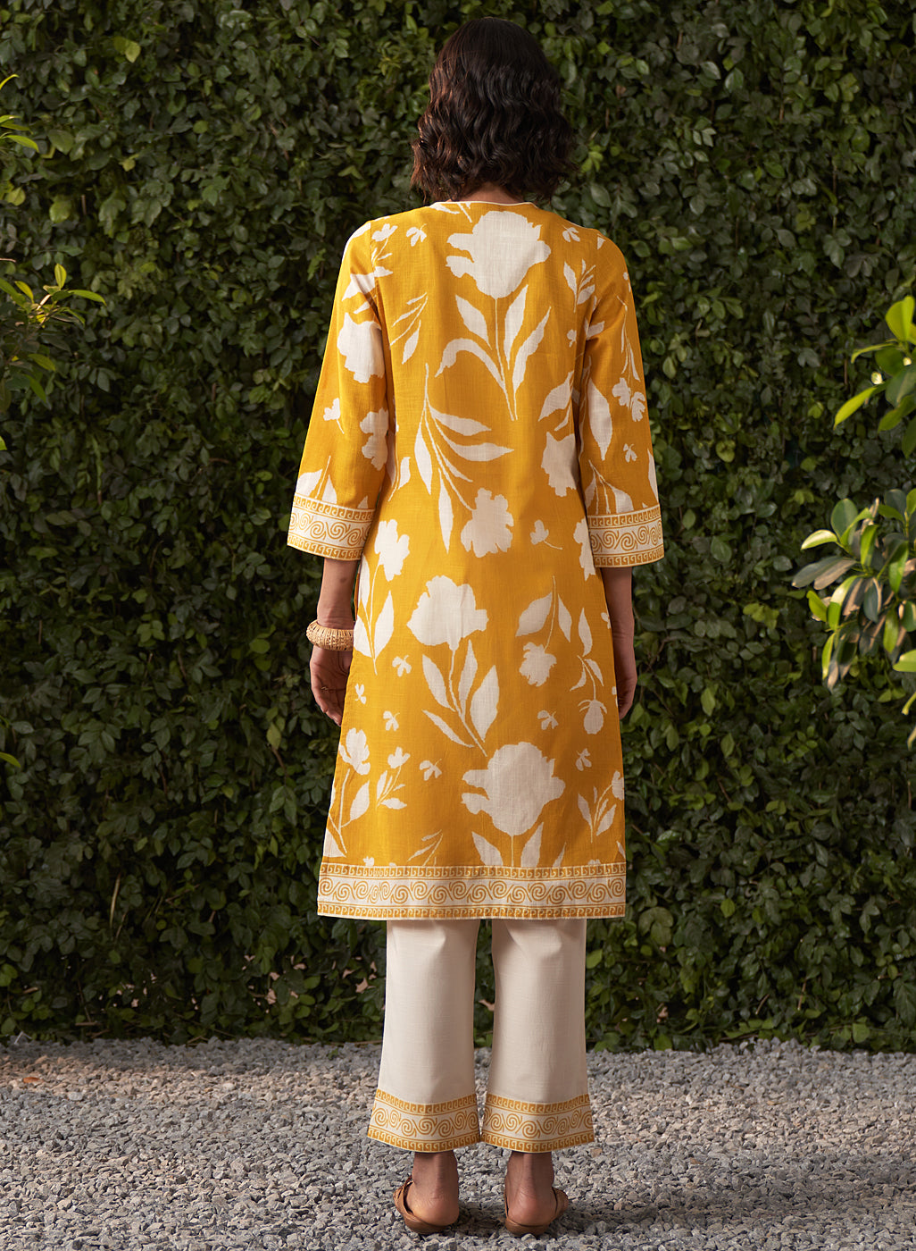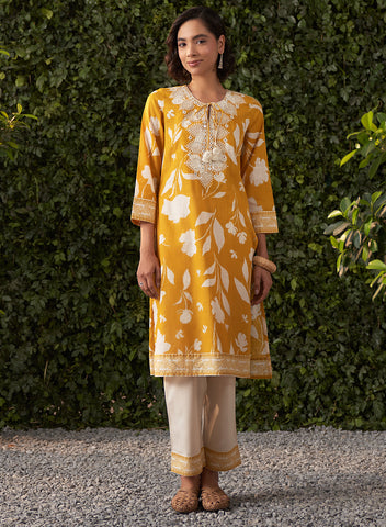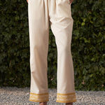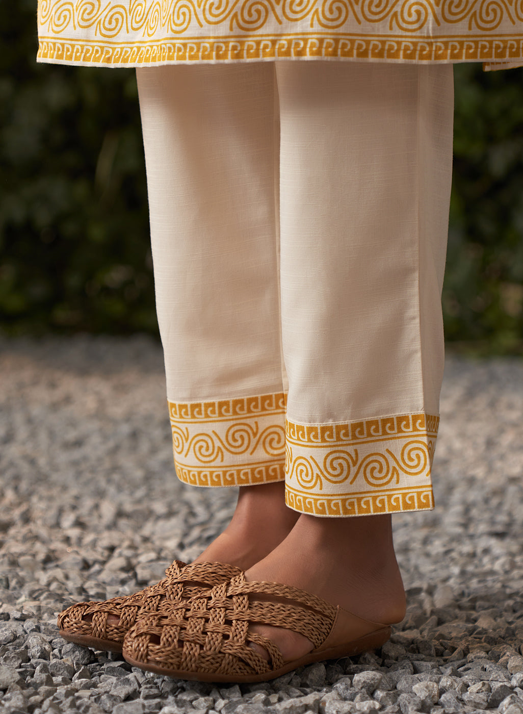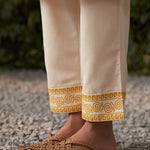 •The cream straight pants complement the kurta, finished with a matching printed border on the hem for a cohesive, polished look.