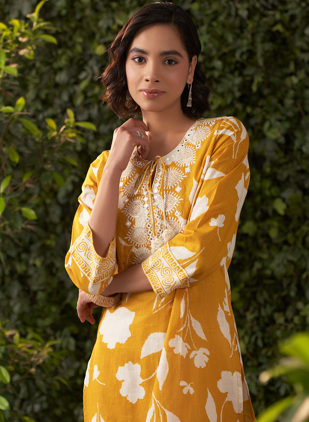 •The tie-up neckline is adorned with thread tassels and delicate pearls. The cuffs and hem are framed with a striking printed border that brings depth and character to the design.