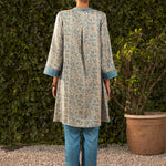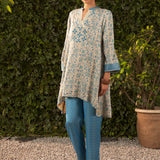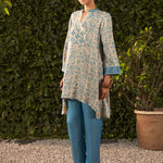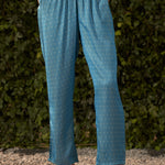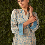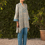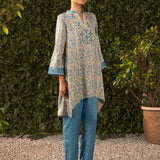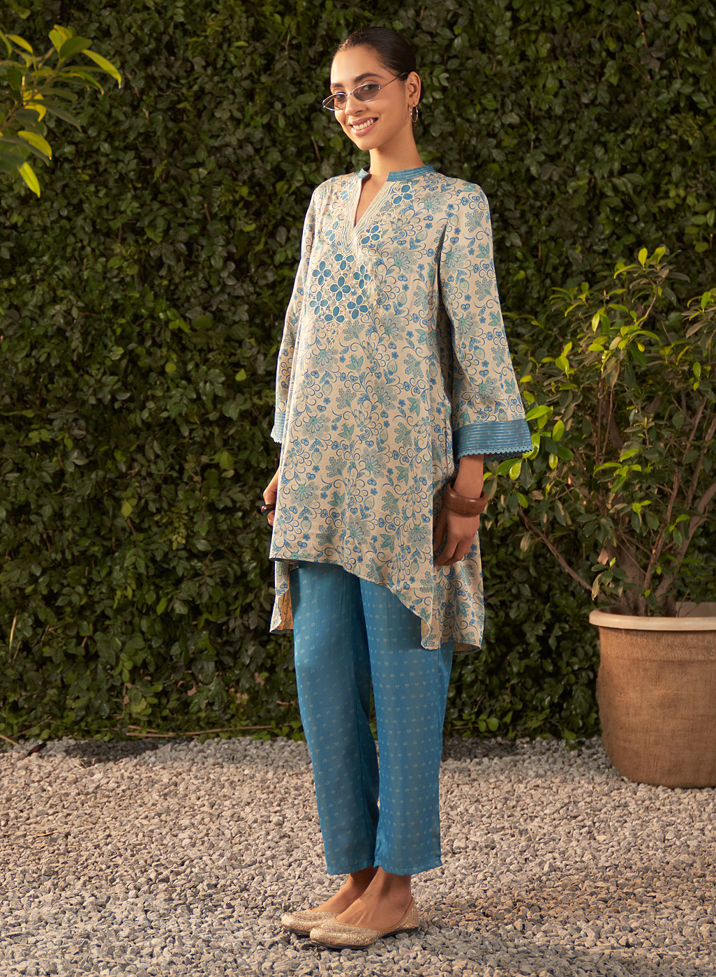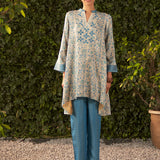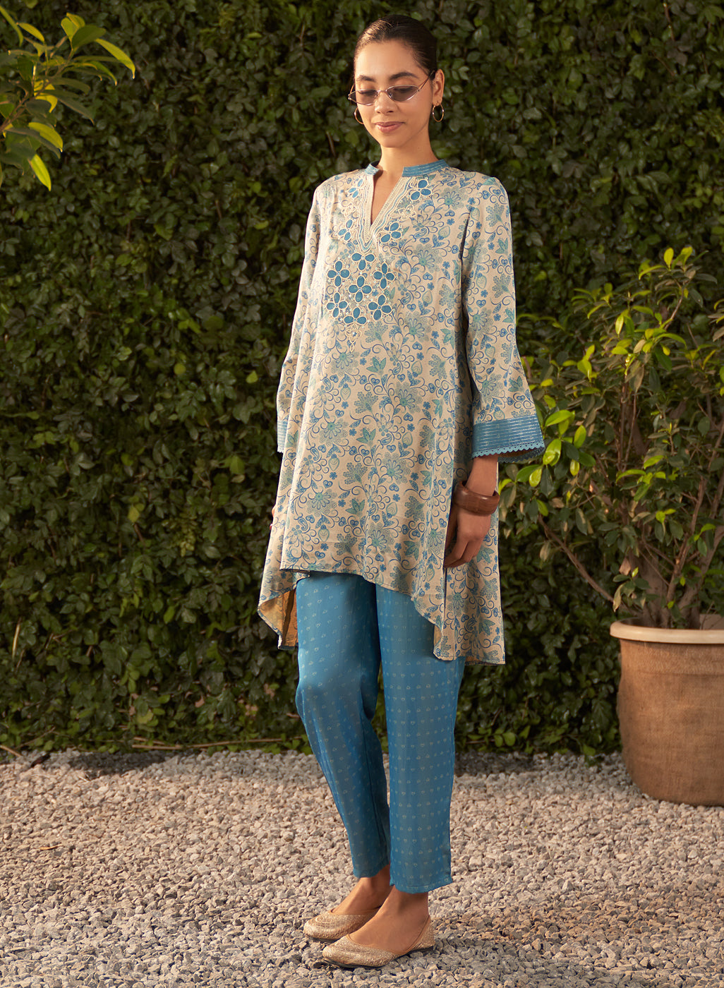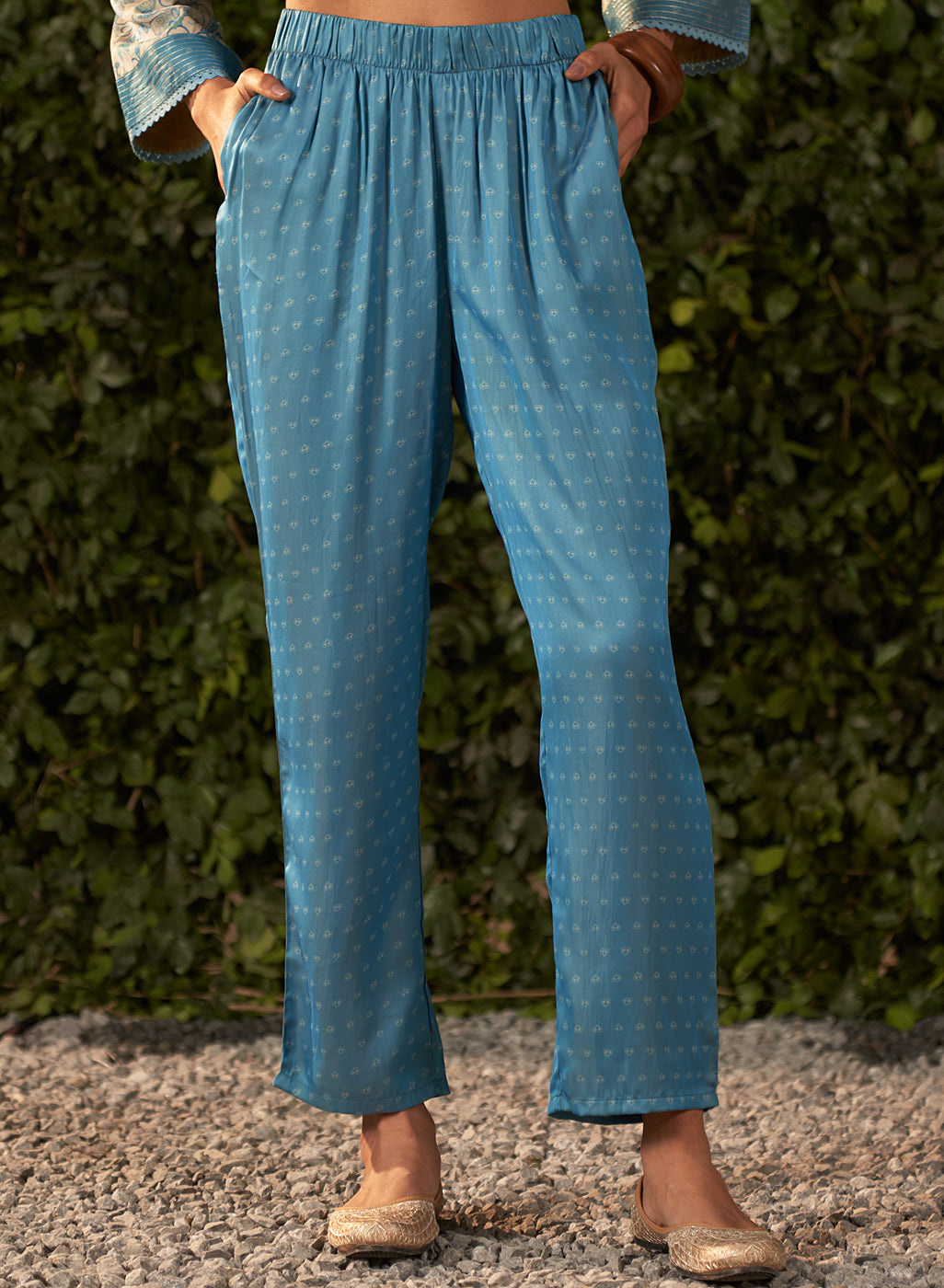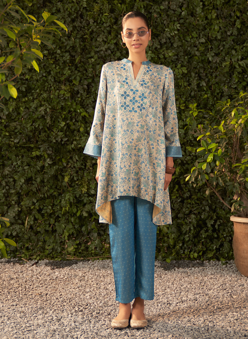 A woman wearing a sky blue printed satin co-ord set with intricate embroidery and broad cuffs, paired with matching pants.