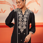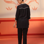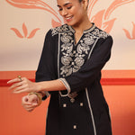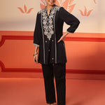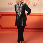 Woman wearing Kashaf Crimson Black Embroidered Crinkled Crepe Long Top pairing with black embroidered pants