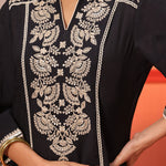 •With a mandarin collar and 3/4th sleeves, this top exudes grace and refinement, accentuating your silhouette with understated elegance.
