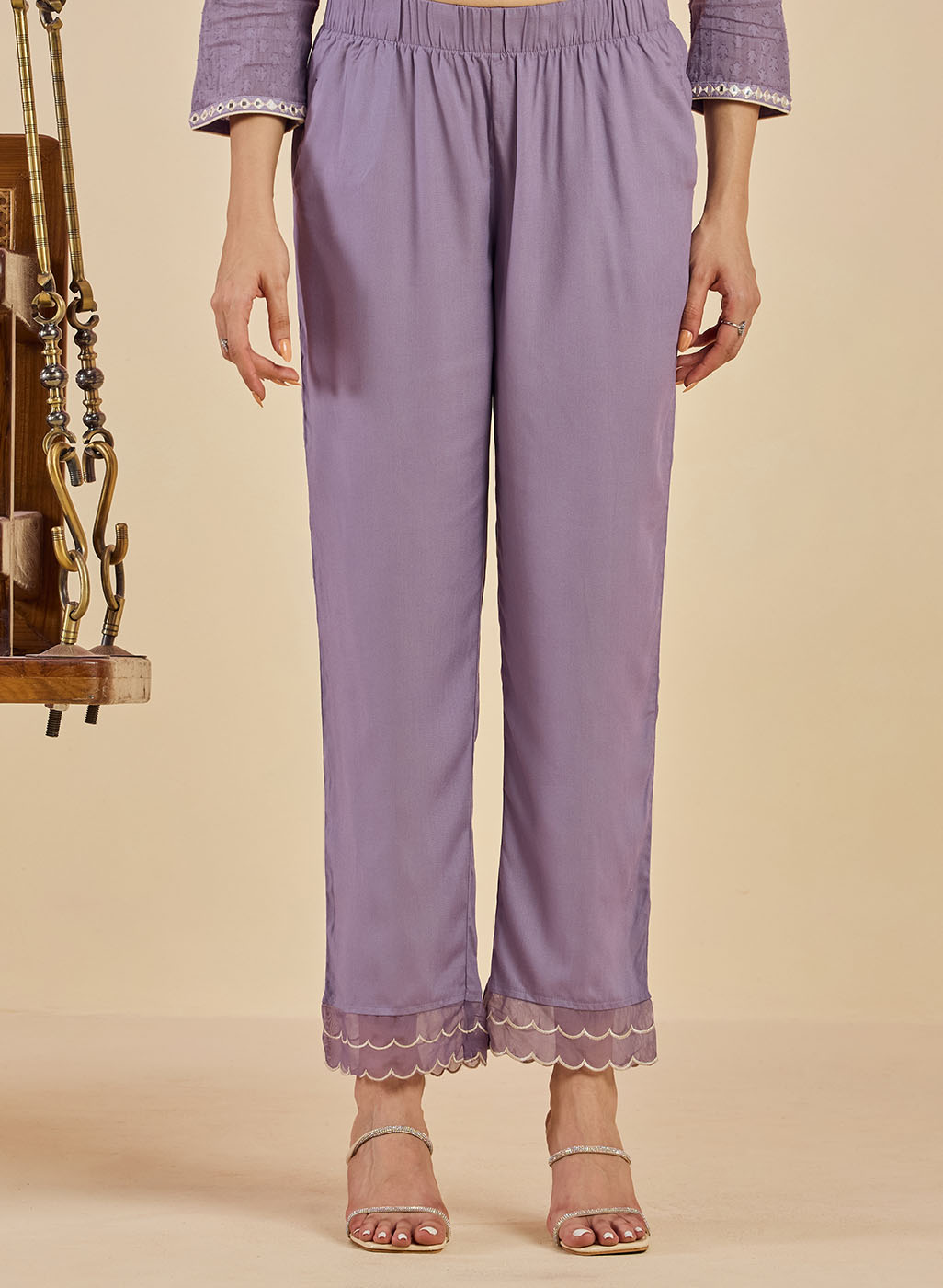 • Mid-rise elastic waist straight pants with scalloped cuffs, edged with zari.