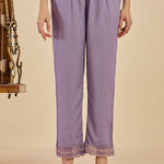 This serene purple cotton jacquard kurta is a perfect example of how less can be so much more. The solid flared kurta lets the fabric’s natural texture shine, while the neckline, sleeve cuffs, and back keyhole are brought to life with intricate mirrorwork that catches the light with every move. The contrast piping and lace detail on the hem add just the right finishing touch. Pair it with the matching straight bottoms with scalloped cuffs, edged with zariwork, making this outfit understated yet festive.
