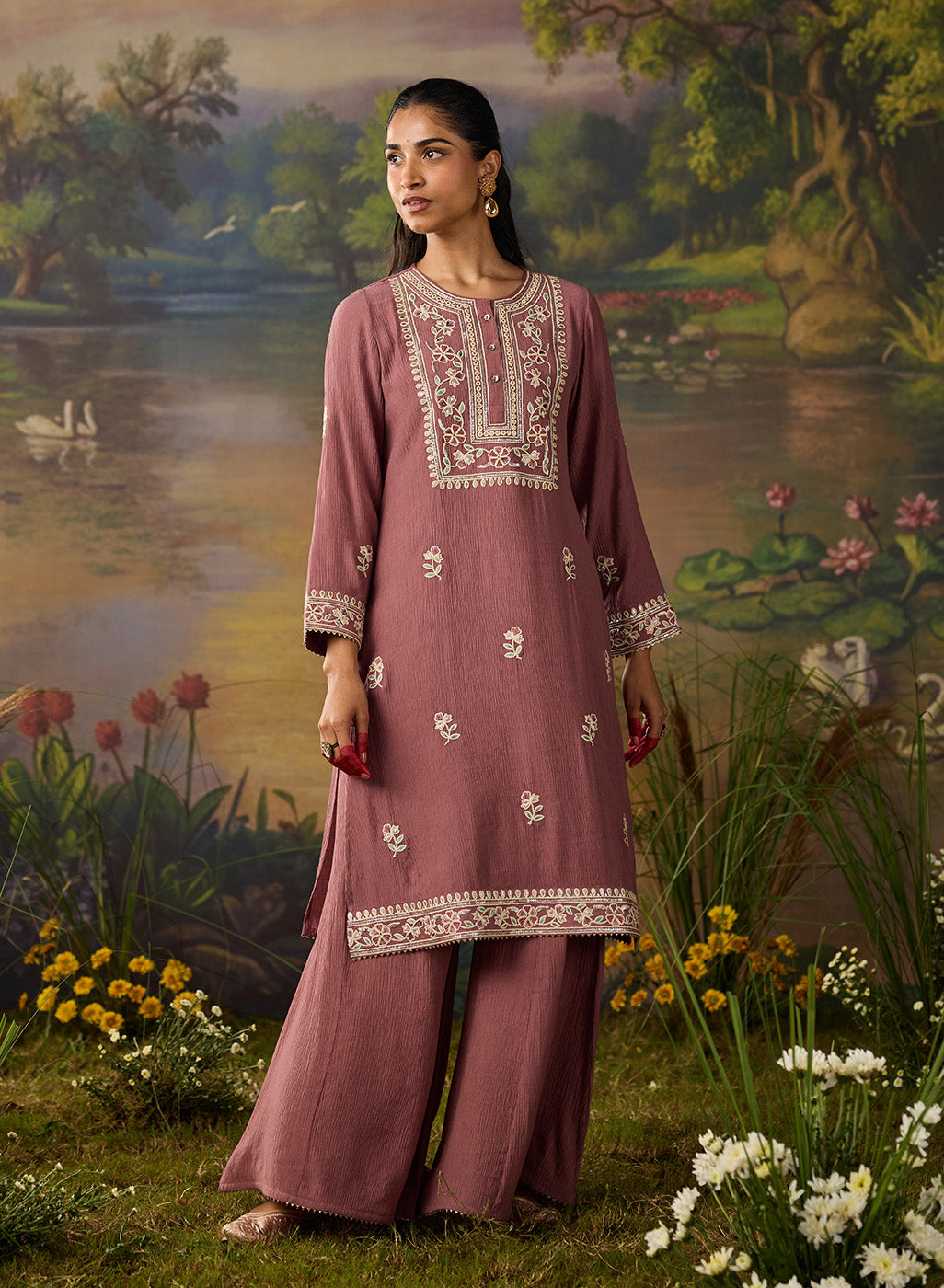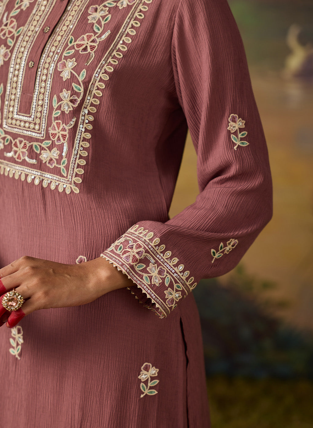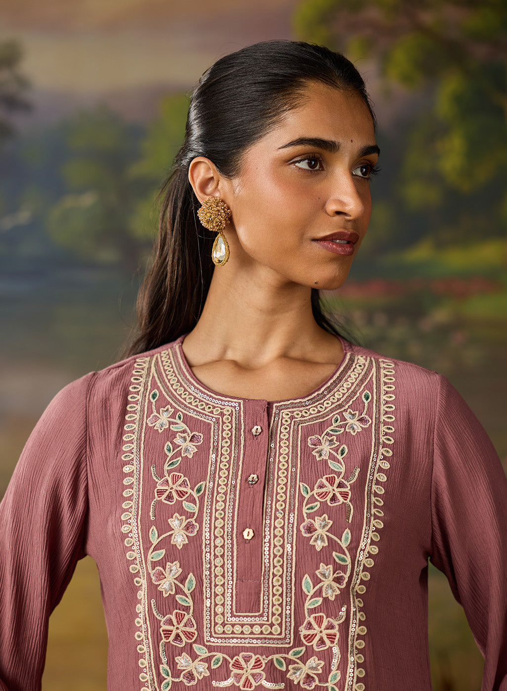 Delicate and enchanting, this lilac kurta set with dupatta is made for moments when you want to look effortlessly graceful. Crafted in a soft, fabric with a subtle crinkle texture, the straight kurta takes on a dreamy vibe with dori and resham thread embroidery, highlighted with zari and sequins for a festive shimmer. The embroidery traces the neckline, sleeve hems, centre back, and kurta hem, while flower-shaped golden metal buttons along the placket add a touch of vintage charm.